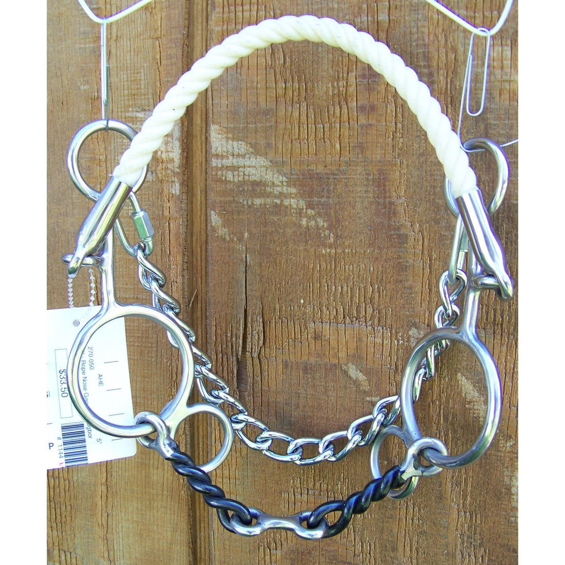 Rope Noseband Combination features a 5" twisted sweet iron stainless steel dog bone mouth piece...