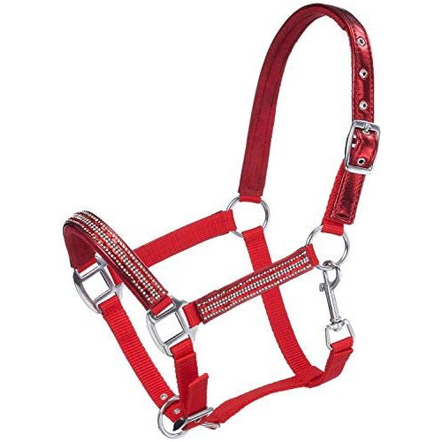 Fully adjustable nylon halter with brushed nickel hardware. Foil and crystal overlay on cheeks and...