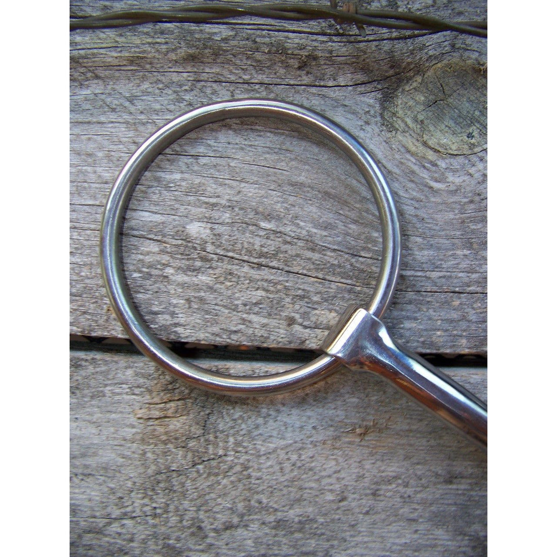 Stainless steel ring bit with 5 1/4" polished sweet iron snaffle mouth and copper inlay....