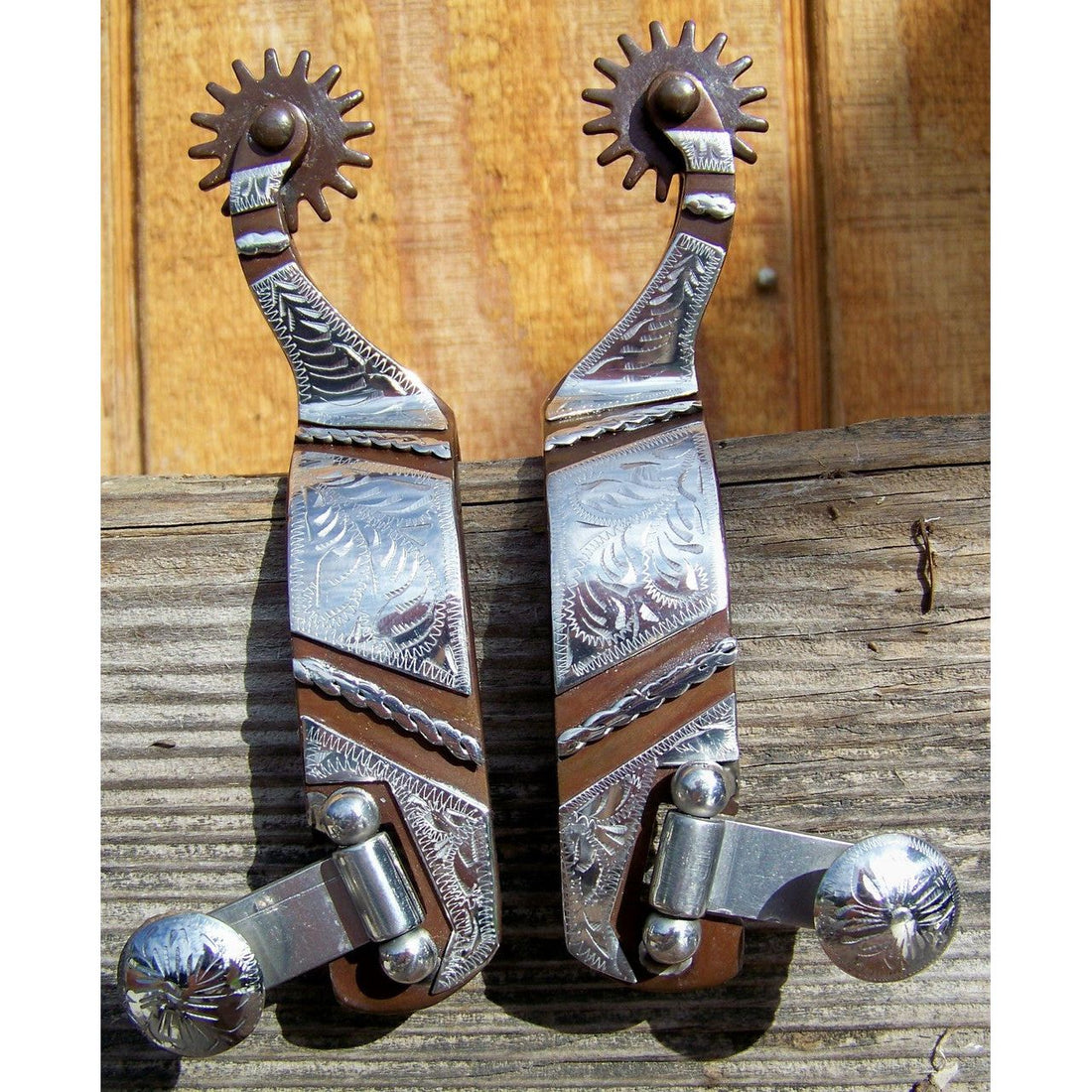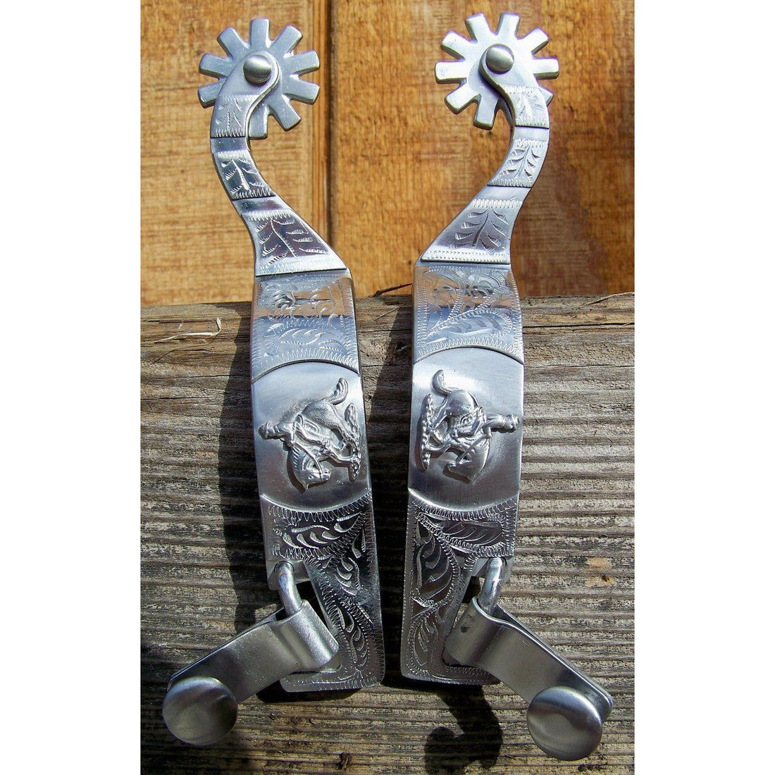 Stainless steel brushed western pleasure show spur with horse motif and engraved silver. 1" band...