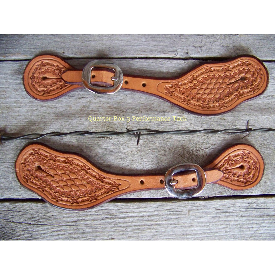 NaturalLadies basket weave stamped spur straps feature barb wire trim tooling. Spur straps have stainless...