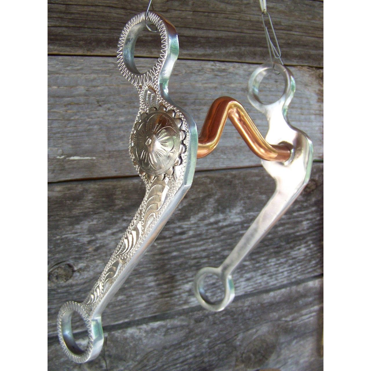 Aluminum grazing bit - 5" medium port copper mouth. 8 1/4" engraved aluminum cheeks with engraved silver conchos.