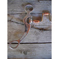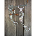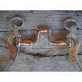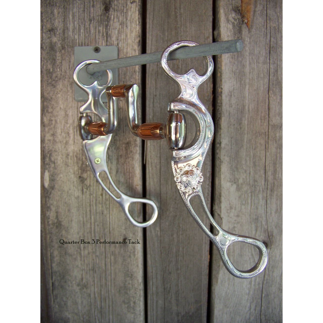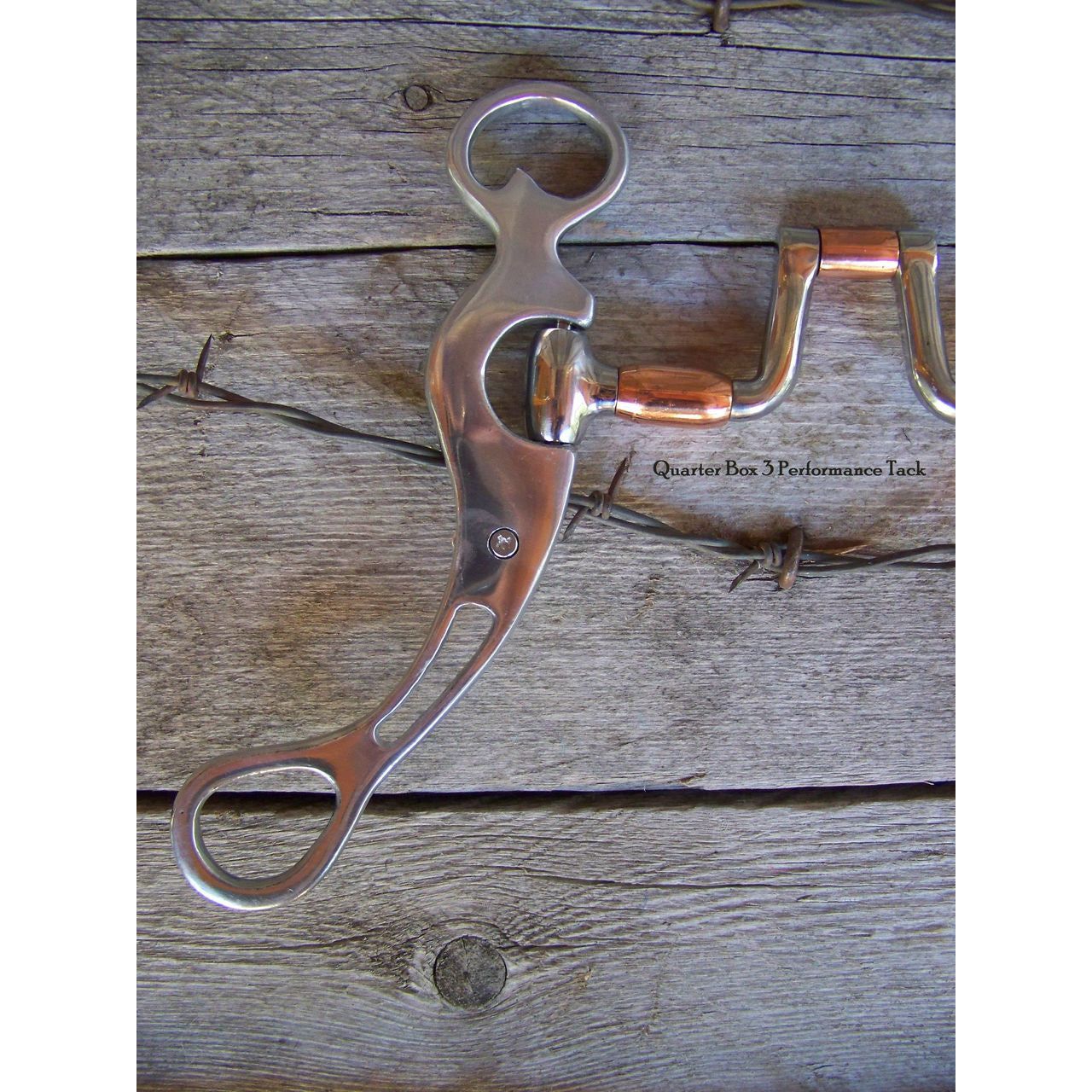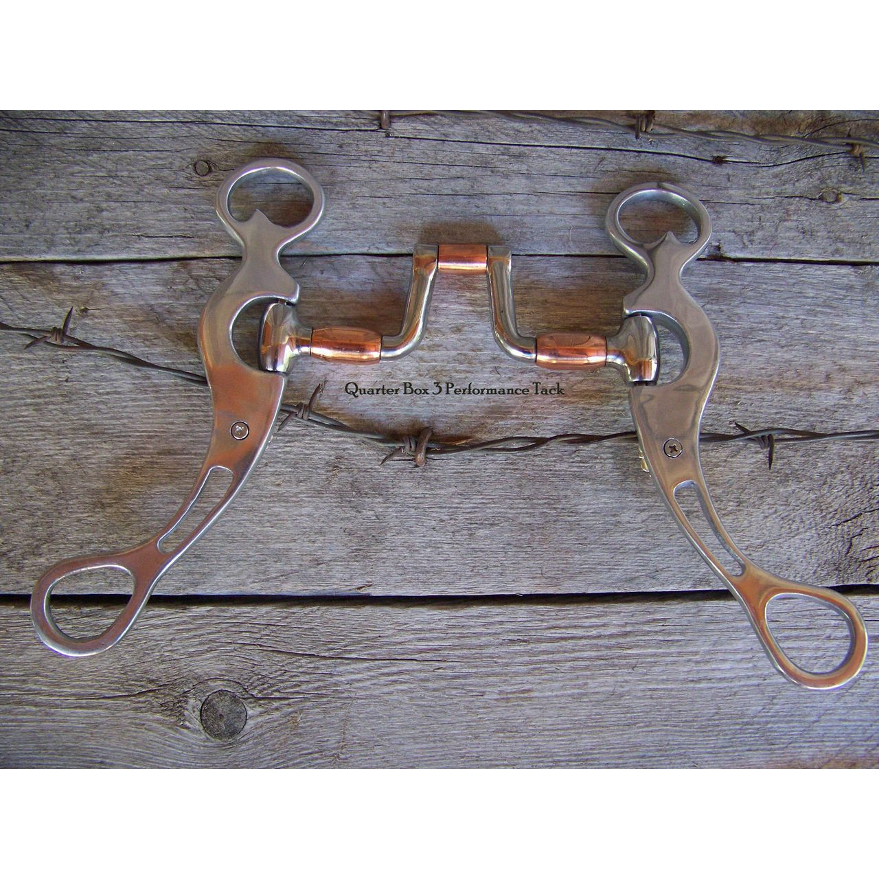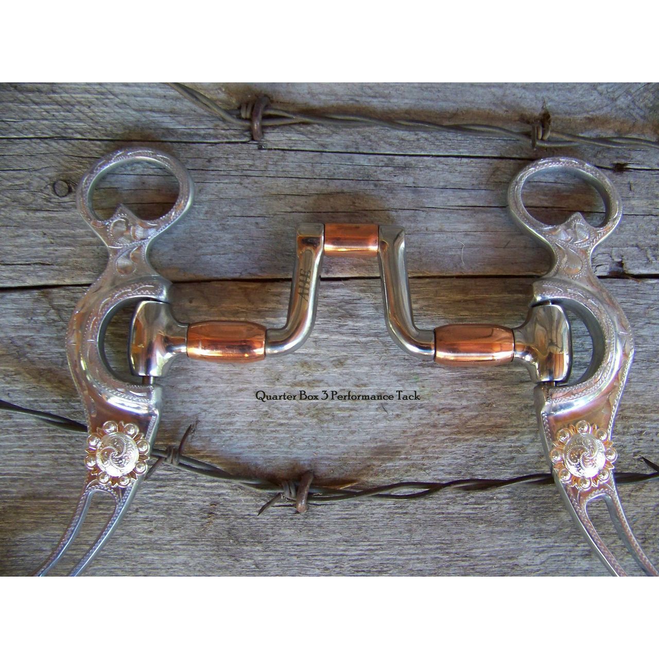 Aluminum training bit with 5 1/8" stainless steel hinged port mouth with copper barrels and copper roller. Cheeks are loose and measure 8 3/4" with engraved German Silver conchos.