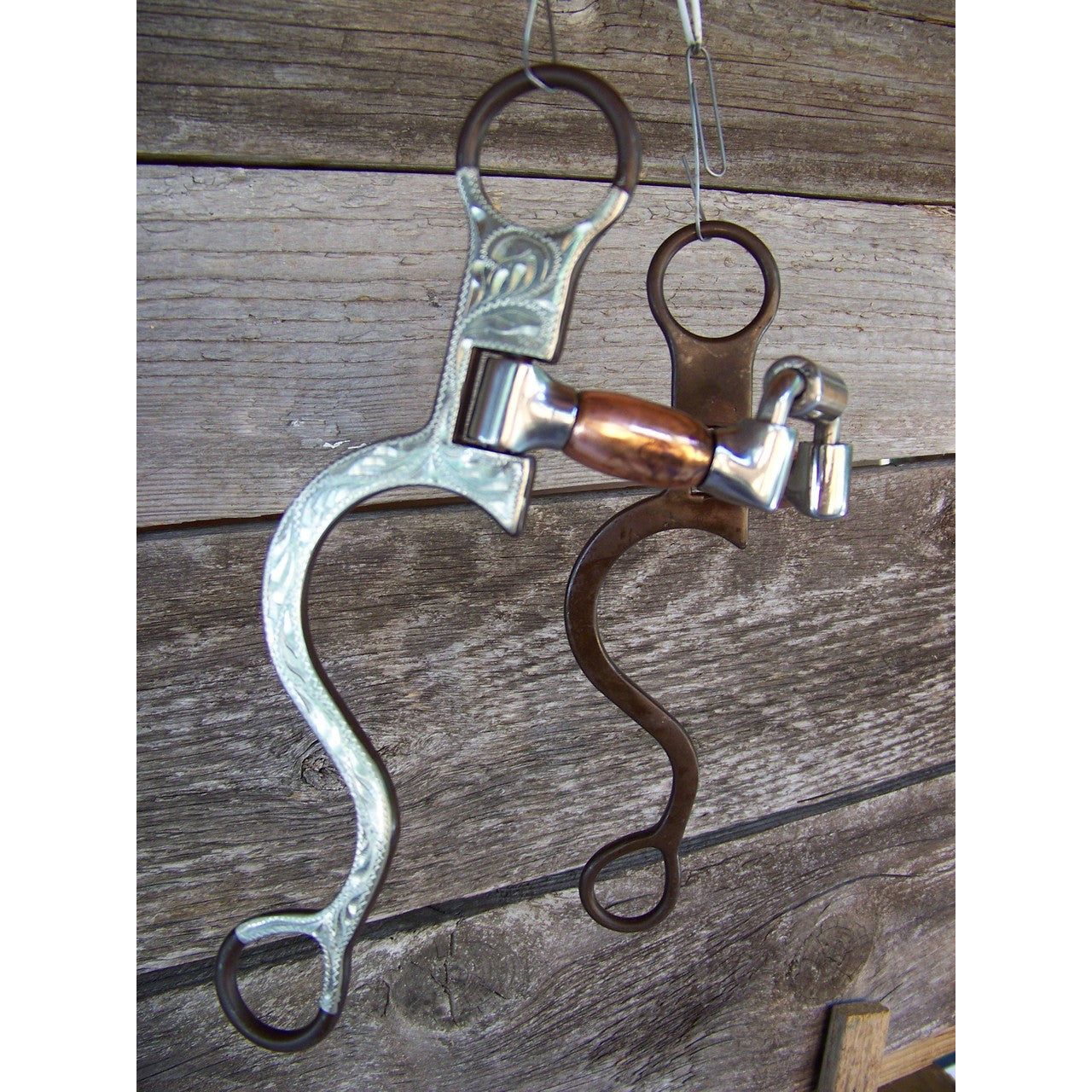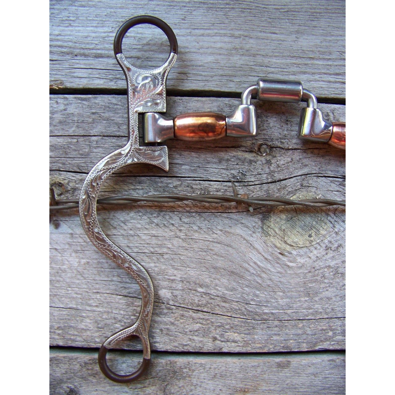 Antique brown show bit with 5" stainless steel articulated mouth with roller on top of articulation and copper rollers on bars. German silver engraved loose cheeks.