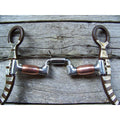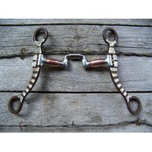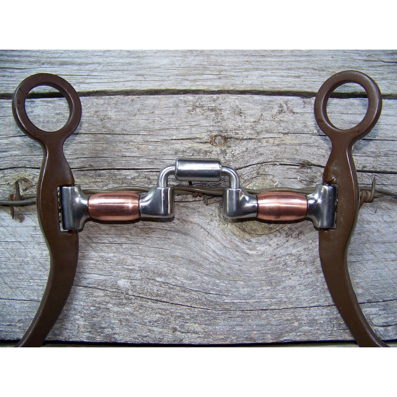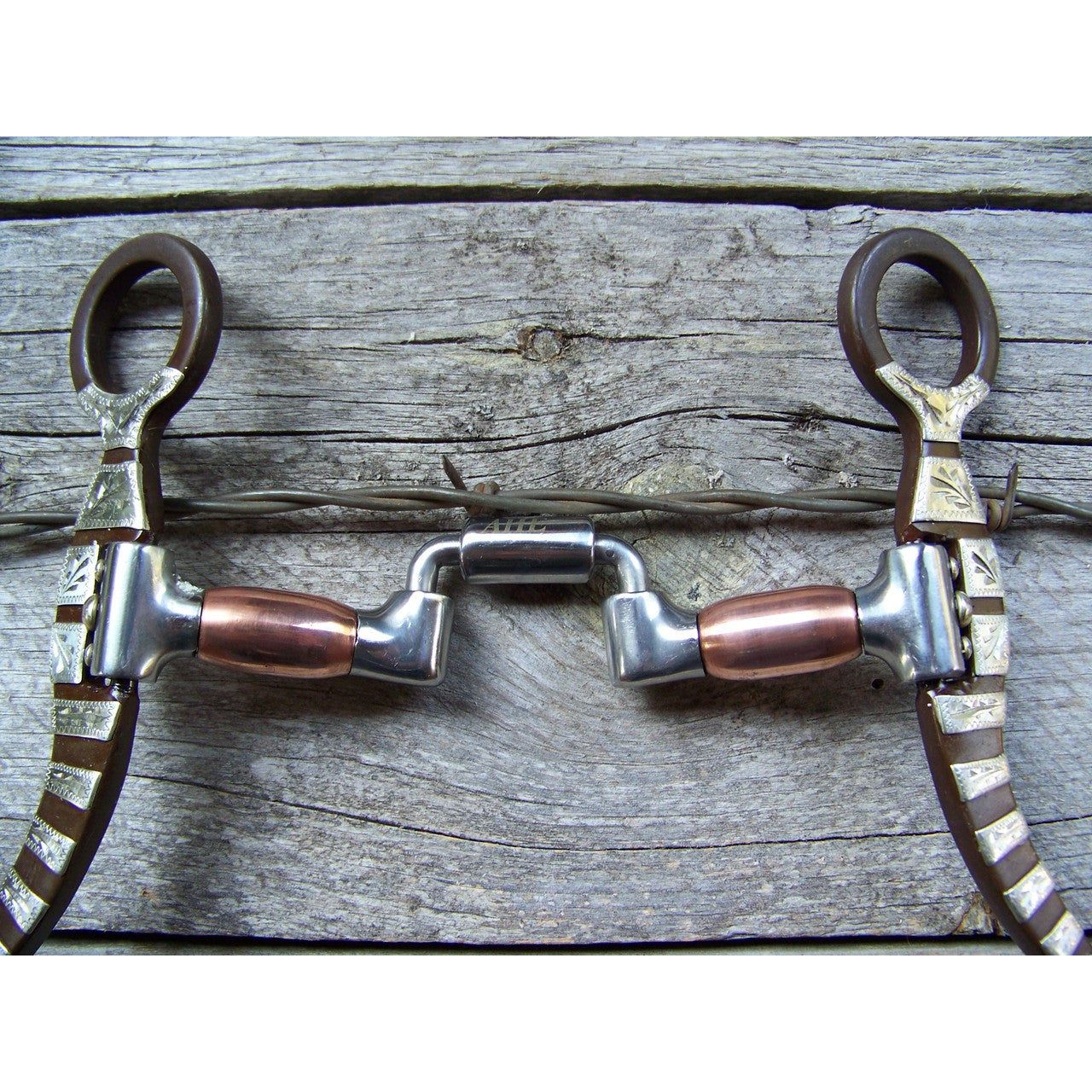 Antique brown bit with hinged correction (articulated mouth) with stainless steel roller on articulation and copper rollers on bars.