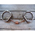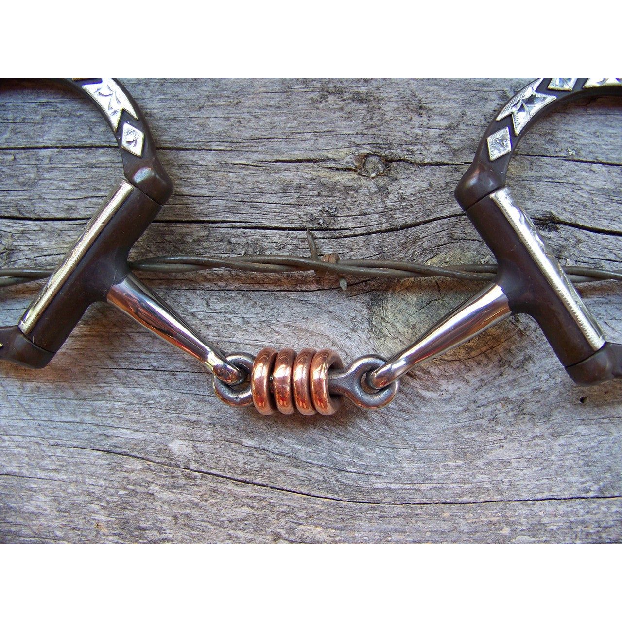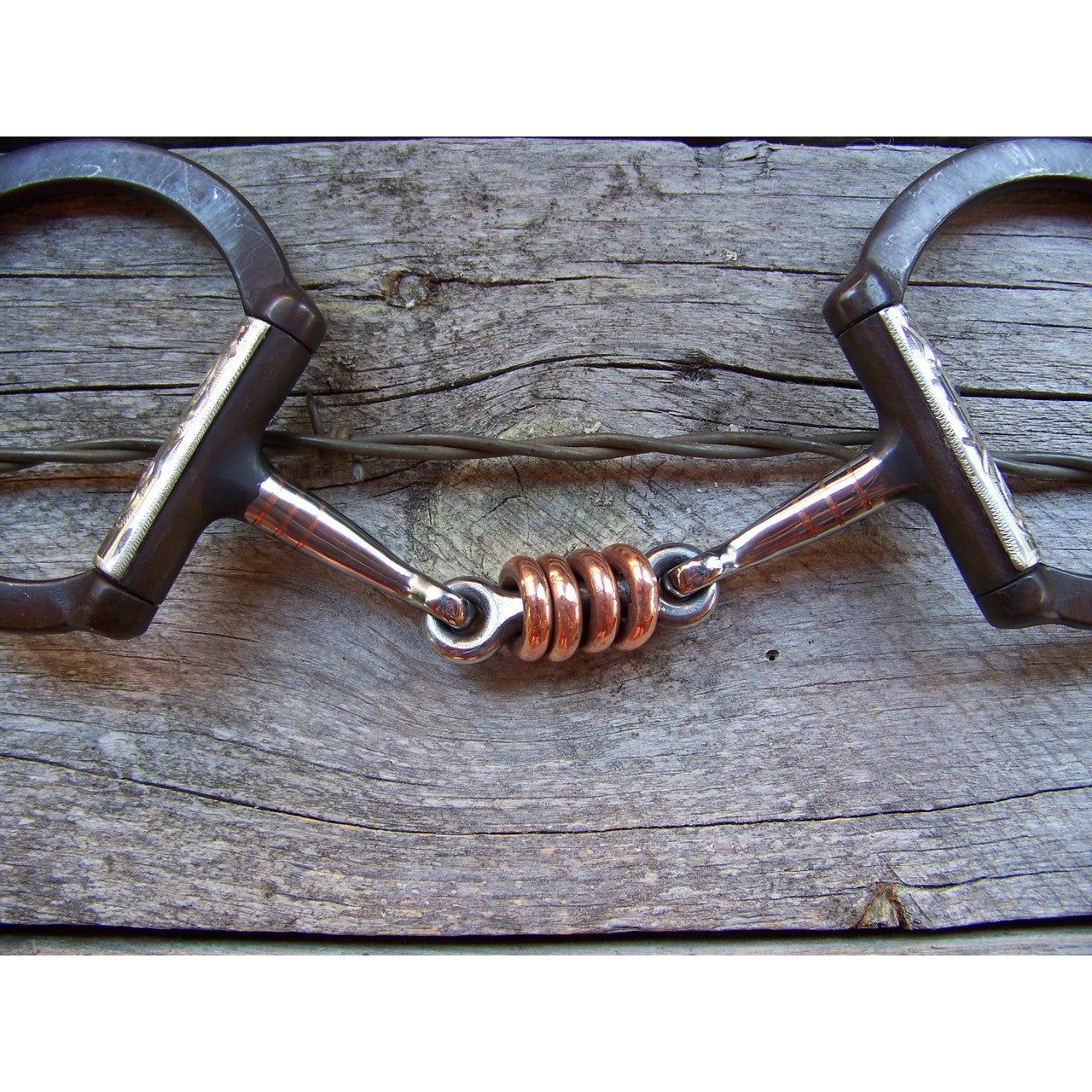 Antique brown dee bit with dog bone mouth and copper rollers.
