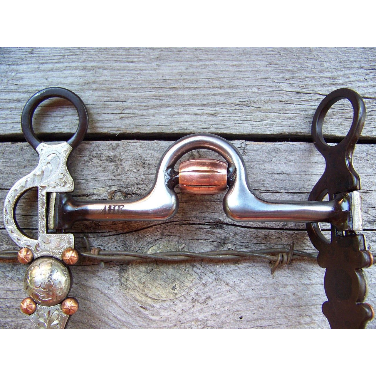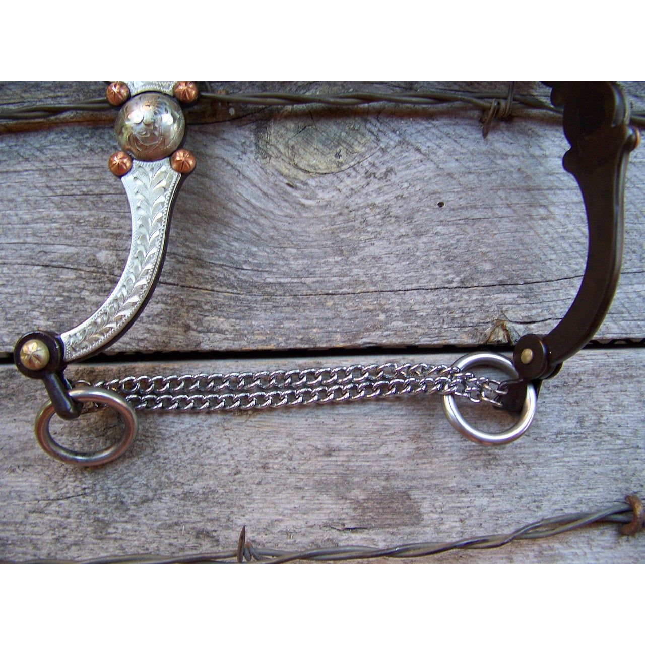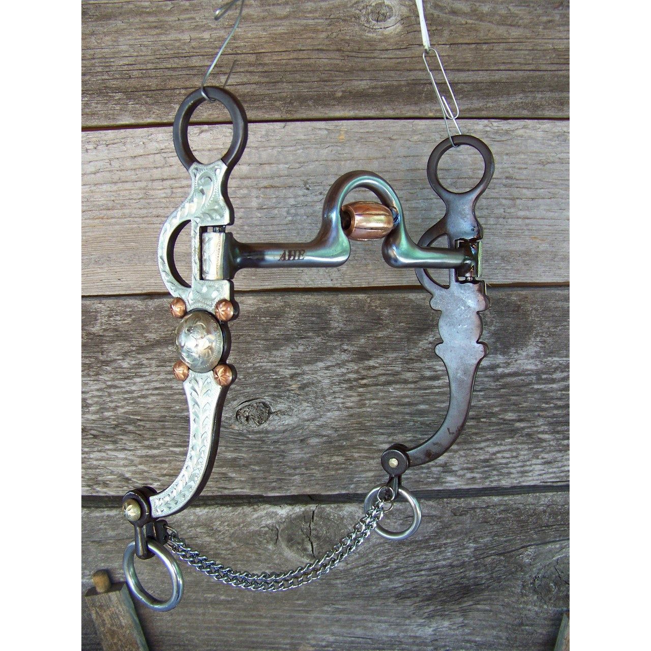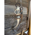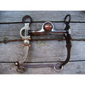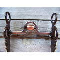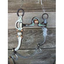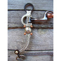 Antique brown bit with 5" high port mouth with copper inlay and copper roller. 7 3/16" cheek with german silver trim and slobber chain.