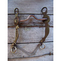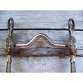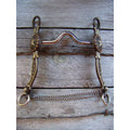 Antique brown bit with 5 1/4" medium port mouth with copper inlay. 7 3/16" cheek with german silver trim and dots. Slobber chains.