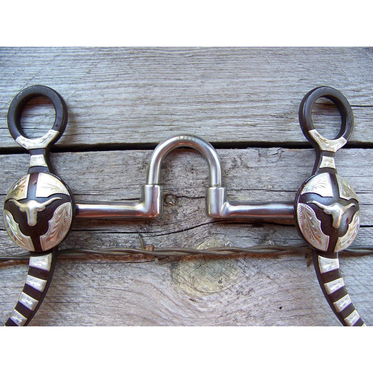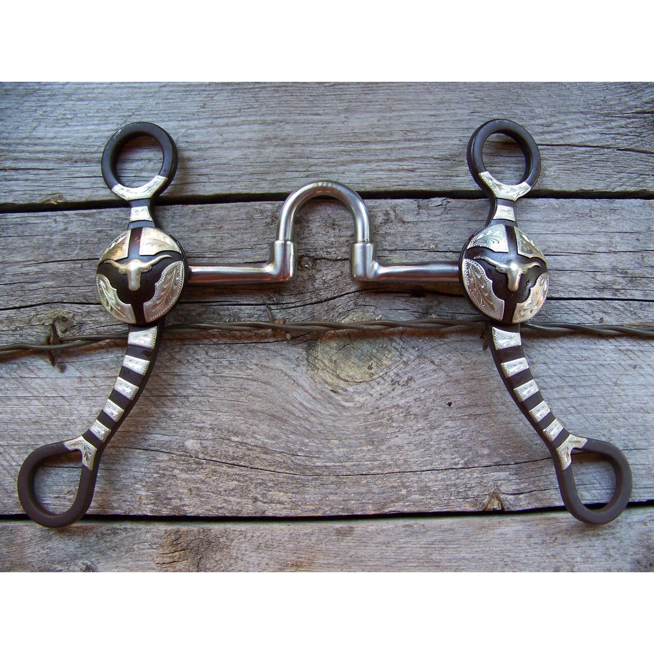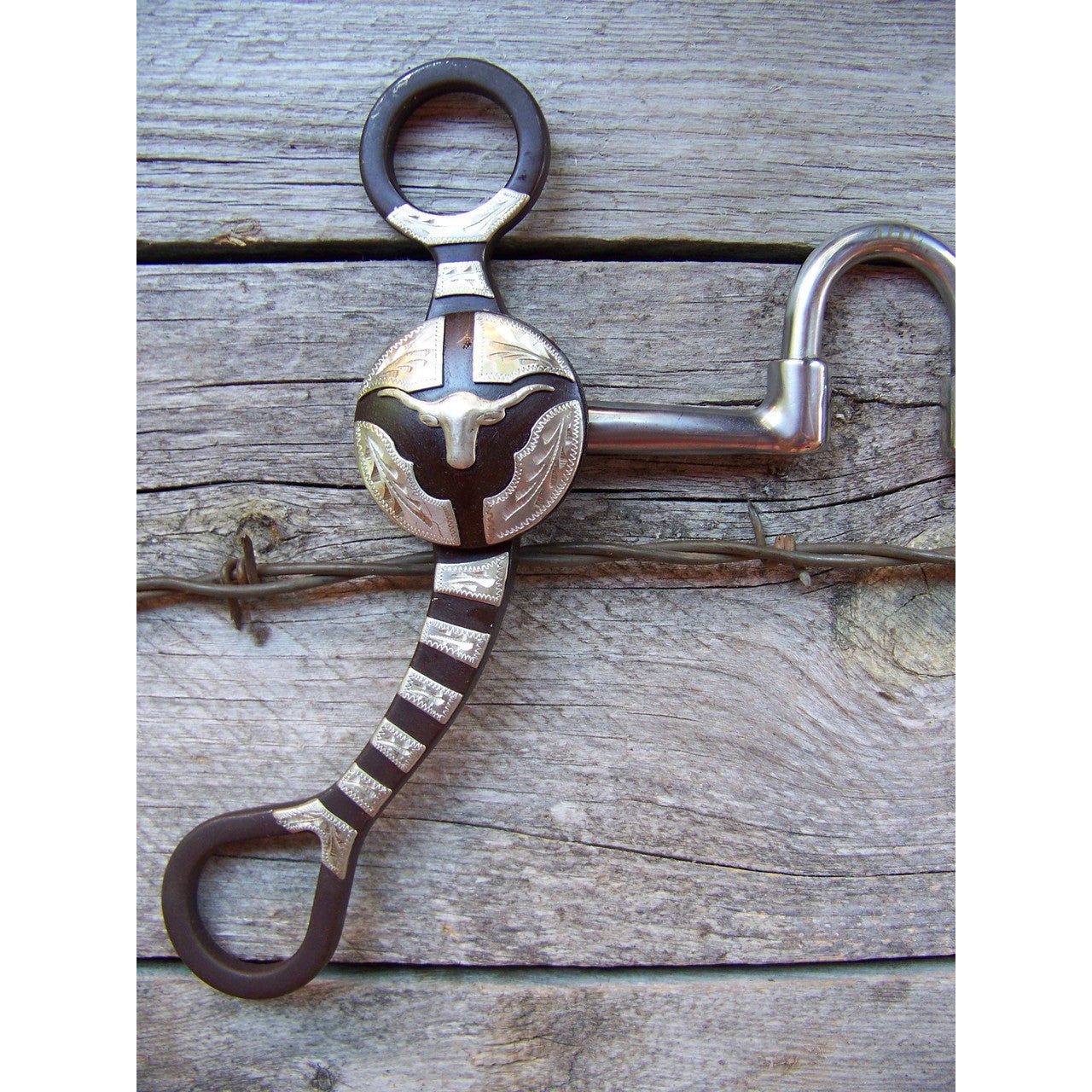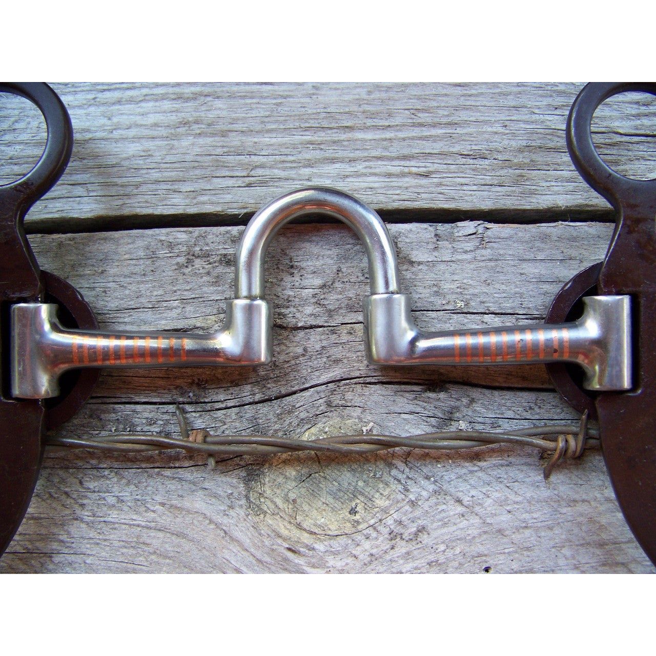 Antique brown bit with 5 1/4" correction mouth with copper inlay. 7 1/2" cheek with german silver trim.