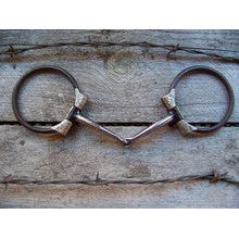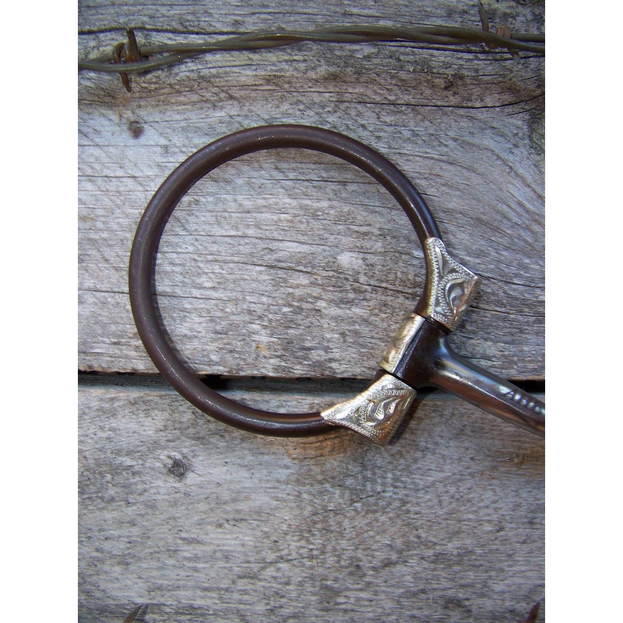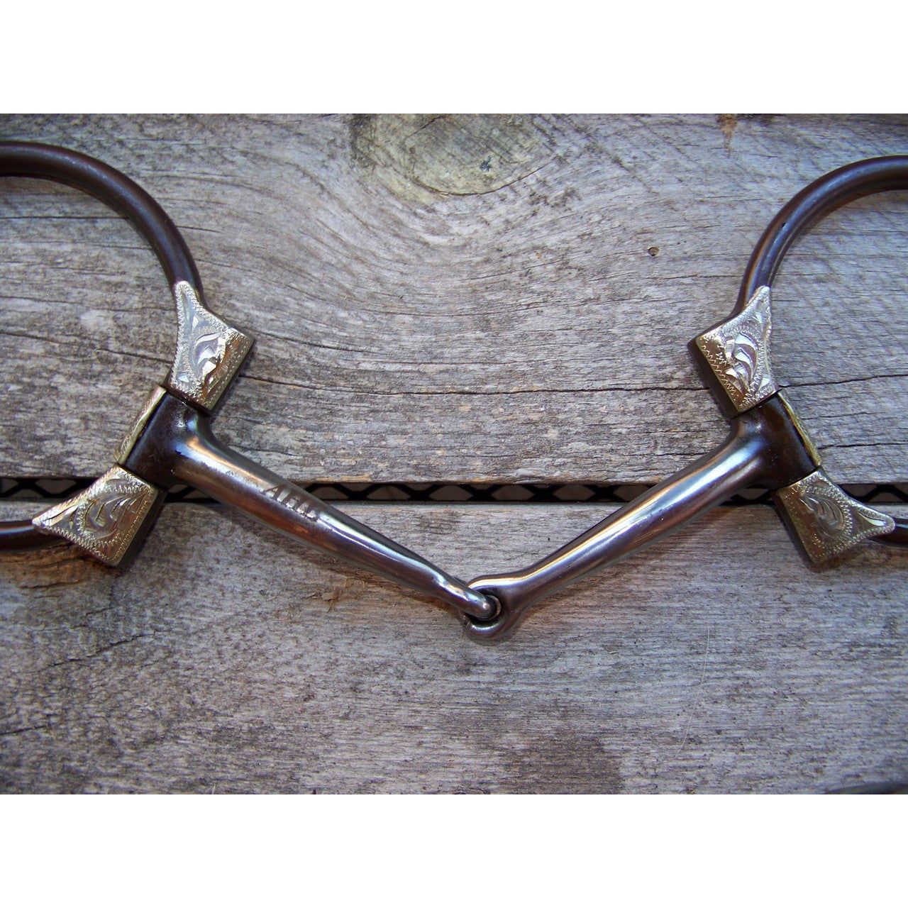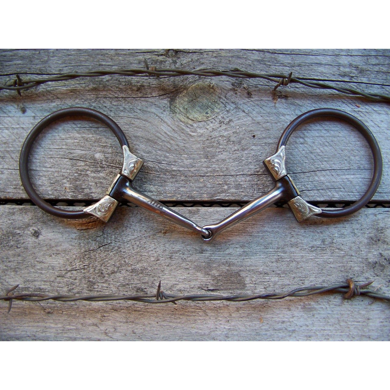 Antique brown dee bit, 5" snaffle mouth with copper inlay. 3" diameter rings with german silver engraved trim.