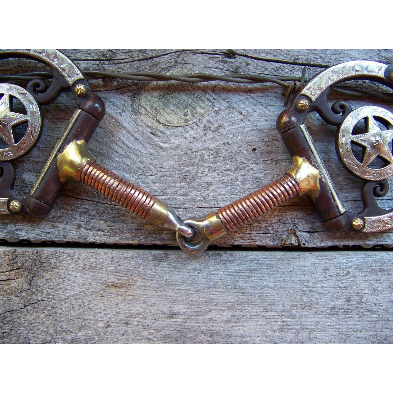 Antique brown dee bit with engraved german silver trim. Copper wire wrapped snaffle mouth.