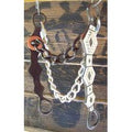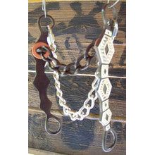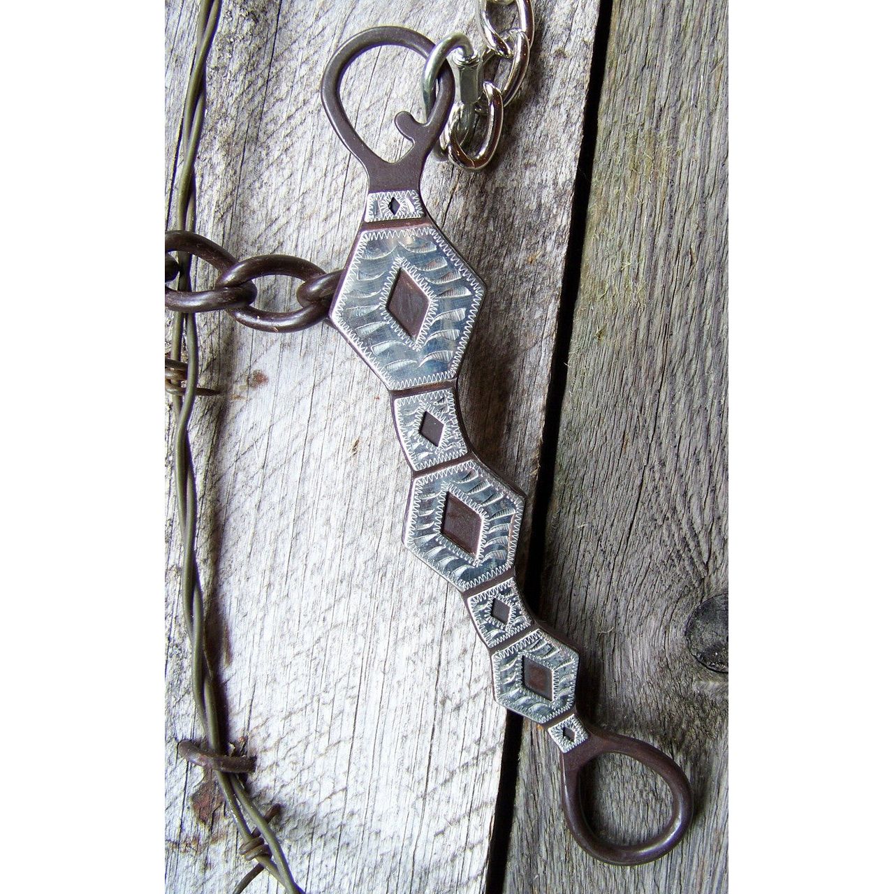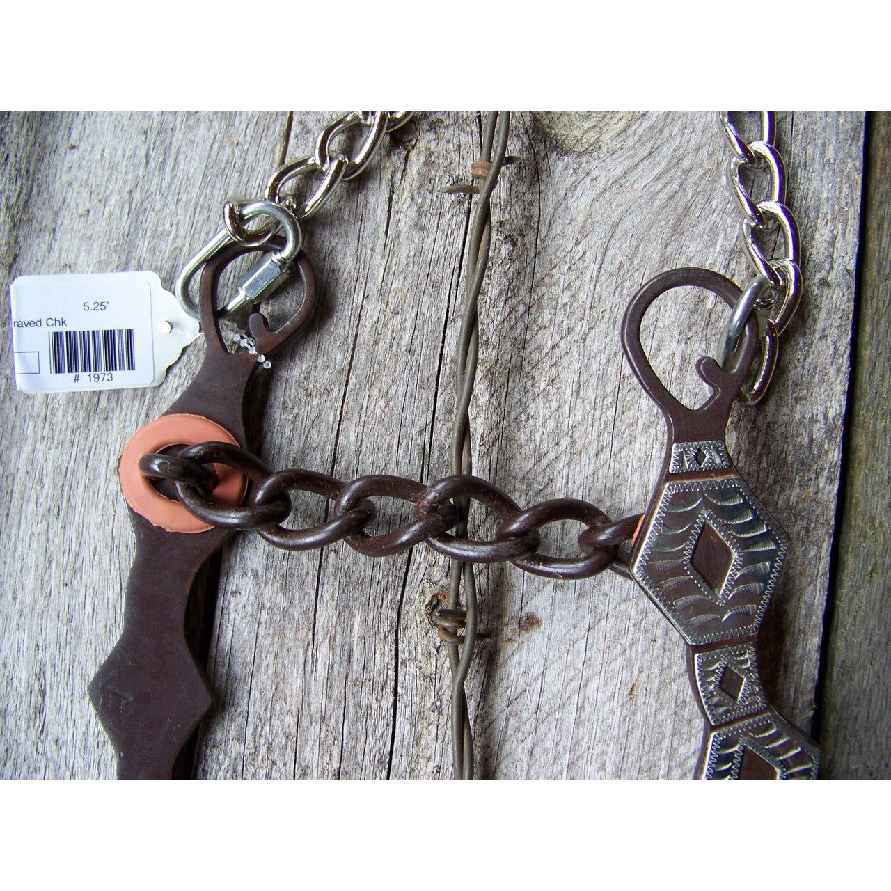 Antique brown bit with 5 1/4" to 5 1/2" chain mouth. Comes with rubber washers and curb chain with quick links. German silver engraved diamonds are on the cheek pieces. Cheeks measure 7 3/4".