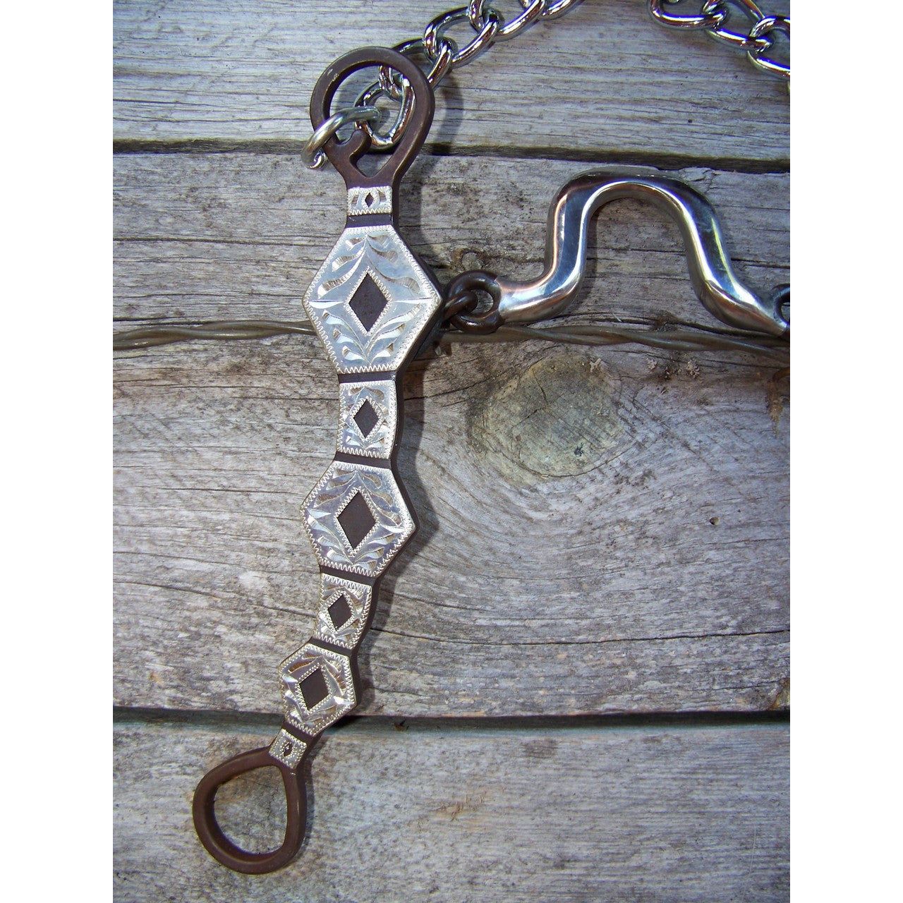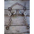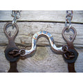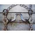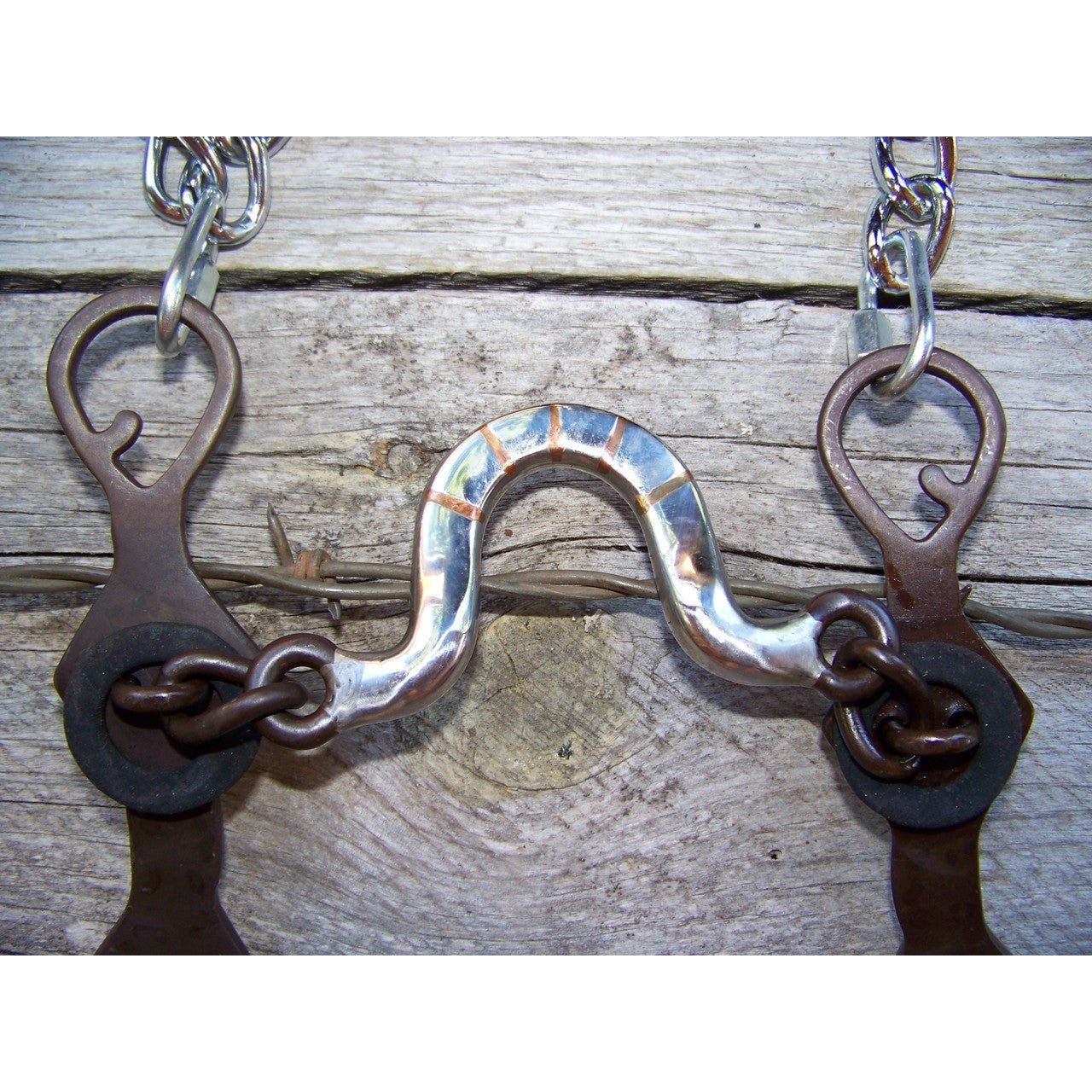 Antique brown bit with 5 1/2" wide mouth on a chain. Wide high port with copper inlay. Rubber washers on chain to protect the corners of the horse's mouth.