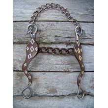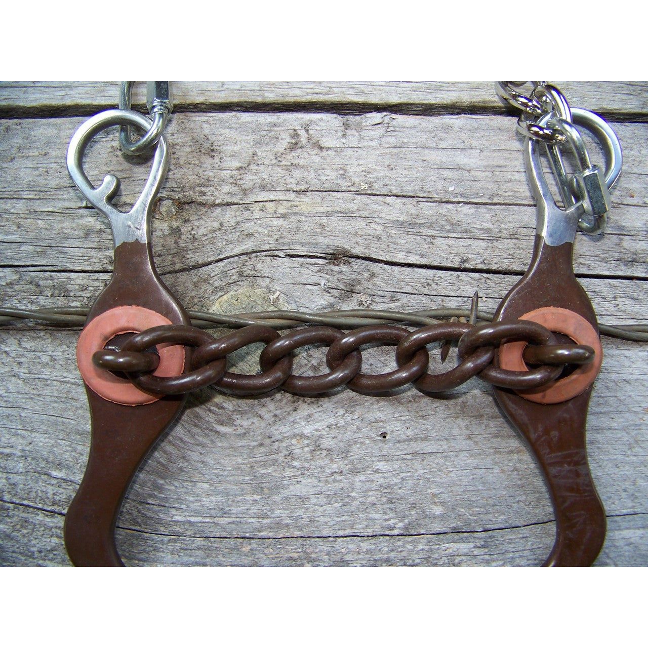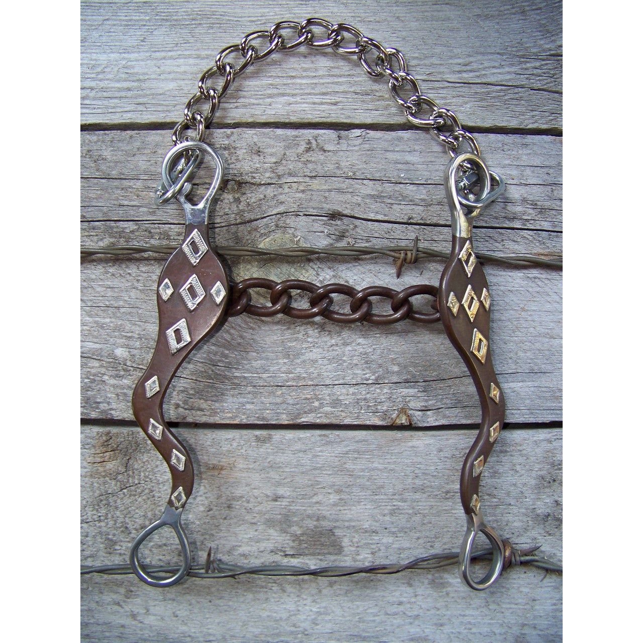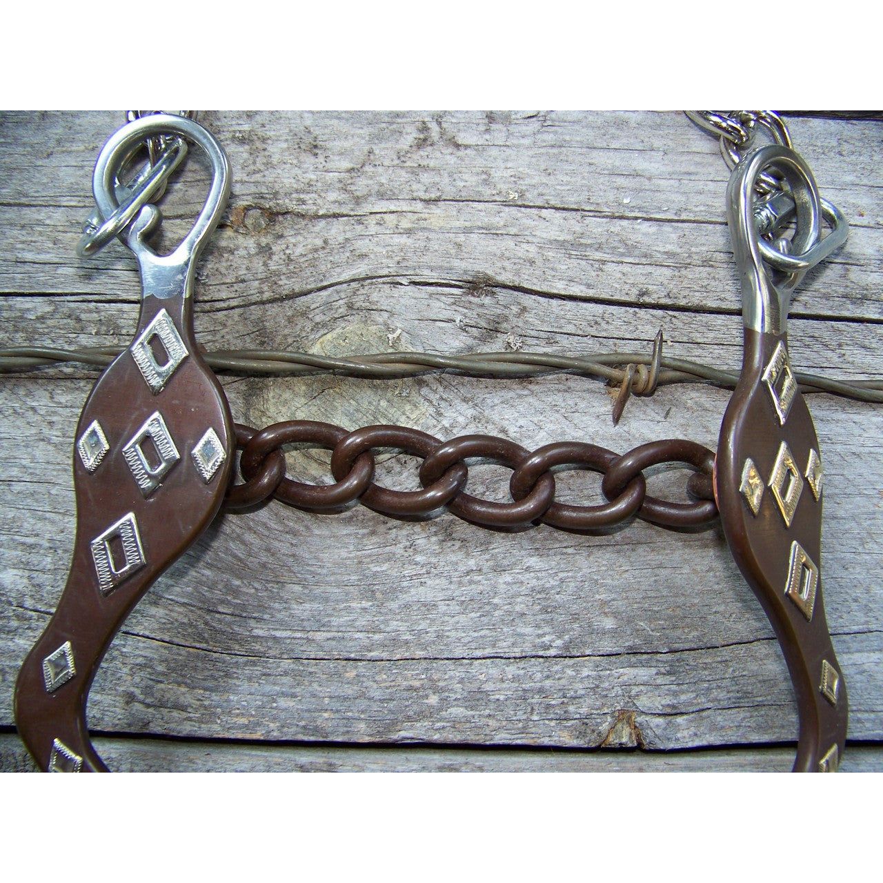 Antique brown roping bit with chain mouth and rubber washers. German silver diamonds on the shanks.