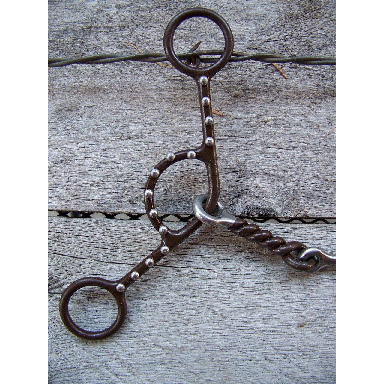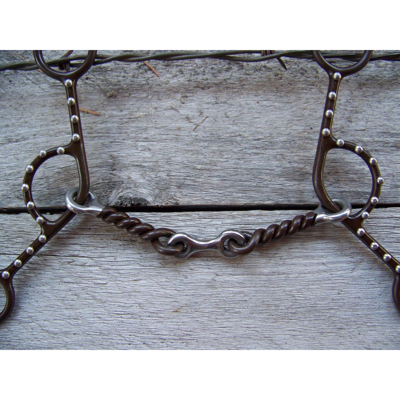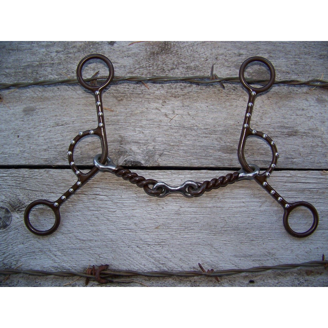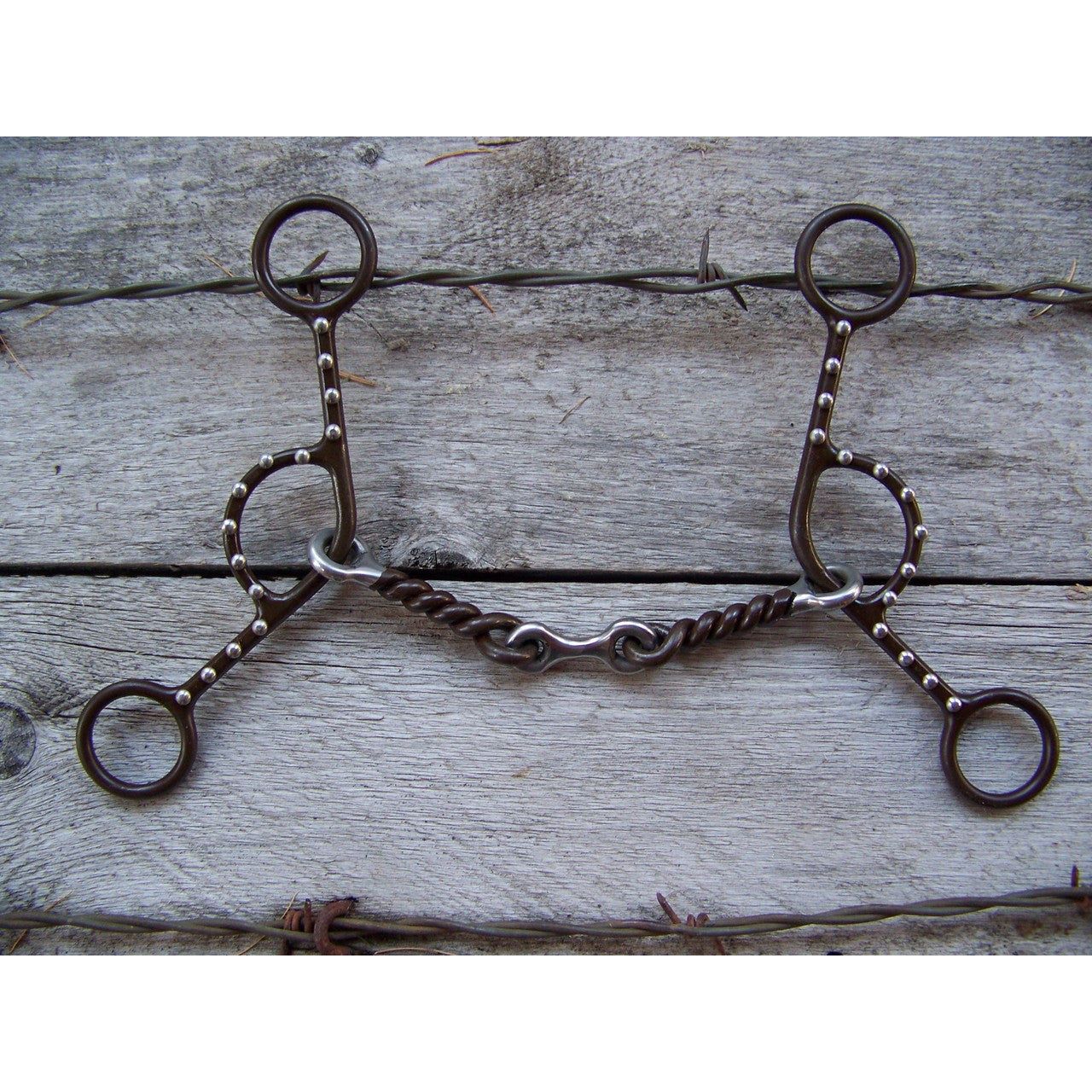 Antique brown short shank lifter bit. 5" dog bone mouth with sweet iron twisted wire bars. Stainless steel dog bone. 6 3/4" cheeks with stainless steel dots.