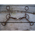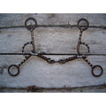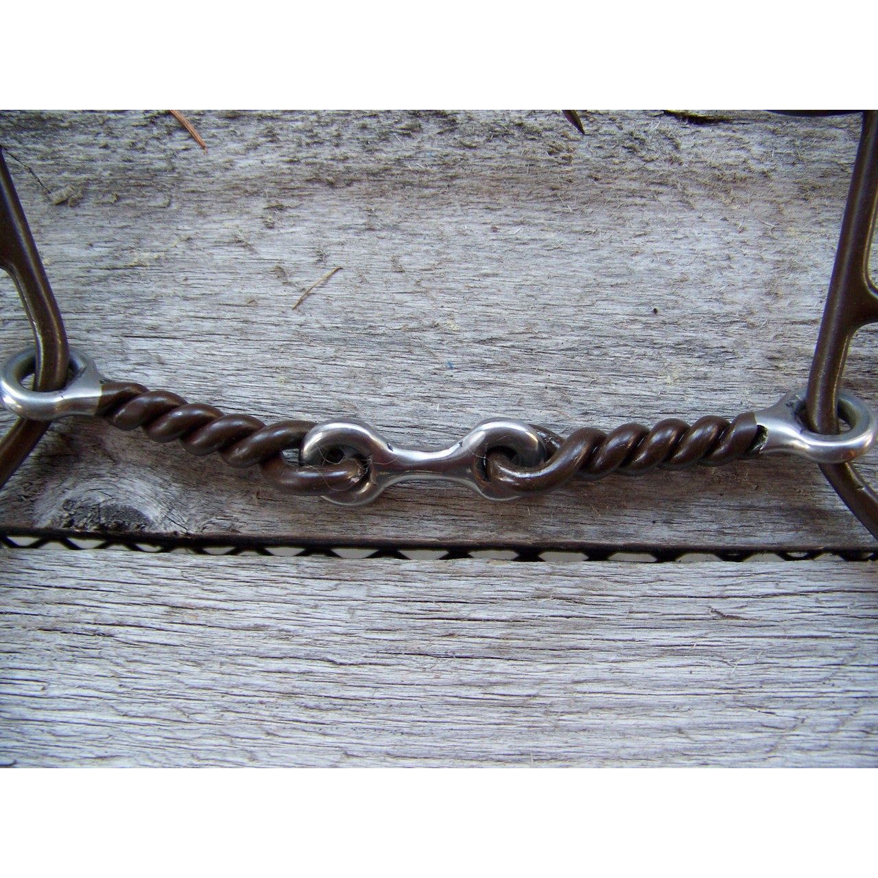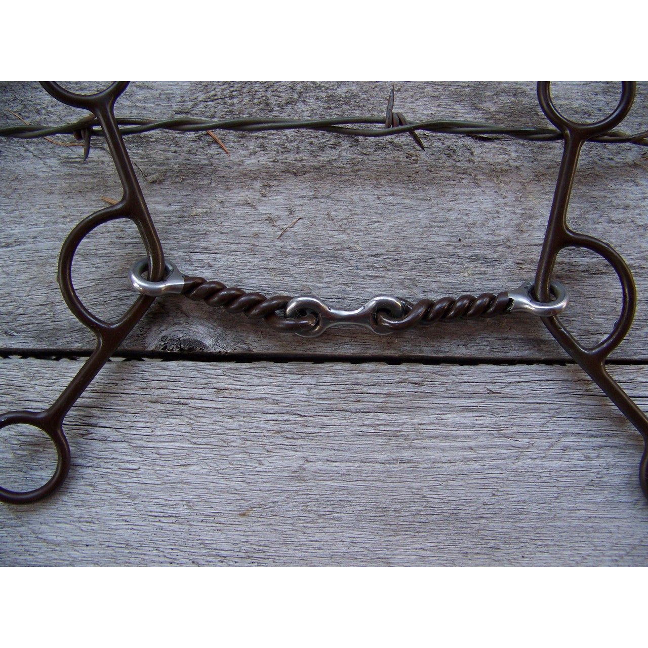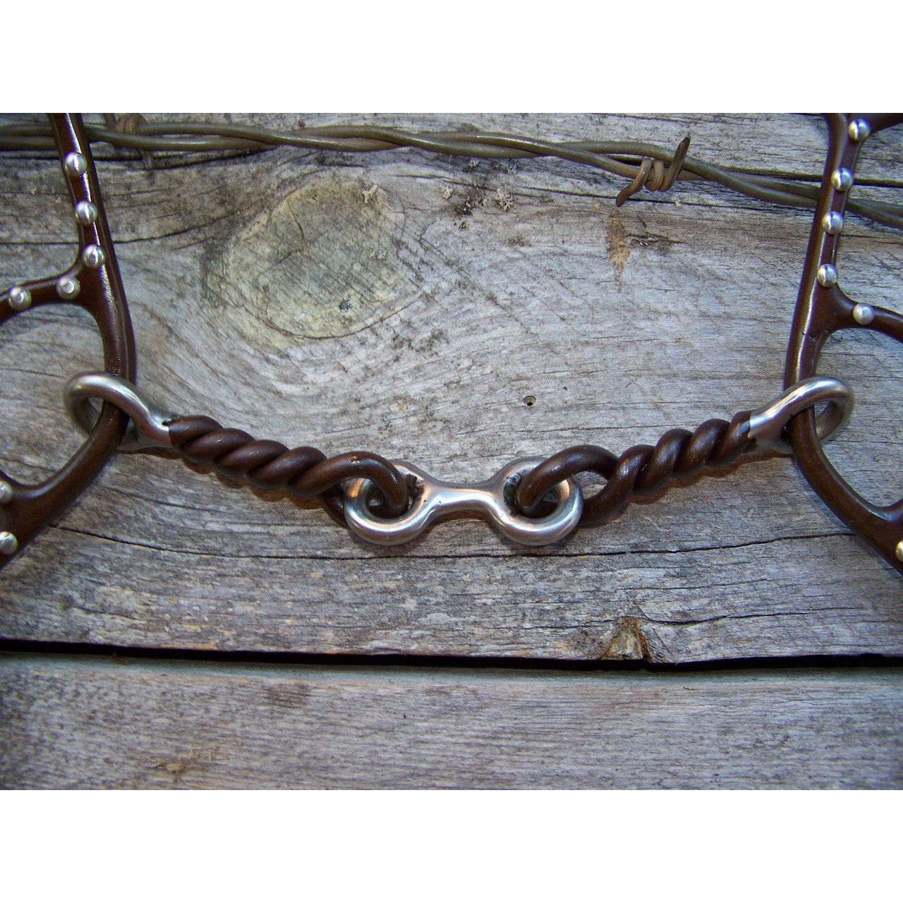 Antique brown short shank lifter bit. 5" dog bone mouth with sweet iron twisted wire bars. Stainless steel dog bone. 6 3/4" cheeks with stainless steel dots.