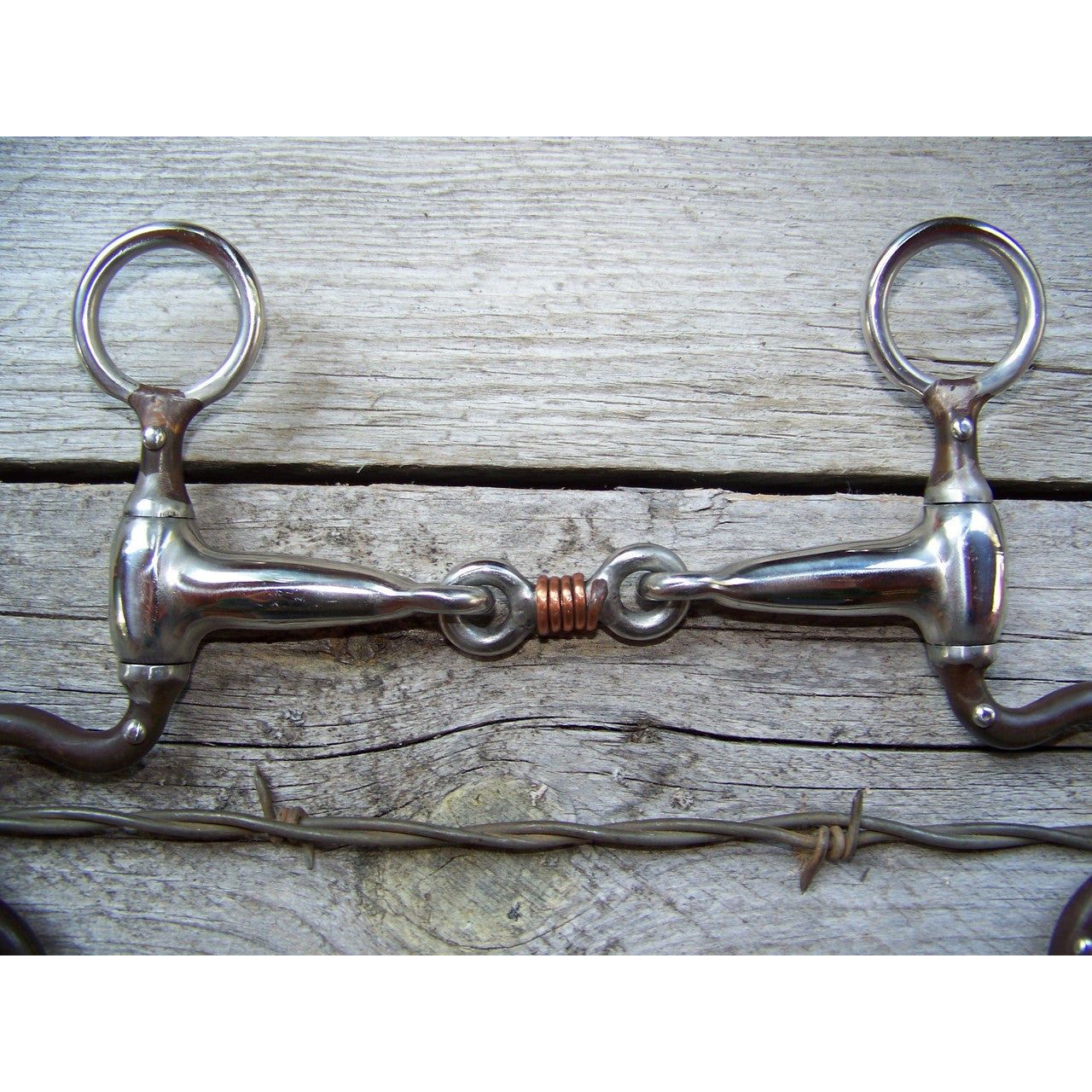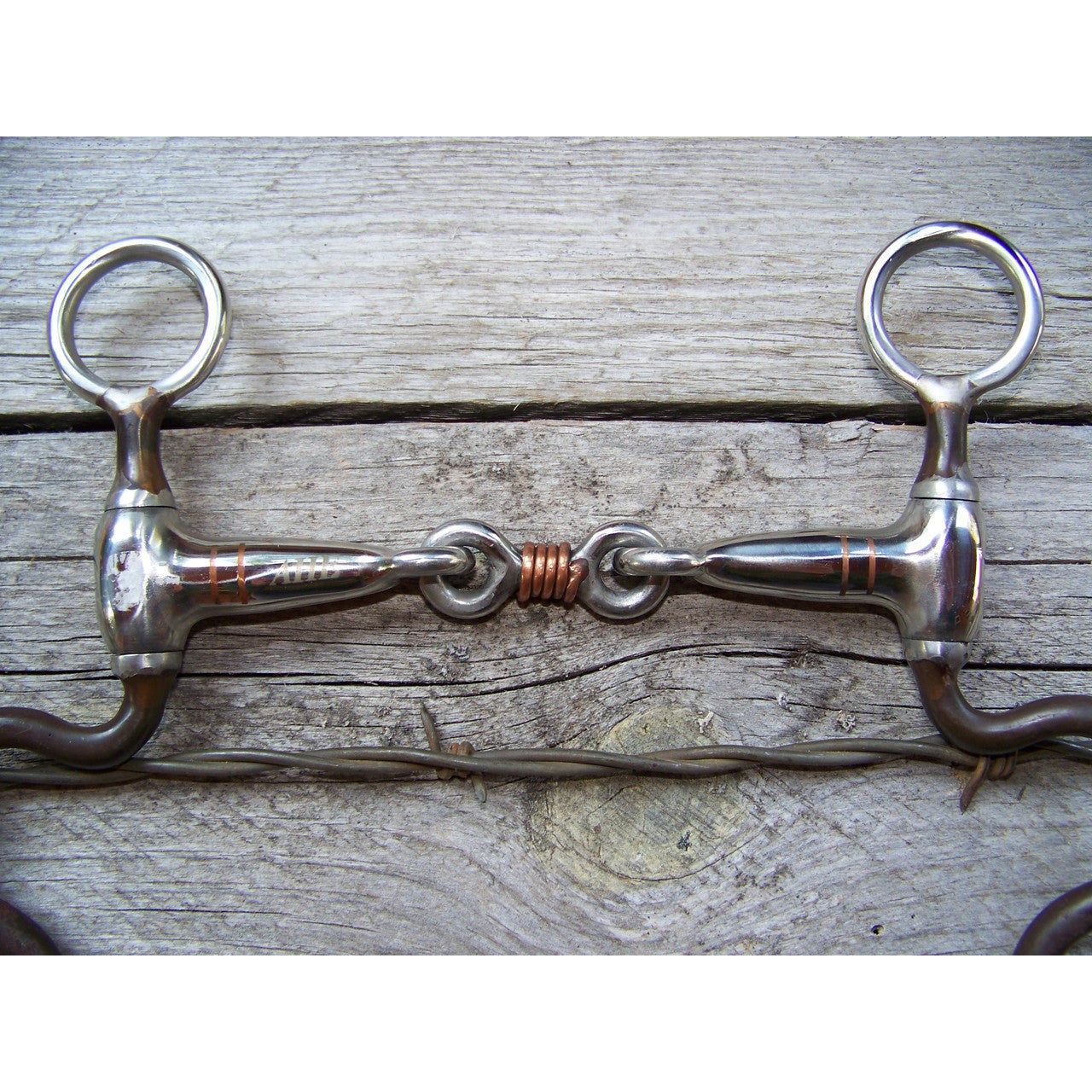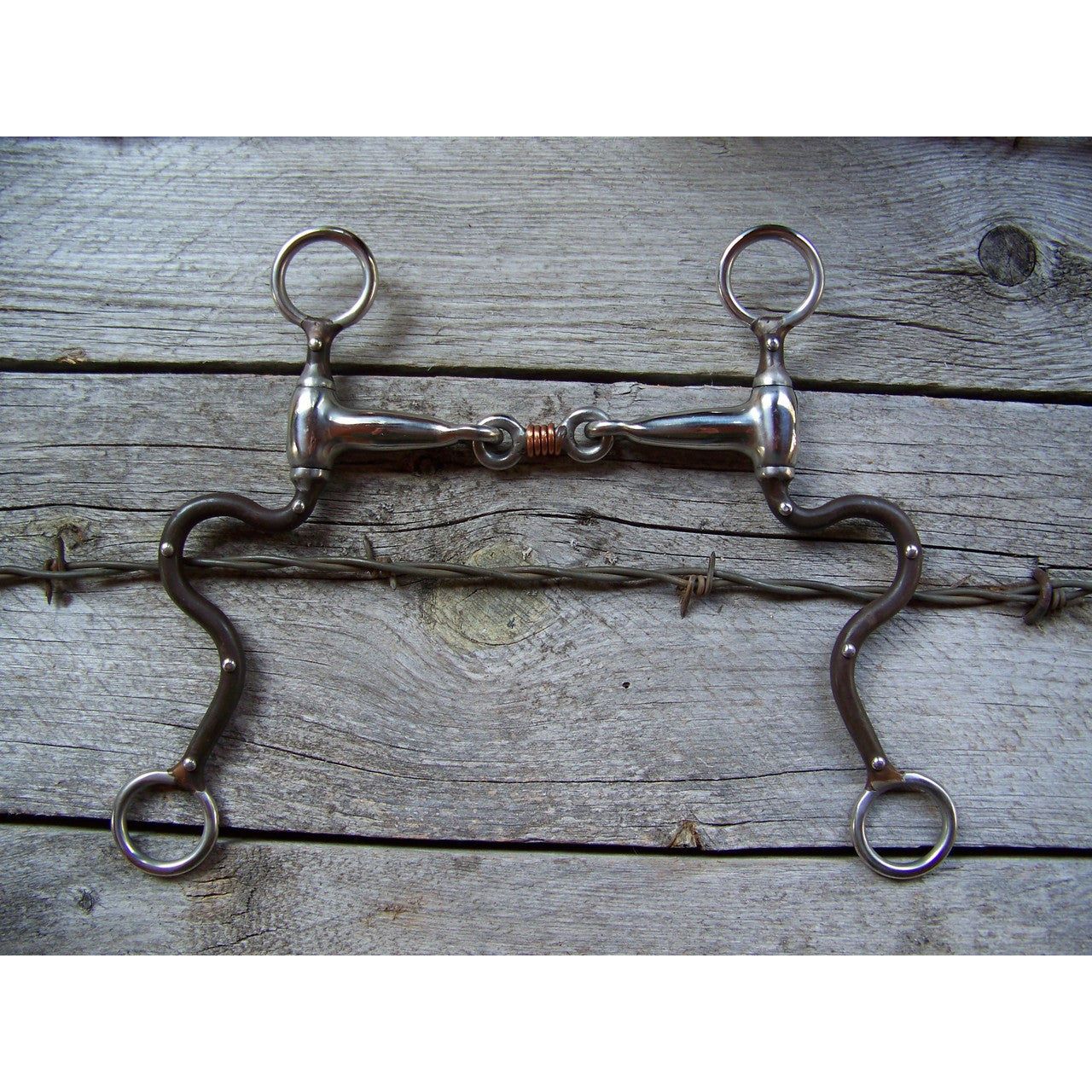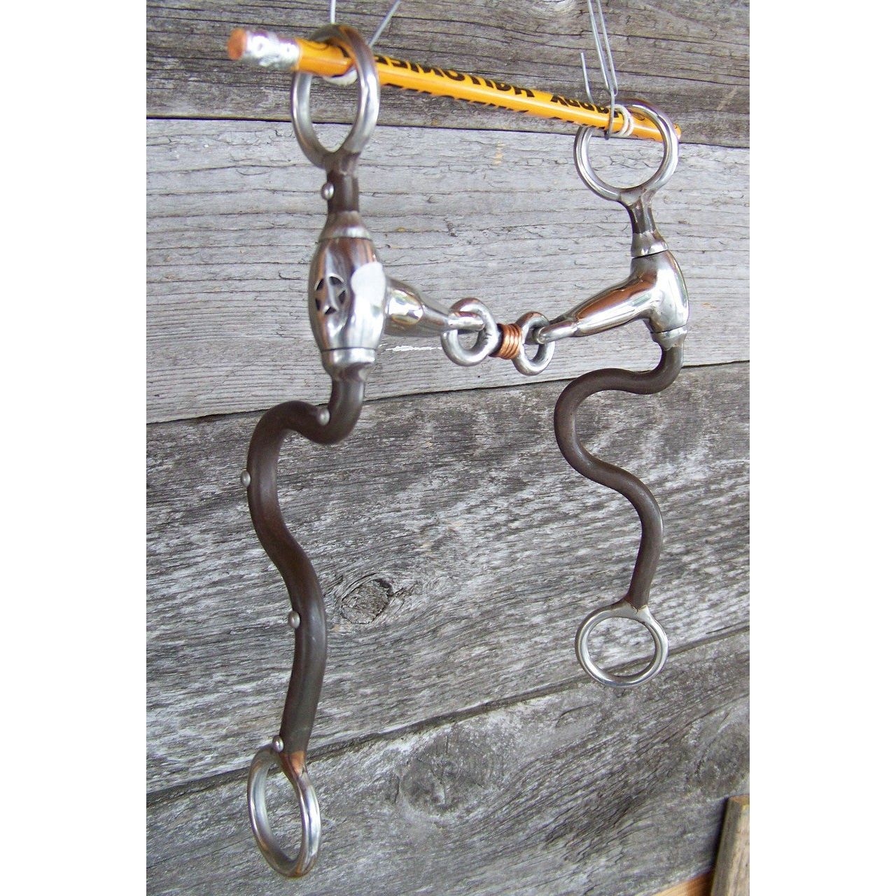 Antique brown training bit with 5" three piece snaffle mouth and copper, wire wrapped link. 8 1/2" S-Shank with inserted ranger star, conchos and inlaid dots.