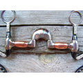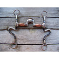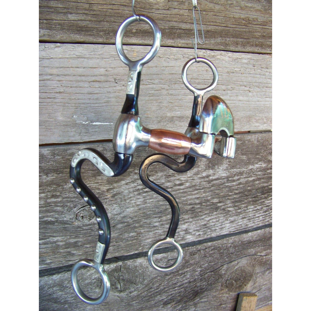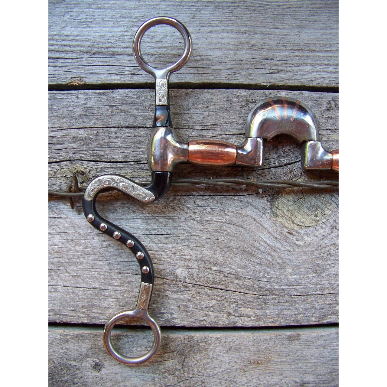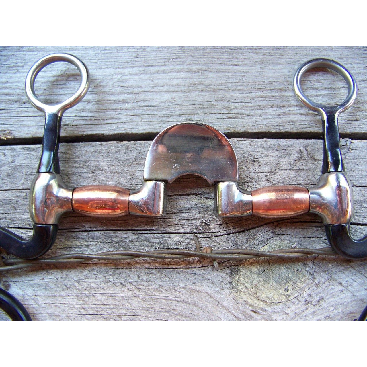 Black steel training bit with a 5" solid low c-port mouth with copper inlay and copper barrels. 8" S cheeks with flat stainless steel trim and dots.