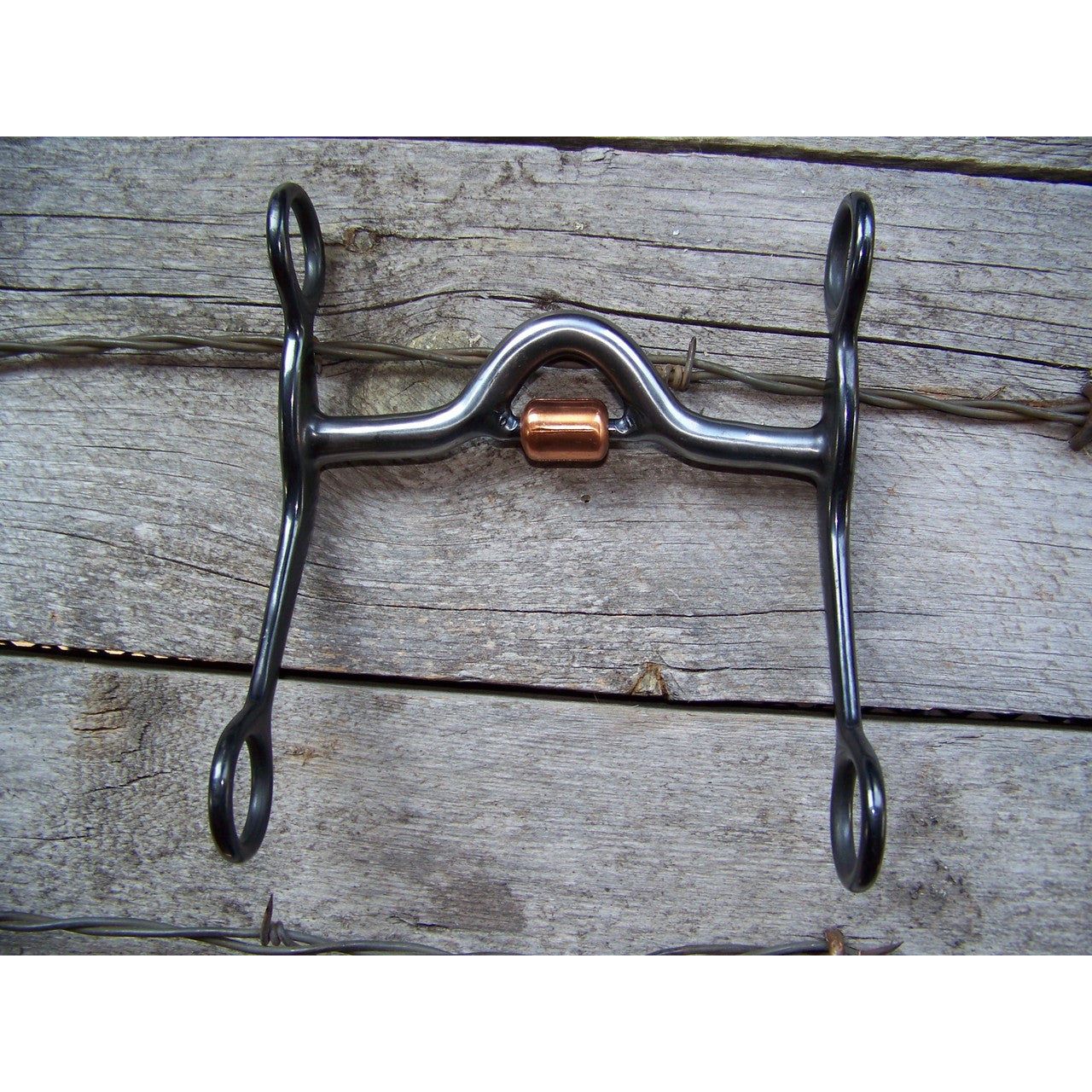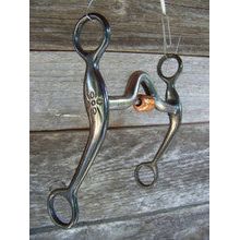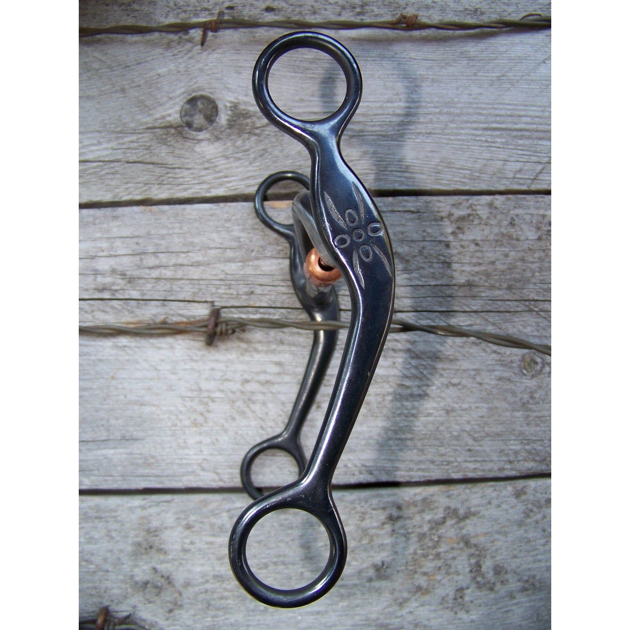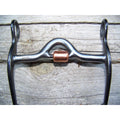 Black steel quarter horse bit with 5" medium port mouth and copper roller. 6 1/2" engraved cheeks.