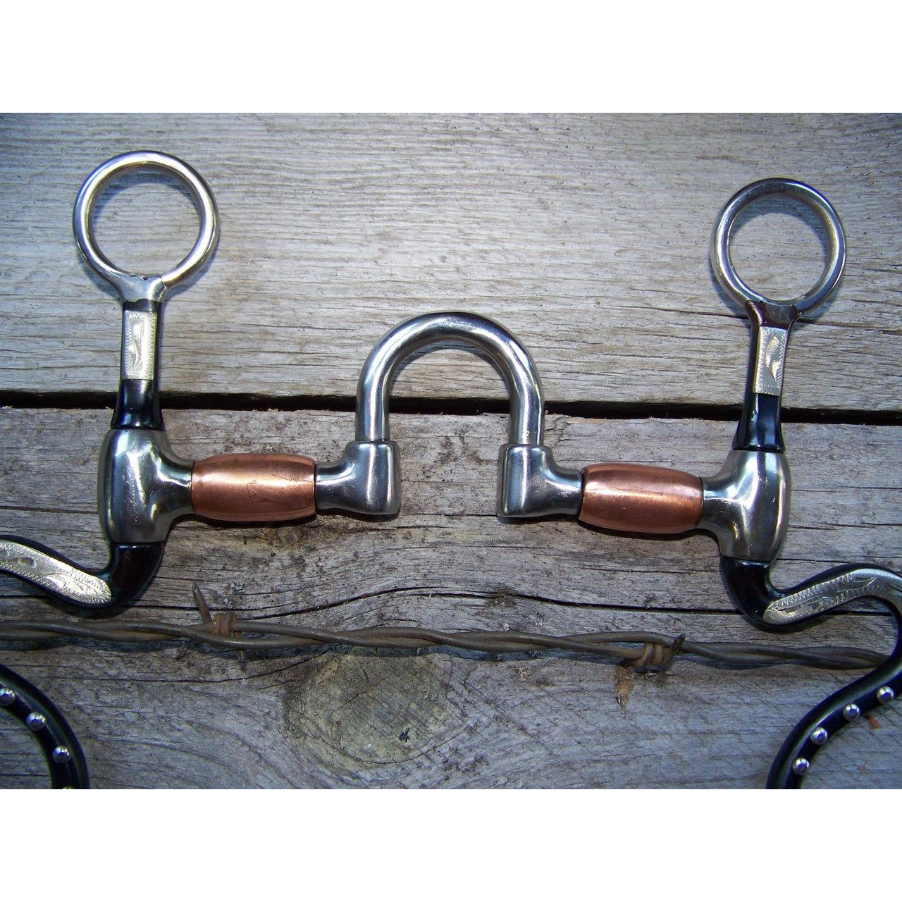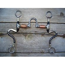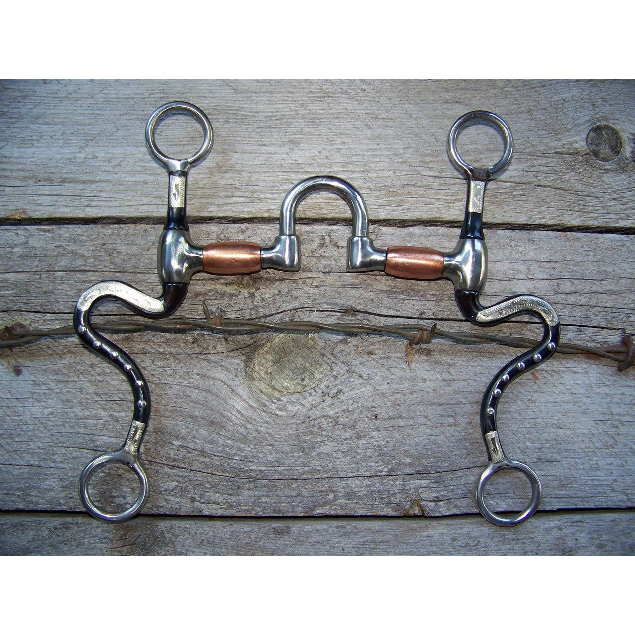 Black steel pro training bit with 5" correction mouth with copper barrels and stainless steel high port correction piece. 8 inch "S" shank cheeks with flat stainless steel trim and dots.