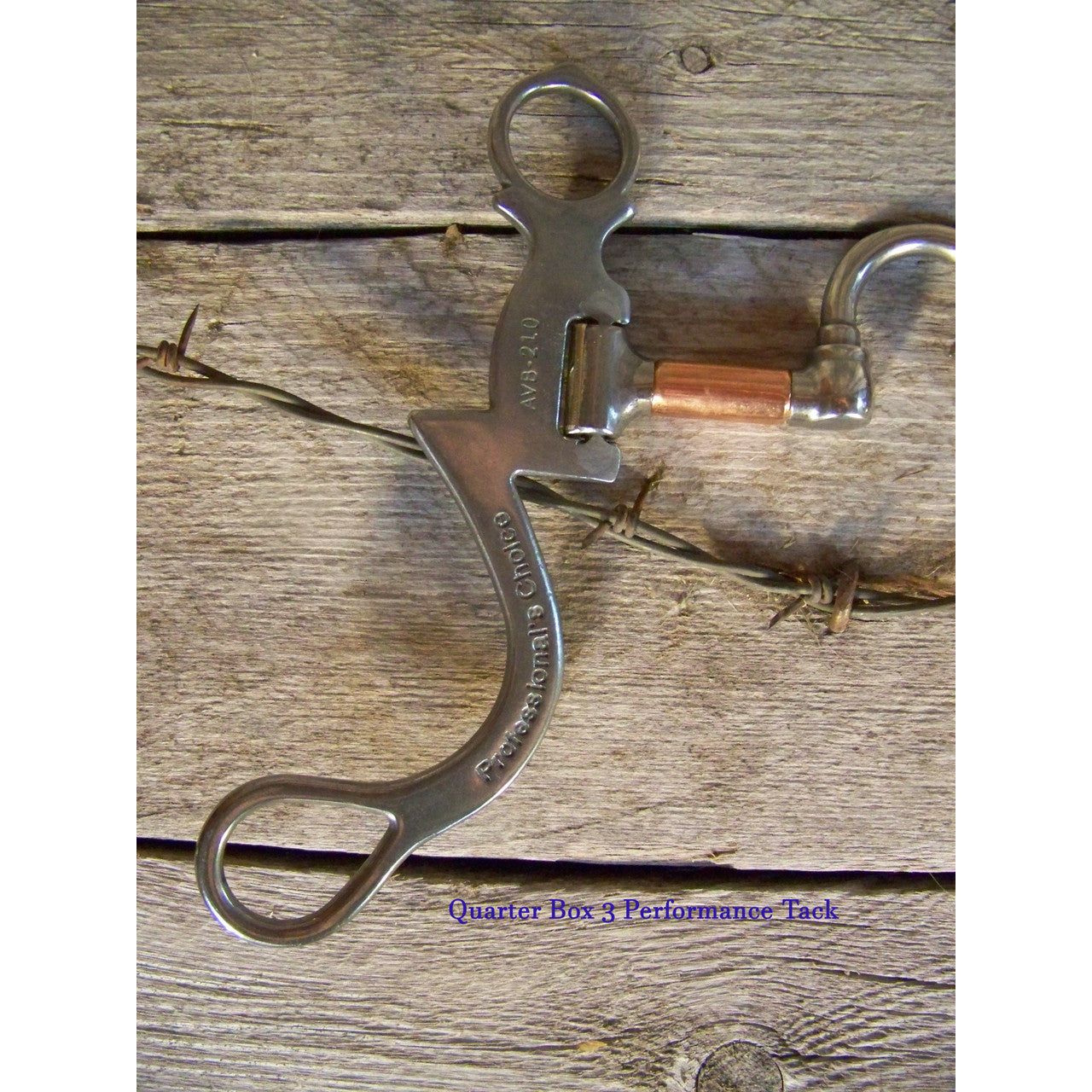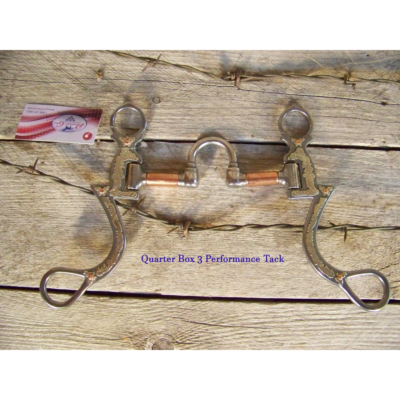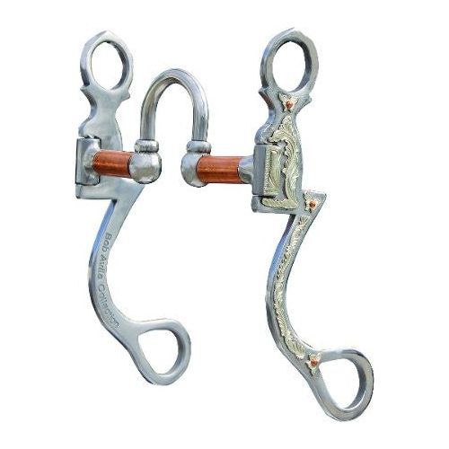 The Seven Shank design is weighted with an embellished cheek for the show arena. The four moving parts allow the horse to respond to subtle rein pressure which greatly reduces heavy rein handling. Copper bars keep the horses mouth moist. This bit can be used in any western discipline.