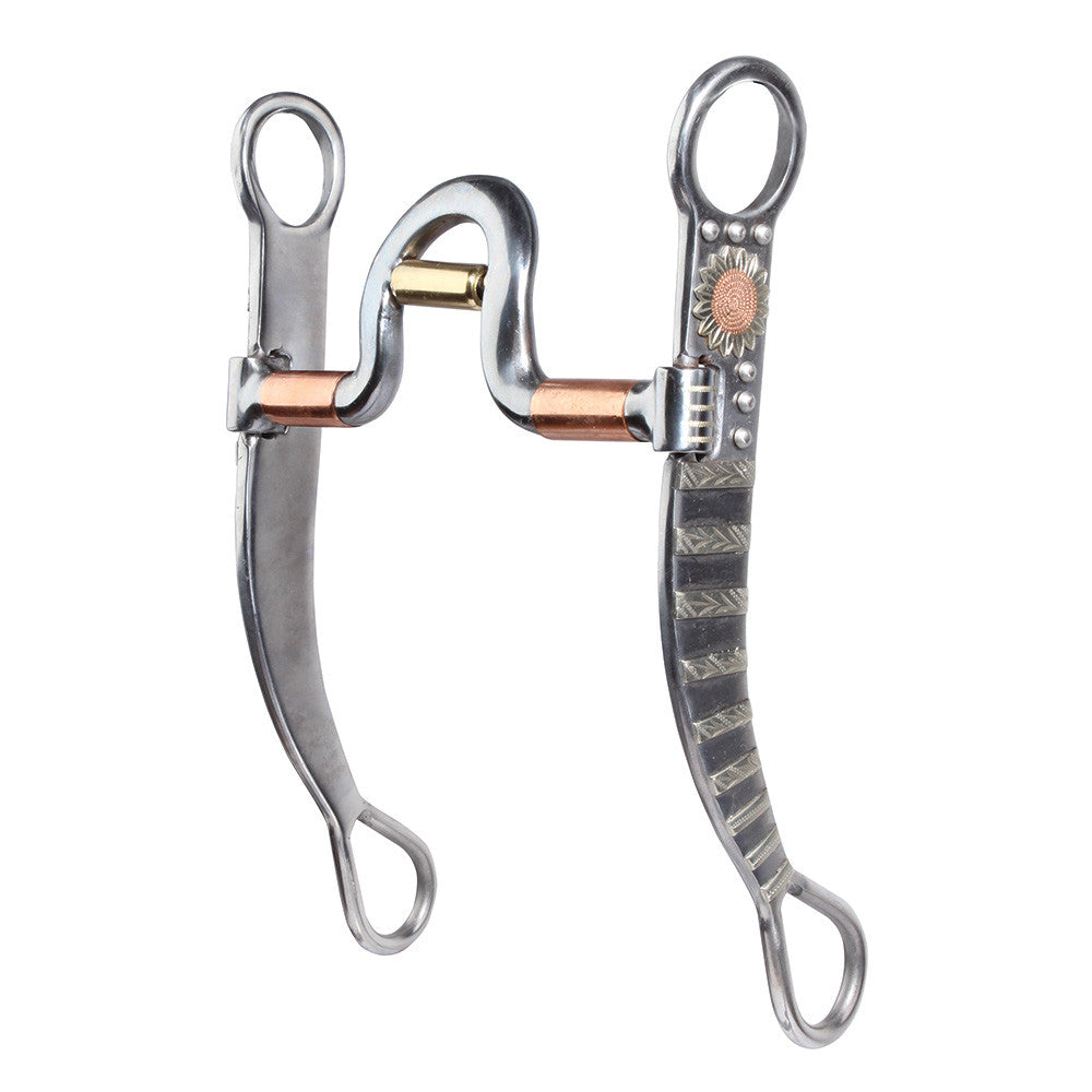 This sunflower shank is beautifully decorated and provides great weight and feel for the rider. The mouthpiece is a port with a roller and rolling copper bars. The roller makes this port more aggressive than a normal port because the horse loses some of its tongue relief, however; the roller can be a calming tool for an anxious horse.