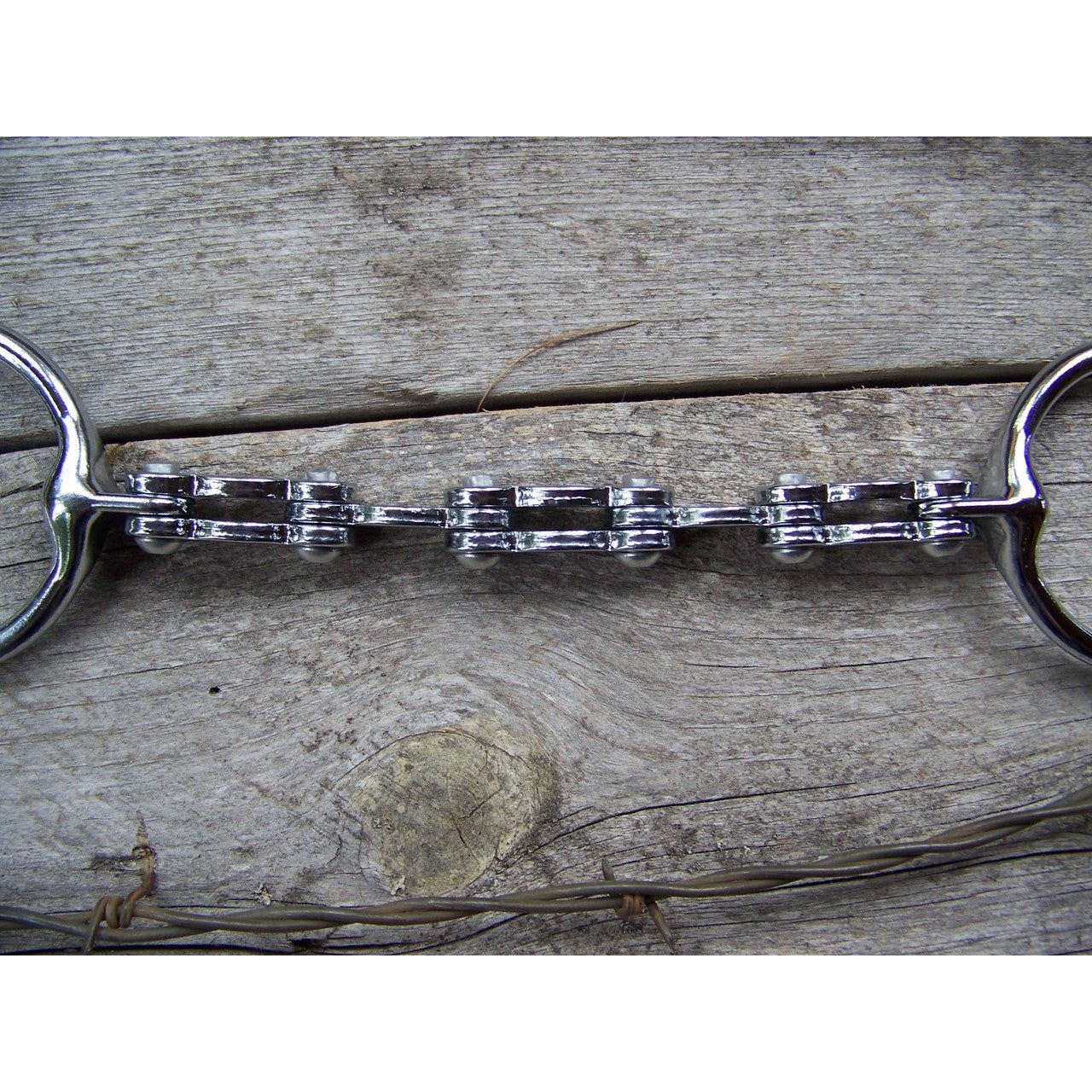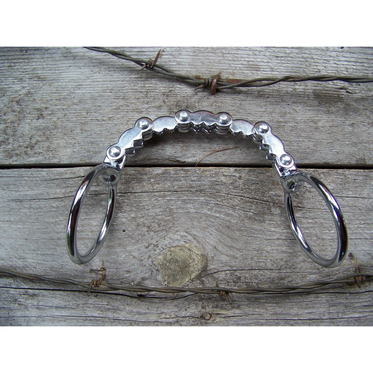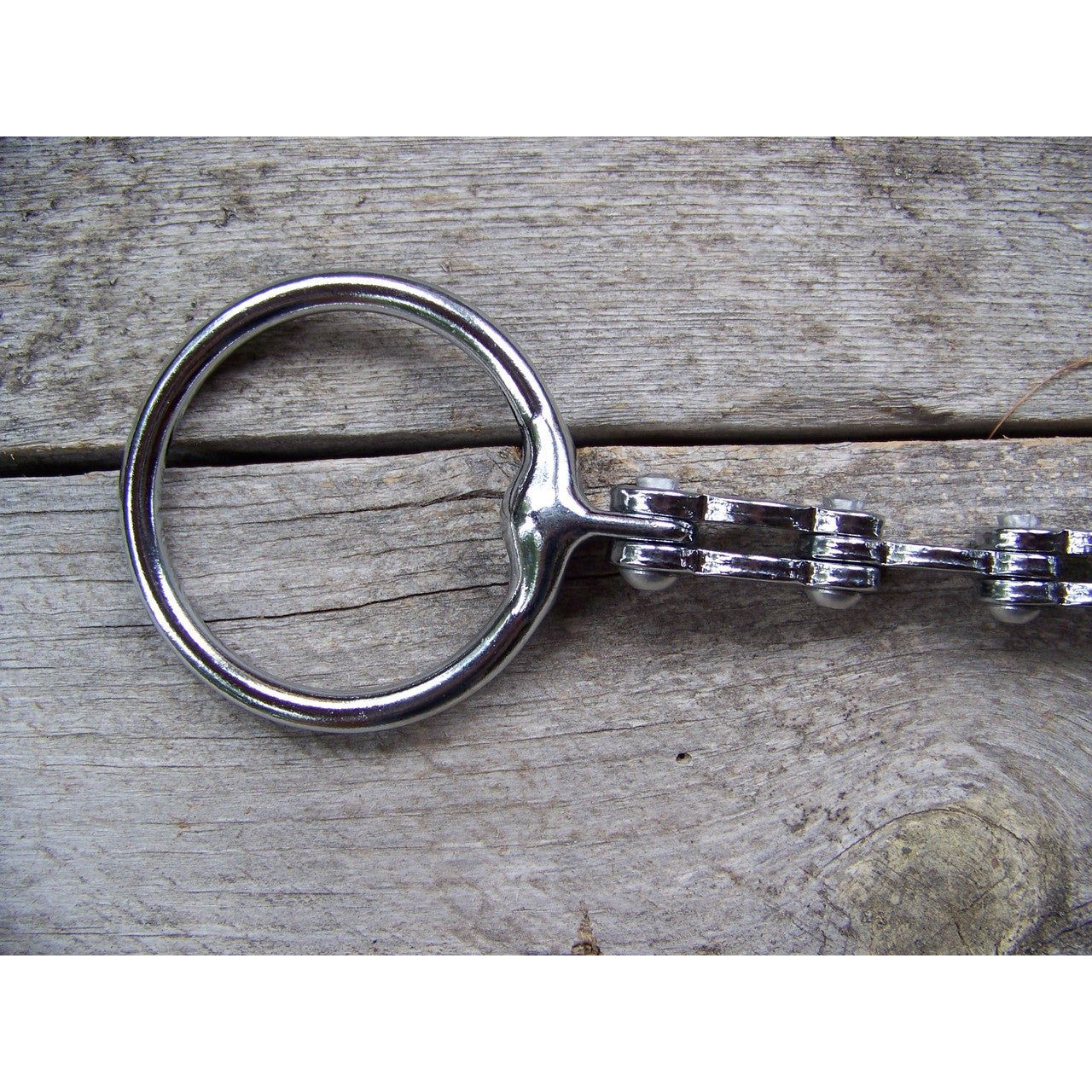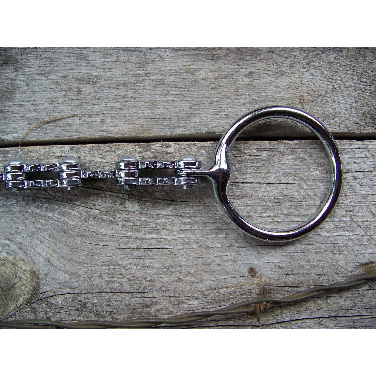 Saw chain mouth is on a chrome plated ring bit. NOTE - chrome plated bits will eventually rust when the chrome comes off! This is the difference in price between a stainless steel bit and a chrome plated bit. You get what you pay for! Mouth measure 6 1/2". Rings are 2 1/2" in diameter.