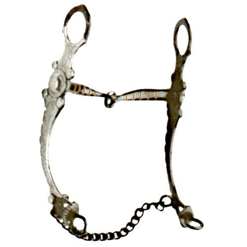 This Western bit has 8 inch cheeks. This bit has copper inlay bands on the mouth piece.