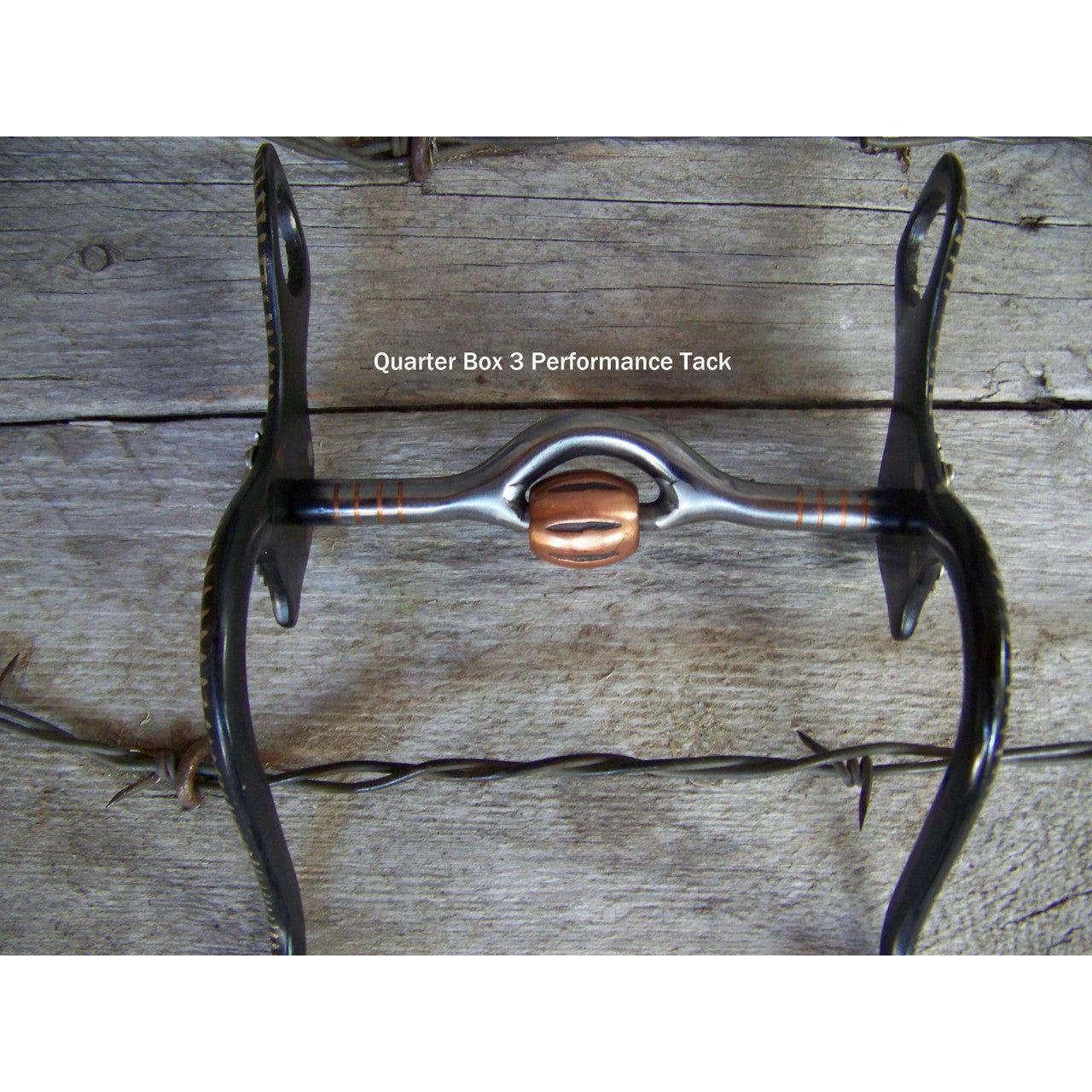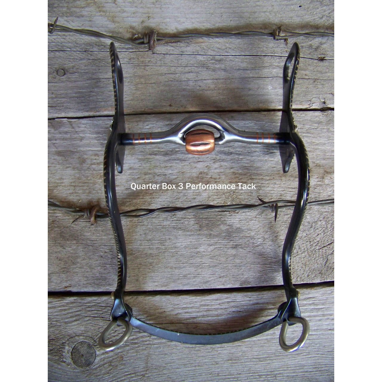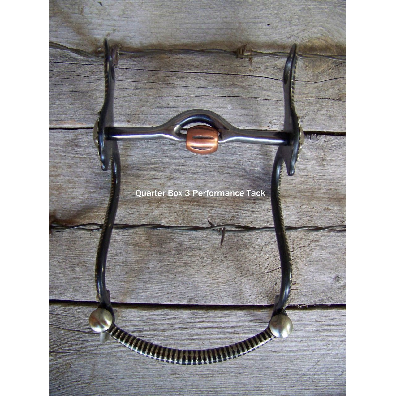 Engraved Concho with an angled shank for quicker, more immediate response, this bit is for the finished, well broke horse. What a classy look. Stainless mouth piece with copper roller, Black with German Silver overlay.