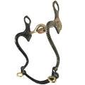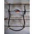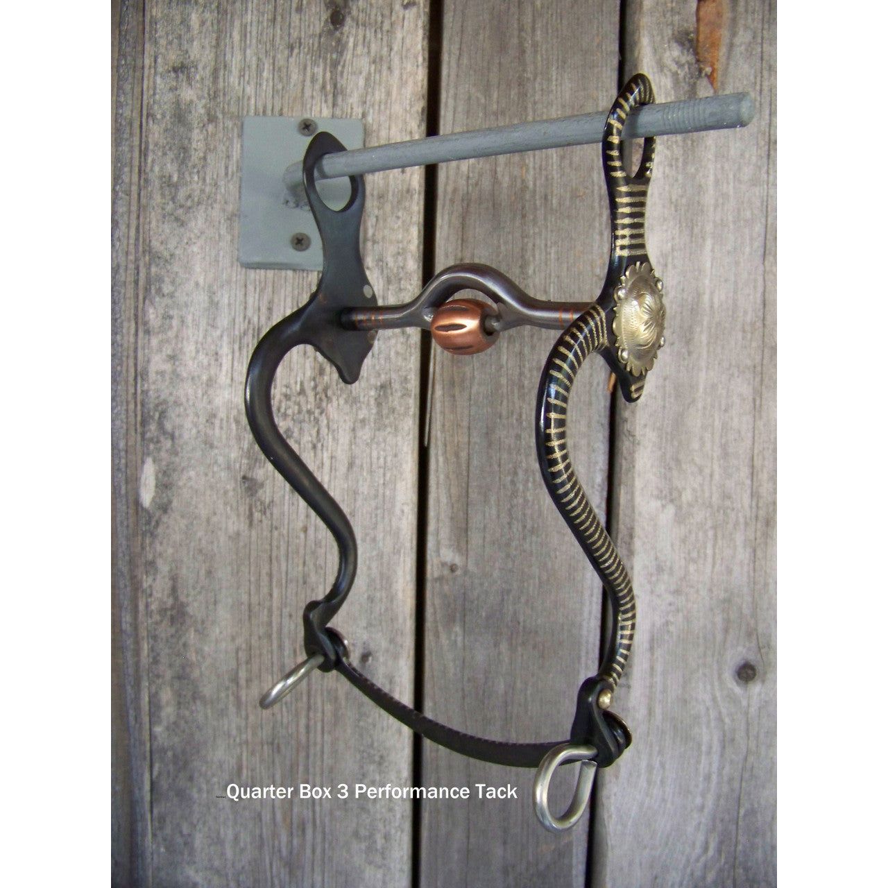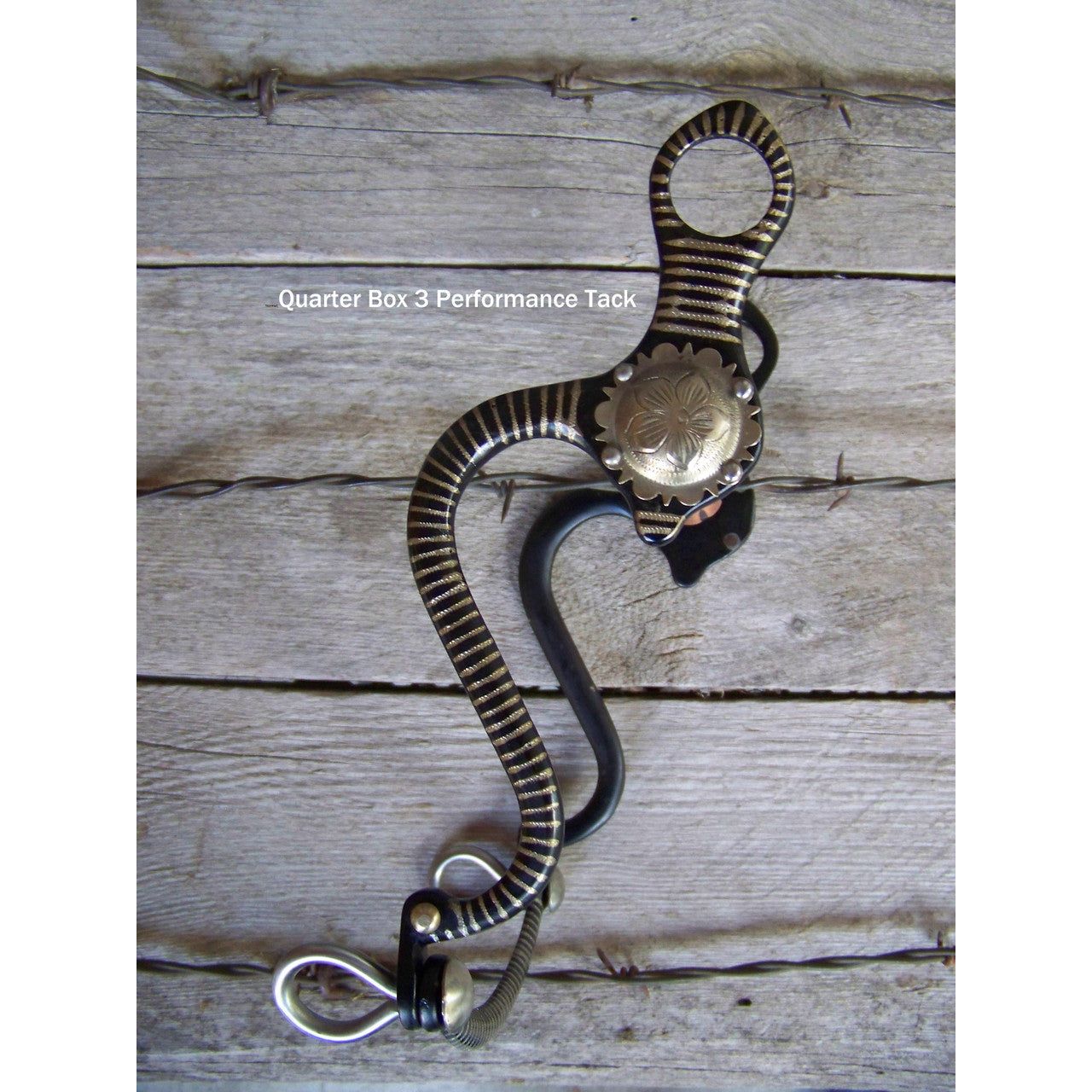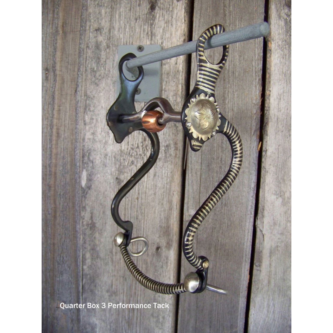 Engraved Concho with an angled shank for quicker, more immediate response, this bit is for the finished, well broke horse. What a classy look. Stainless mouth piece with copper roller, Black with German Silver overlay.