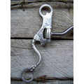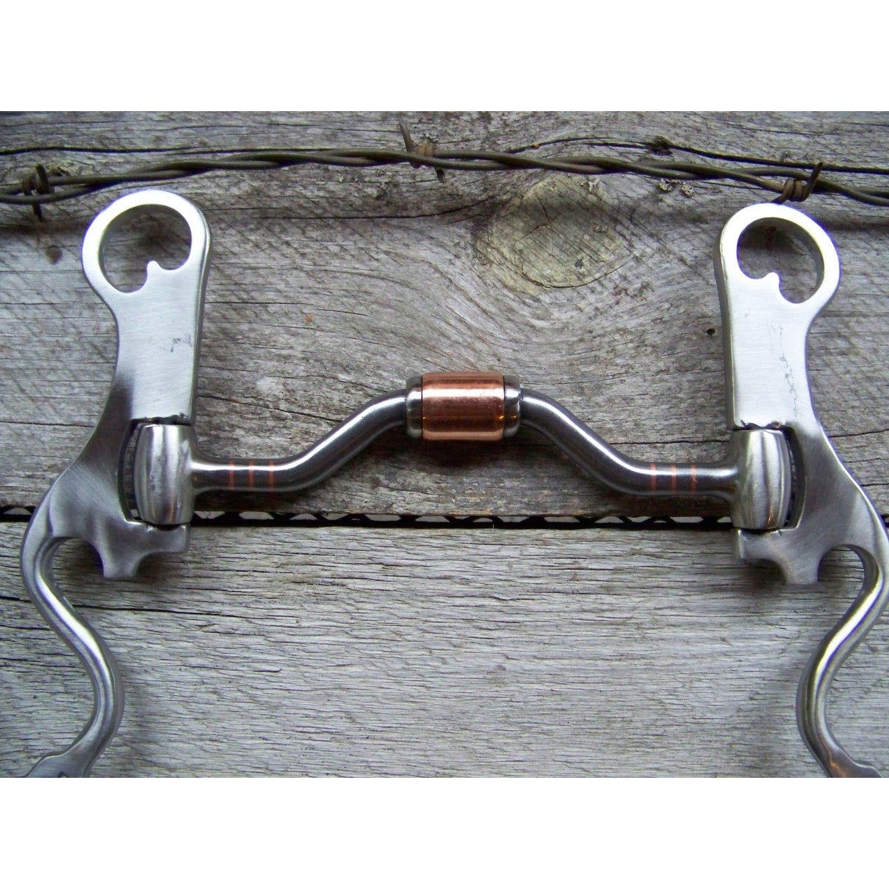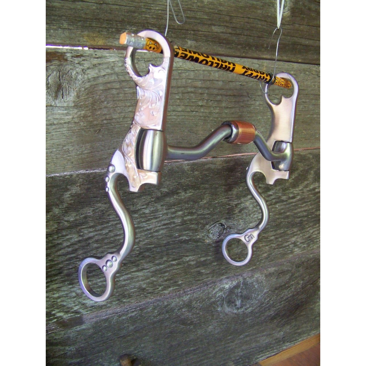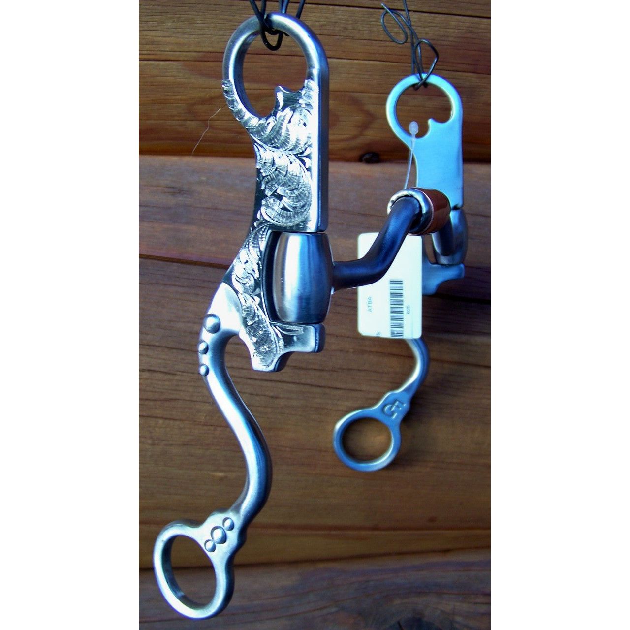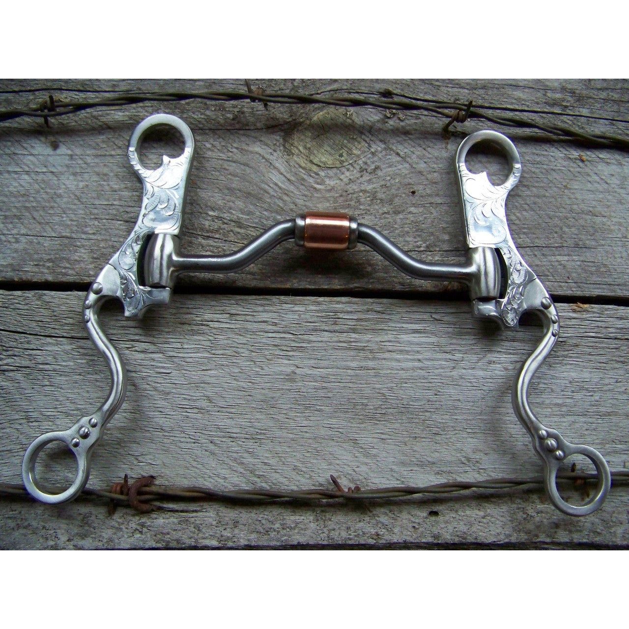 Short Futurity Hinged Port Show Bit. 5 1/8" sweet iron hinged port mouthpiece with copper roller. 7 1/2" stainless steel brushed high purchase cheek with hand engraved stainless steel trim. The high purchase cheek dsign allows a better pressure distribution to the poll and a better balance. This bit helps to develop a lighter mouth. For the intermediate horse. Comfortable with a moderate effect.