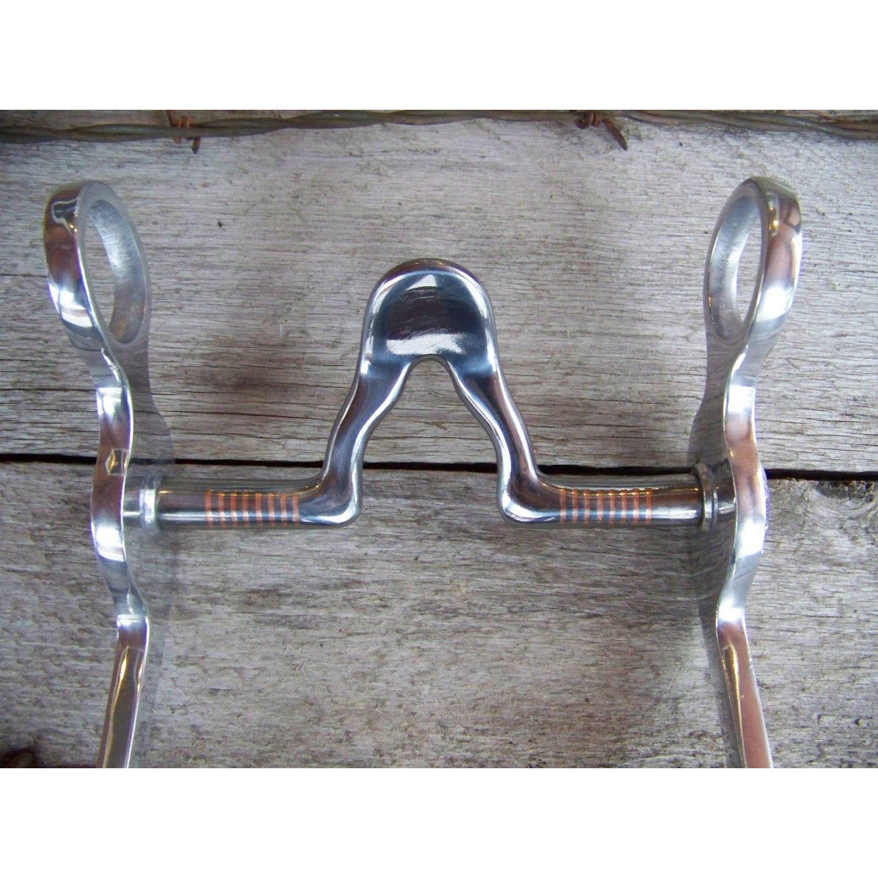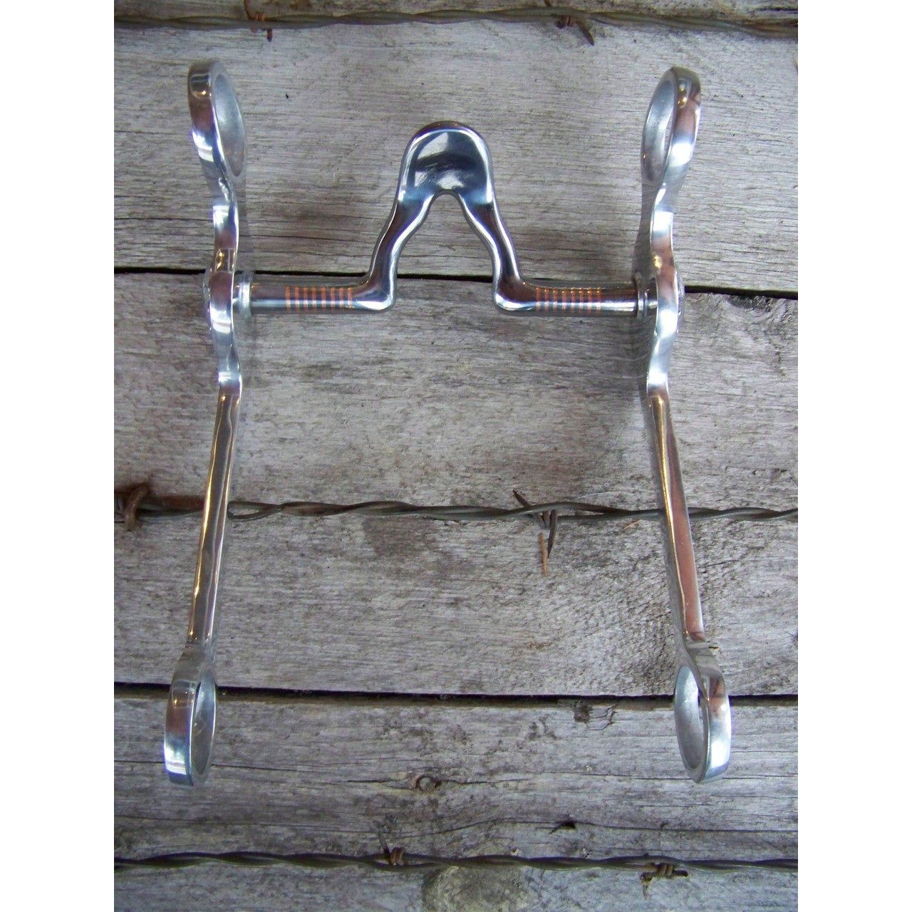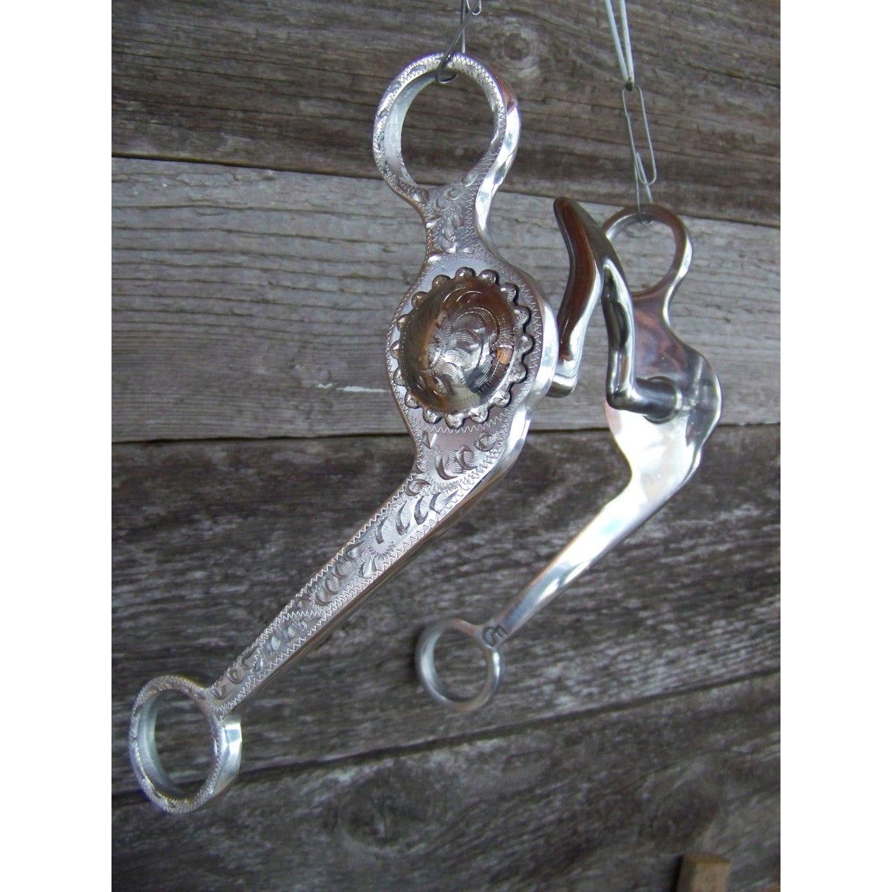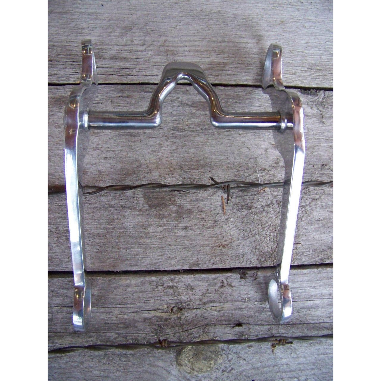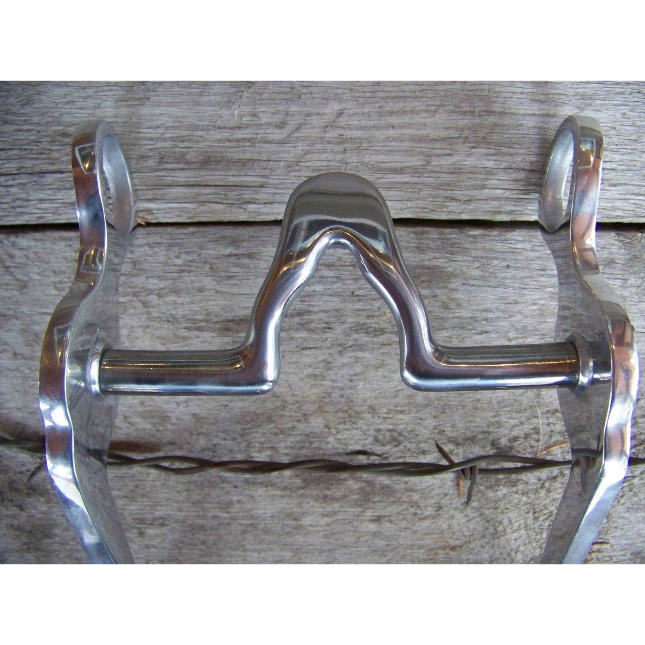 Francois Gauthier aluminum grazing bit with a 5" sweet iron mouthpiece and a 2 1/2" cathedral port. Shanks are 8 1/4" engraved aluminum cheeks with conchos. This bit is dedicated to one-hand riding for the advanced horse. Provides a strong effect.