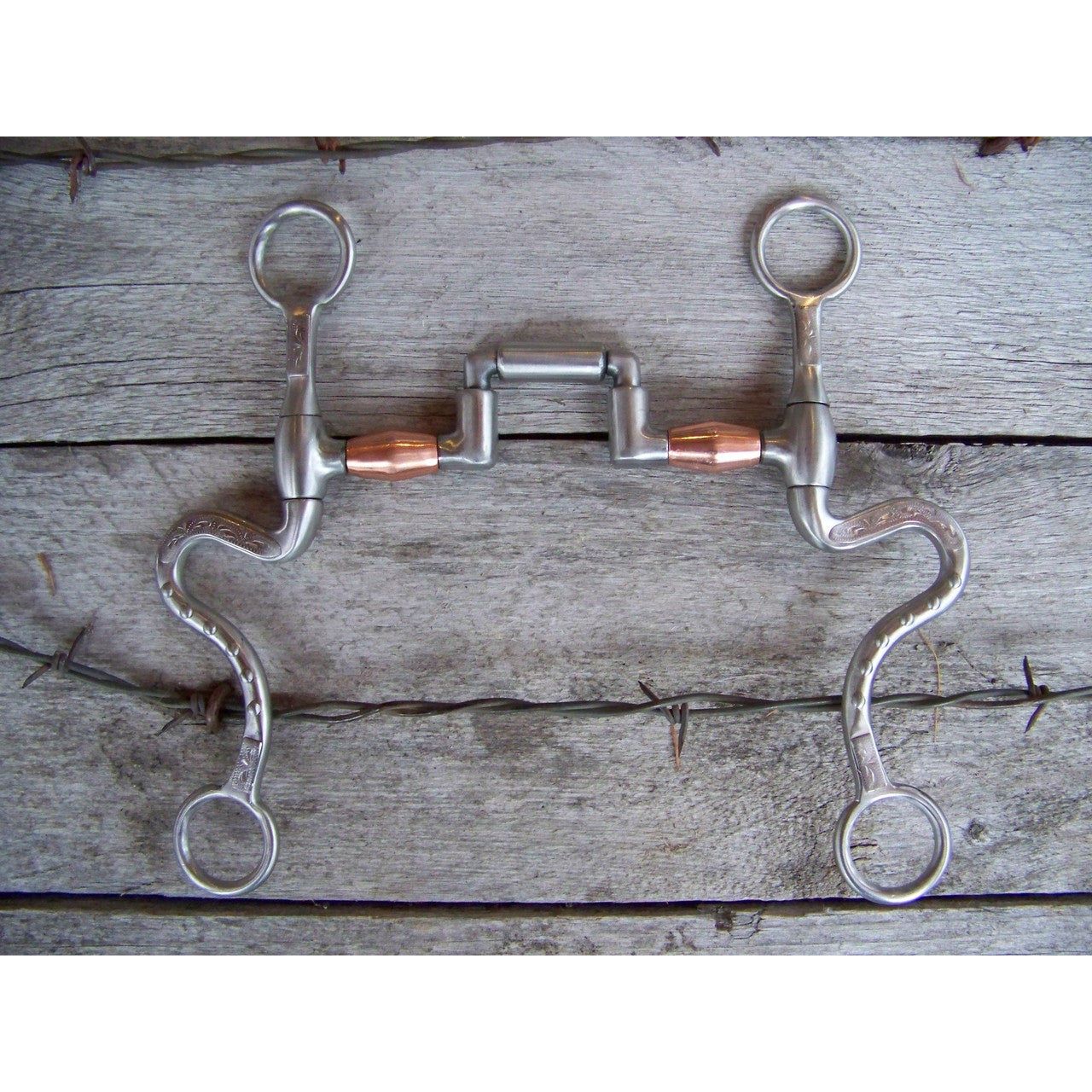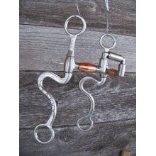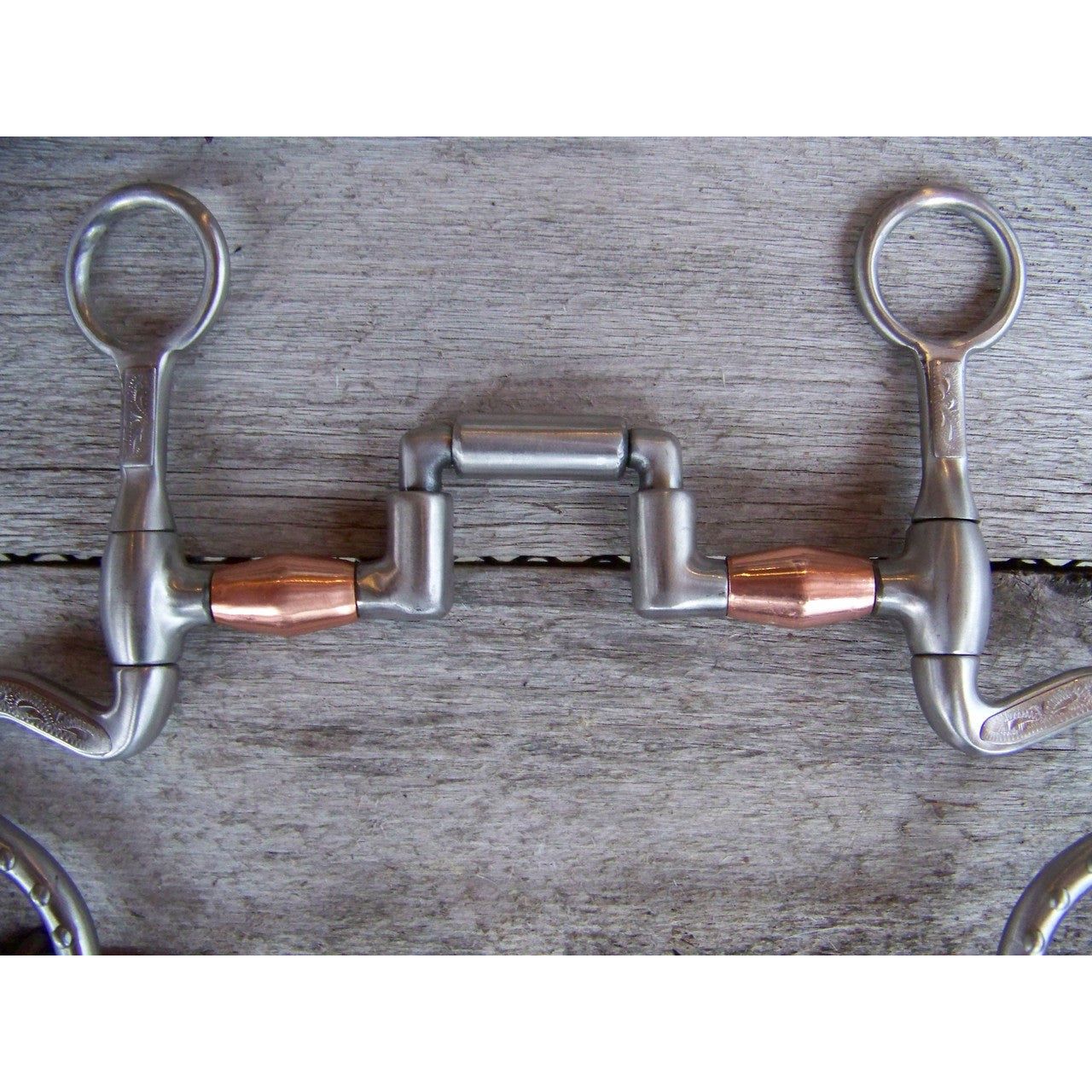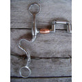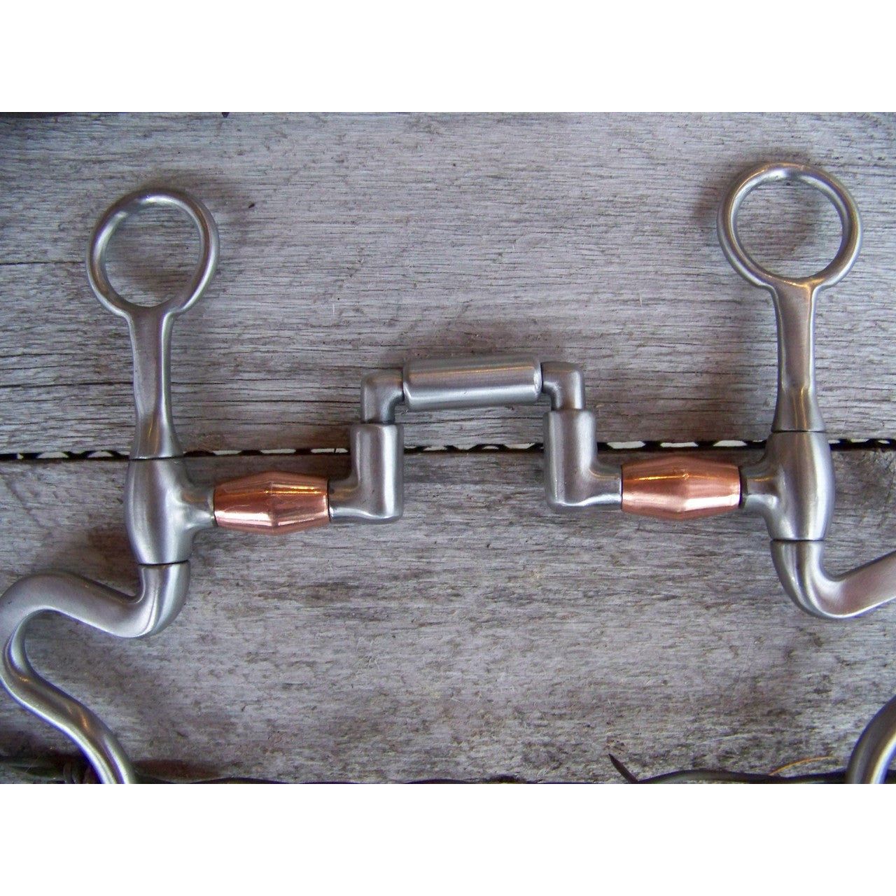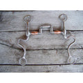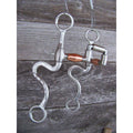 Francois Gauthier stainless steel brushed articulated correction bit. Mouth is 5" wide with copper barrels. The 8 1/4" stainless steel brushed S-shanks are accented with silver trim and dots. Good for softening a horse mouth. Developed for the intermediate horse. Provides a medium effect.