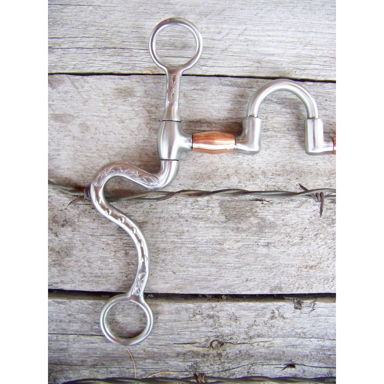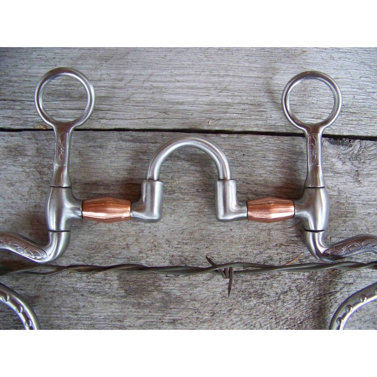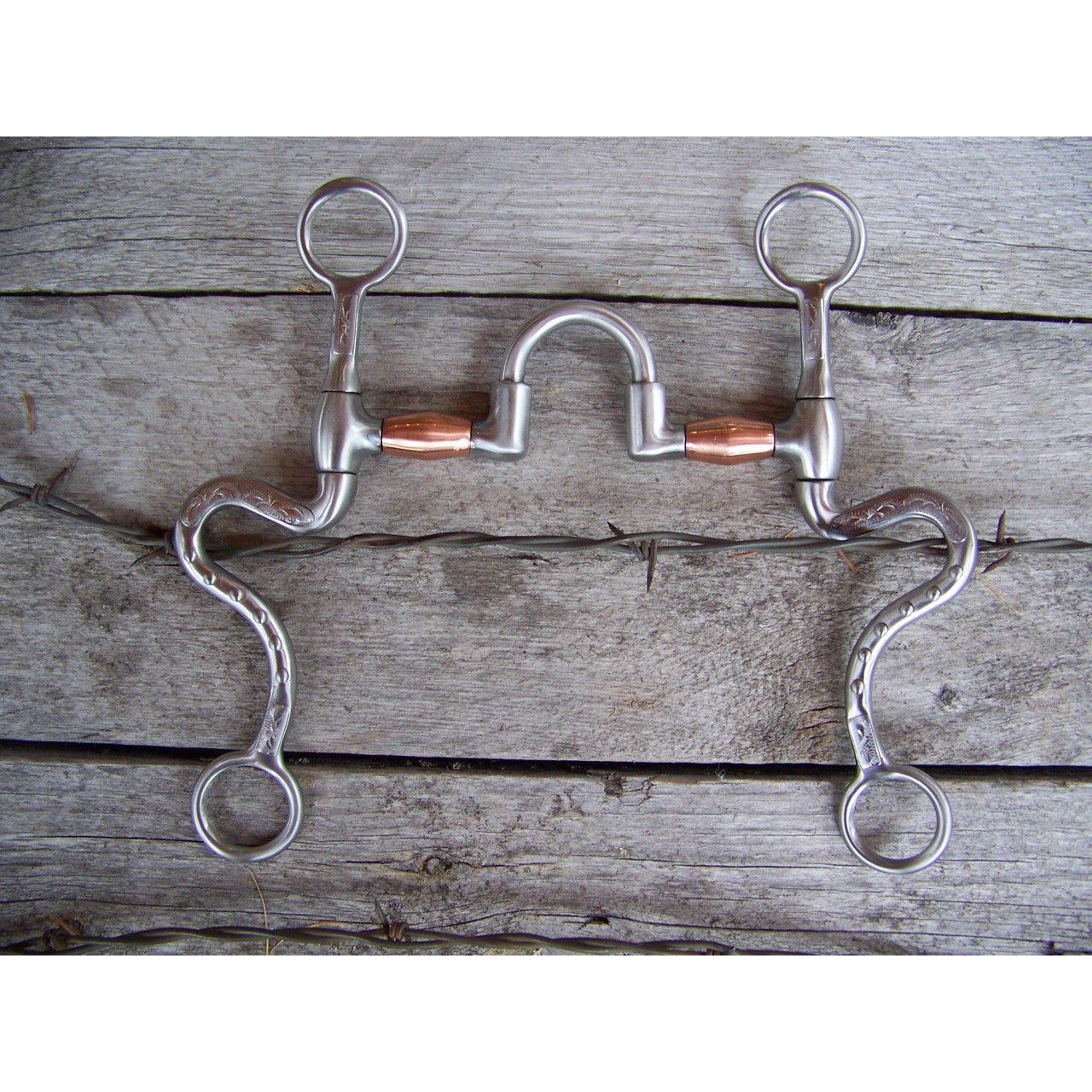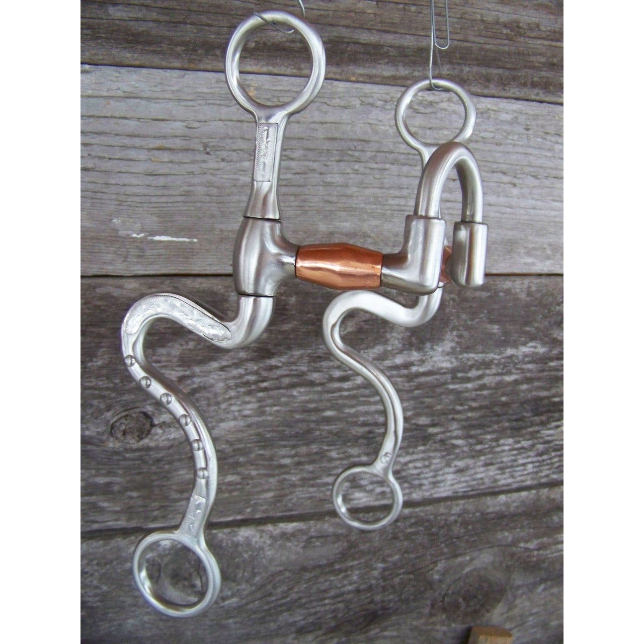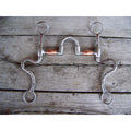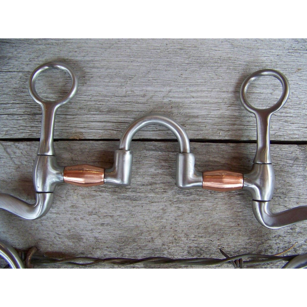 Francois Gauthier brushed smooth correction bit with a 5" sweet iron mouth piece with copper barrels. Cheeks measure 8 1/4" and are stainless steel S-Shanks. Accented with wilver trim and dots. Comfortable with a strong effect. Good for softening a heavy mouth. For intermediate to advanced horse.