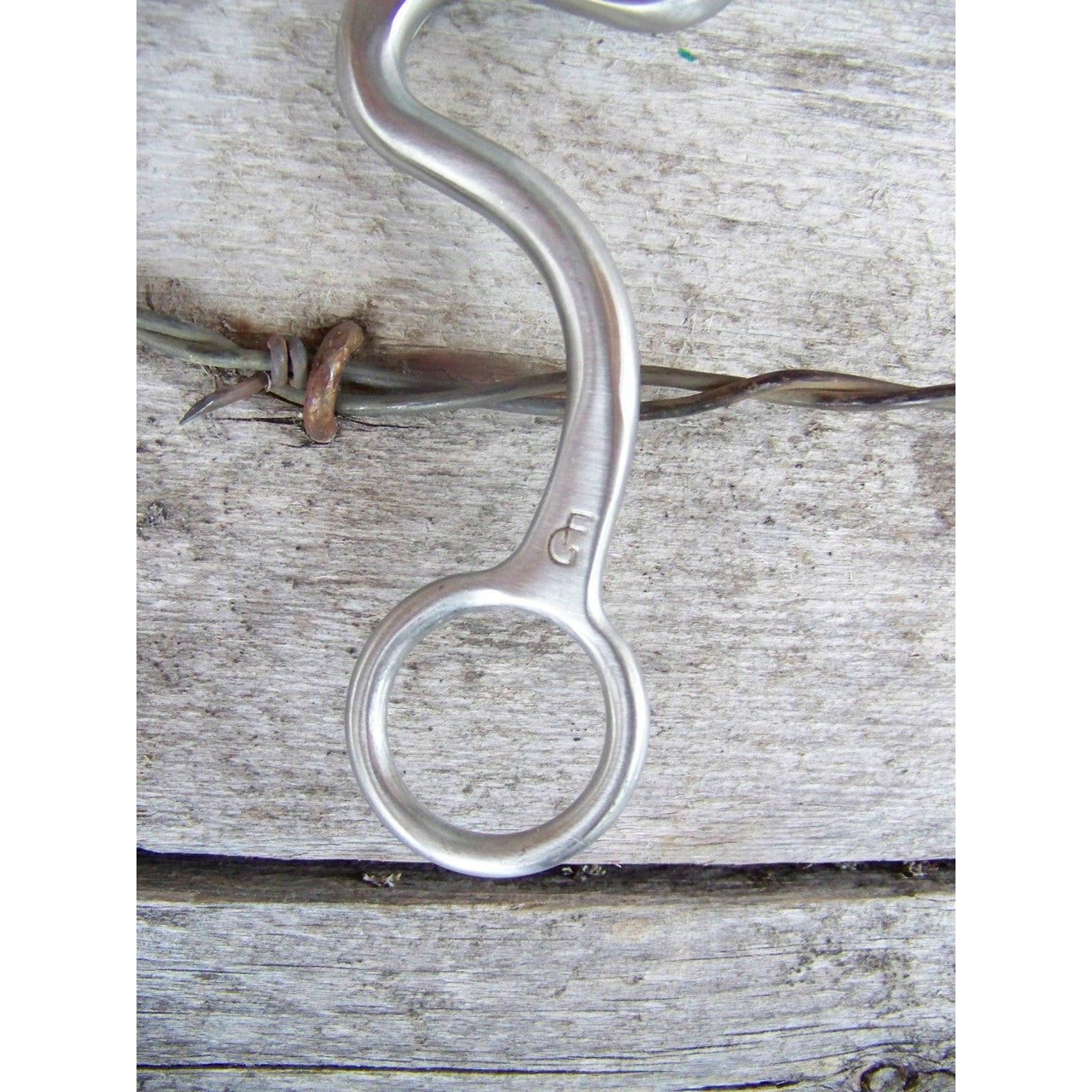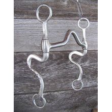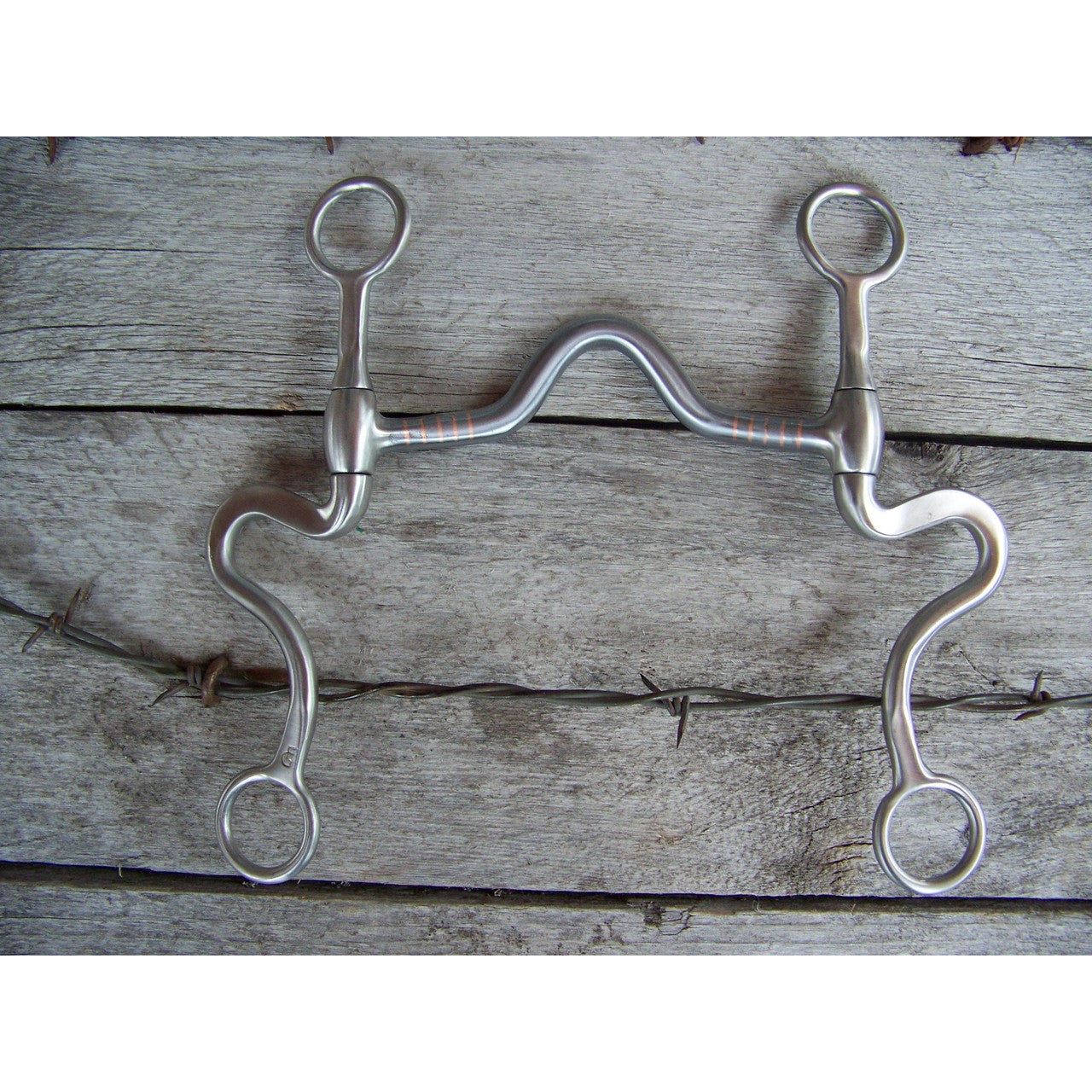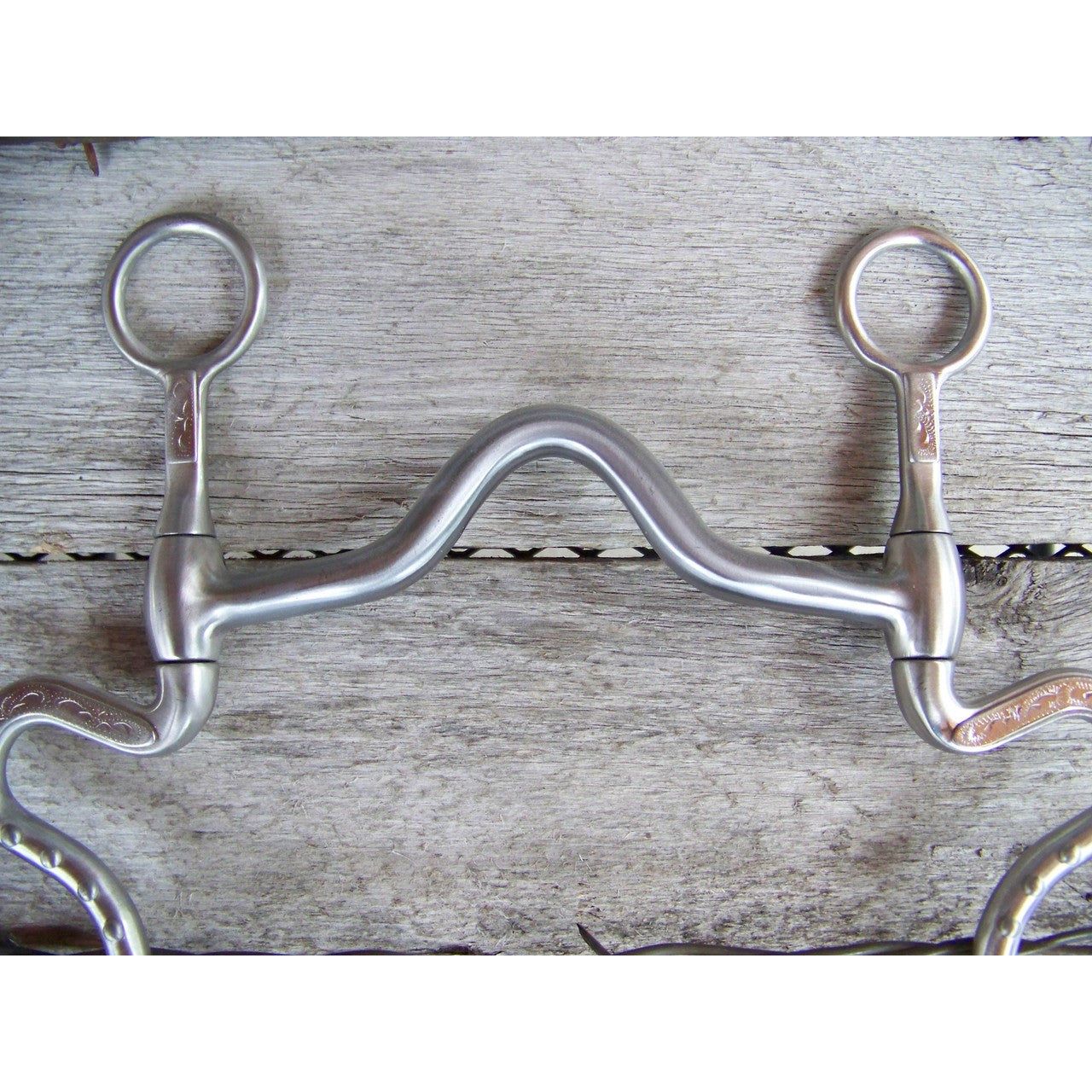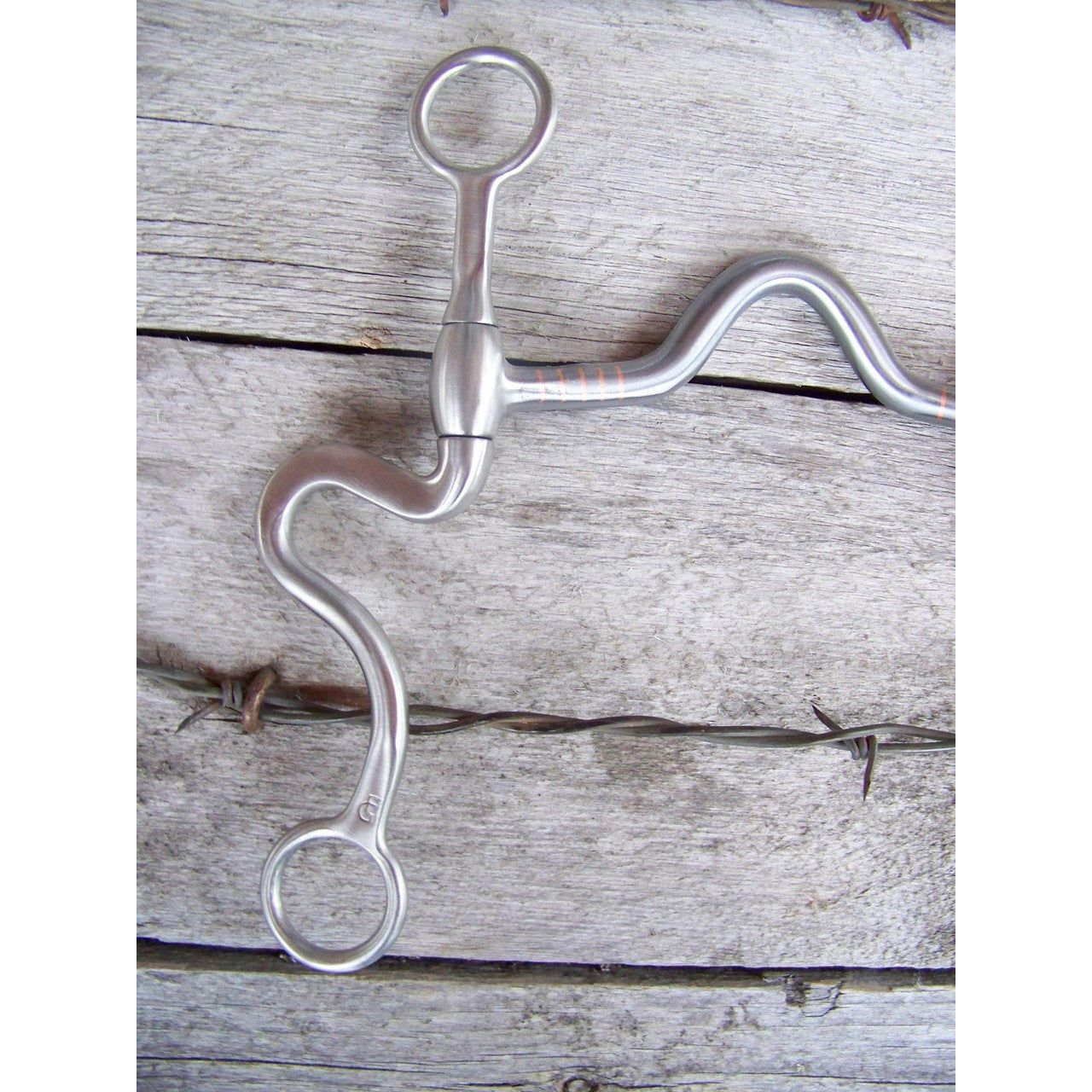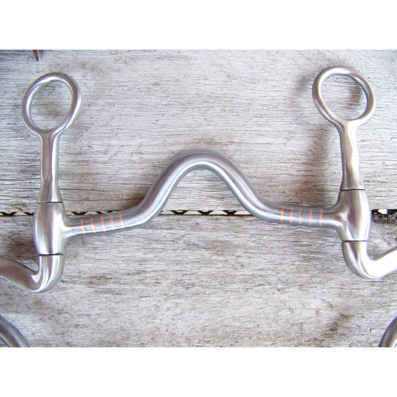 Francois Gauthier stainless steel brushed medium port show bit. Has a 5" sweet iron curved mouth piece with copper inlay. The 8 1/4" stainless steel S-shanks are brushed and accented with silver trim and dots.