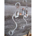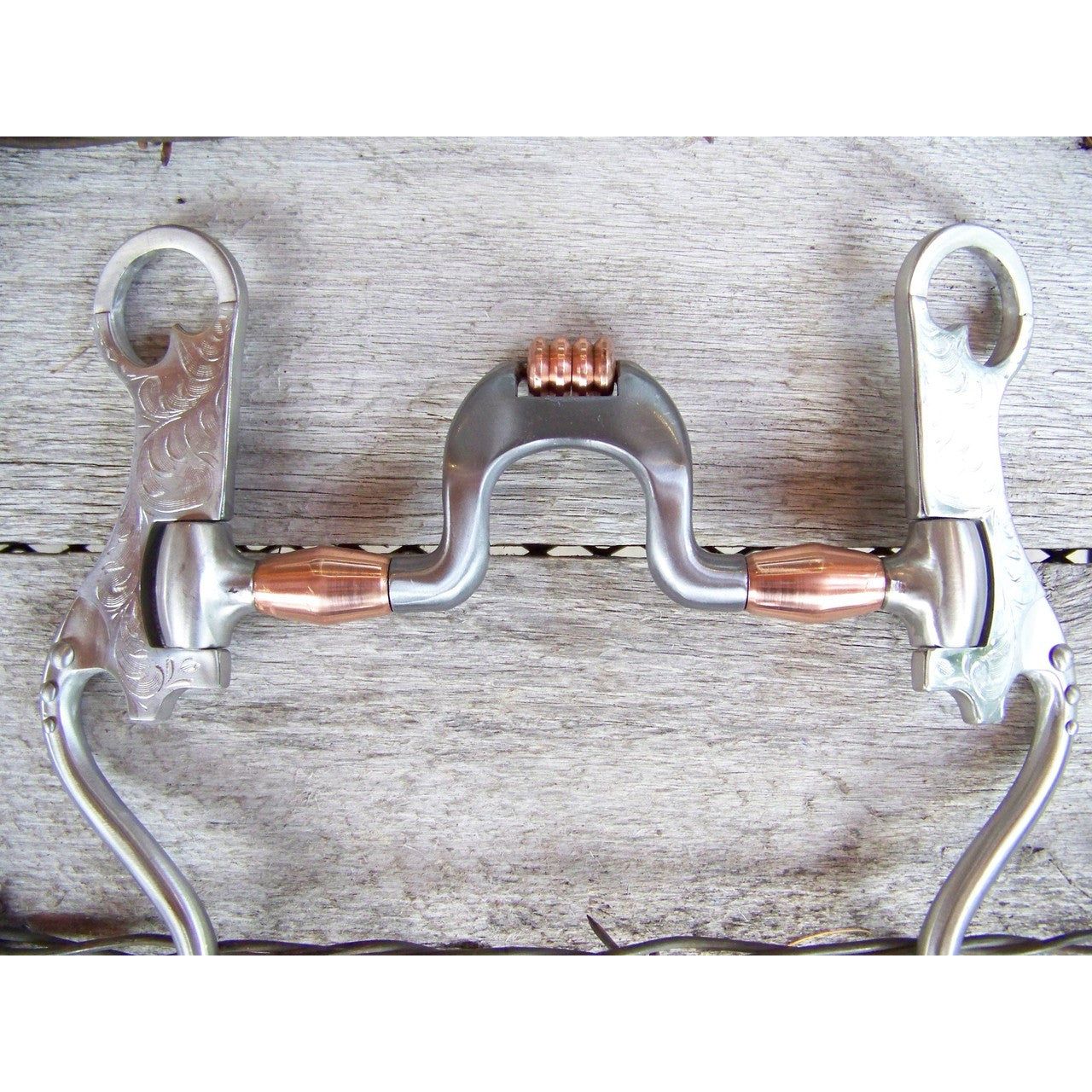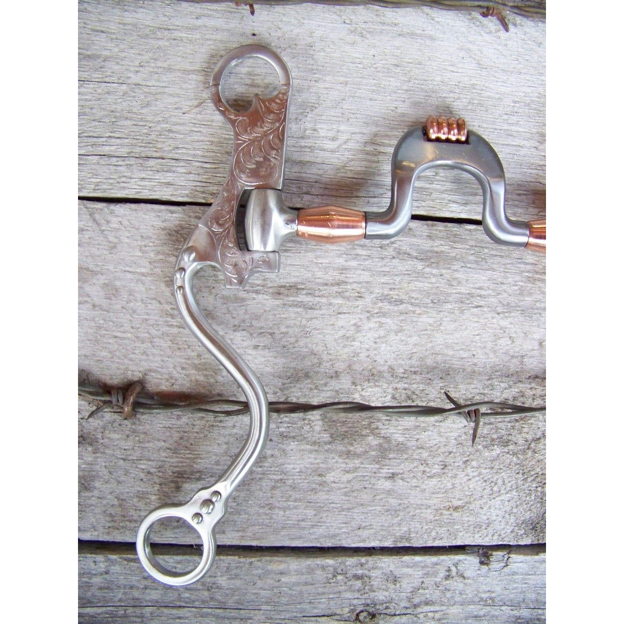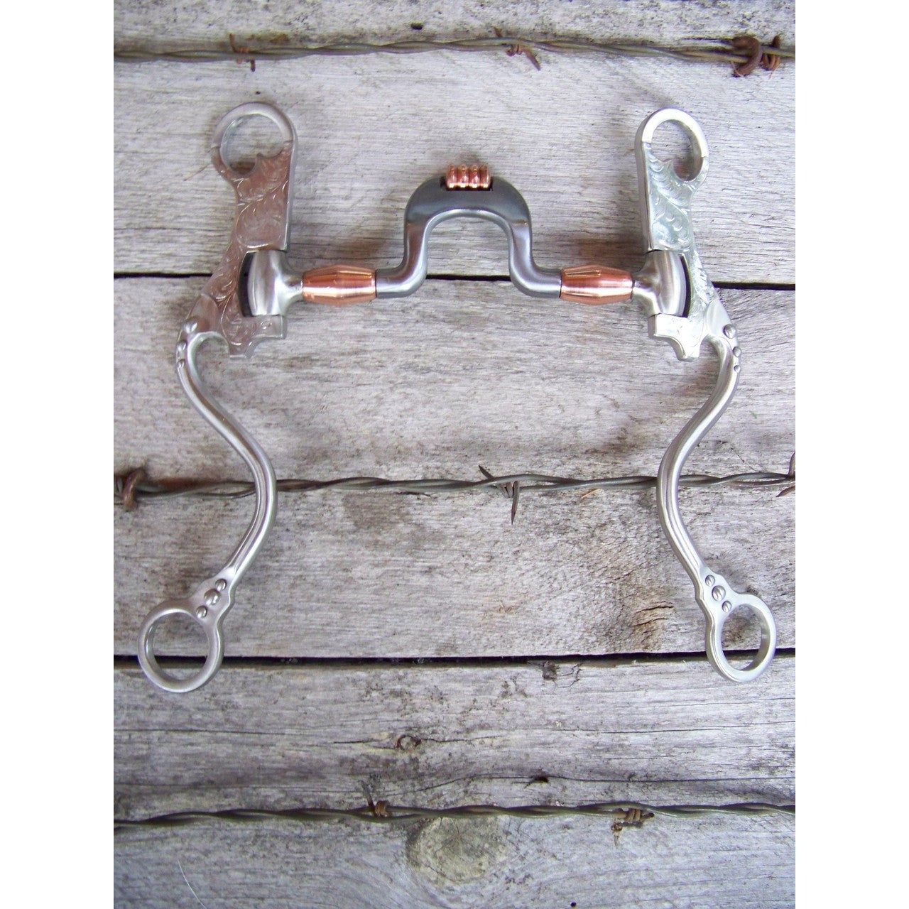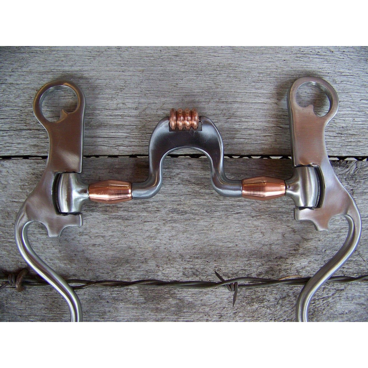 Francois Gauthier stainless steel brushed spoon bit with top rollers. 8 3/4" stainless steel brushed high purchase shank with stainless steel trims deeply engraved and stainless steel dots. 5 1/8" spoon mouthpiece with top rollers and copper barrels. The high purchase shank design allows a better pressure distributionto the poll. The rollersat the top offer a milder and more comfortable port effect. Good for older advanced horses. Provides a moderate to strong effect.
