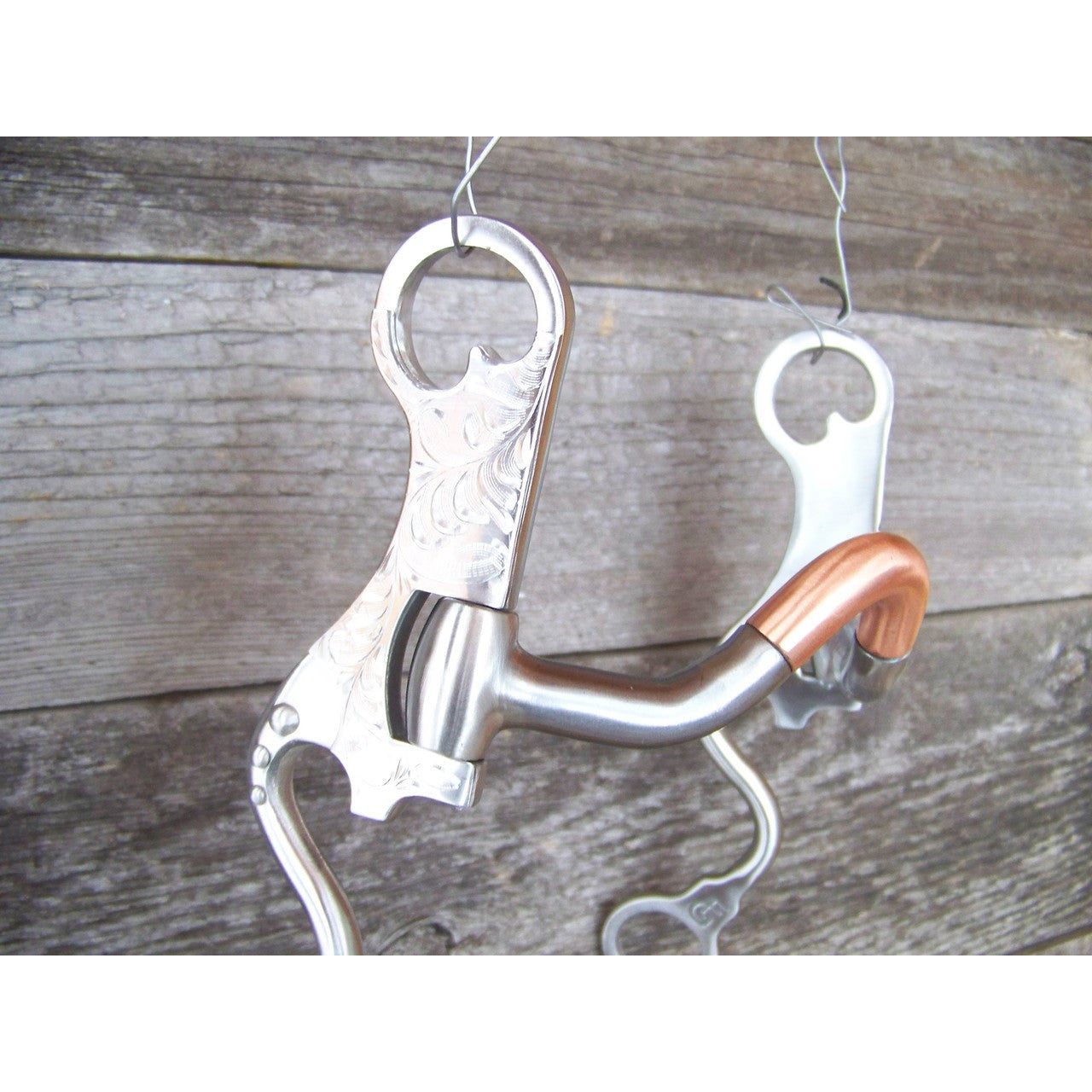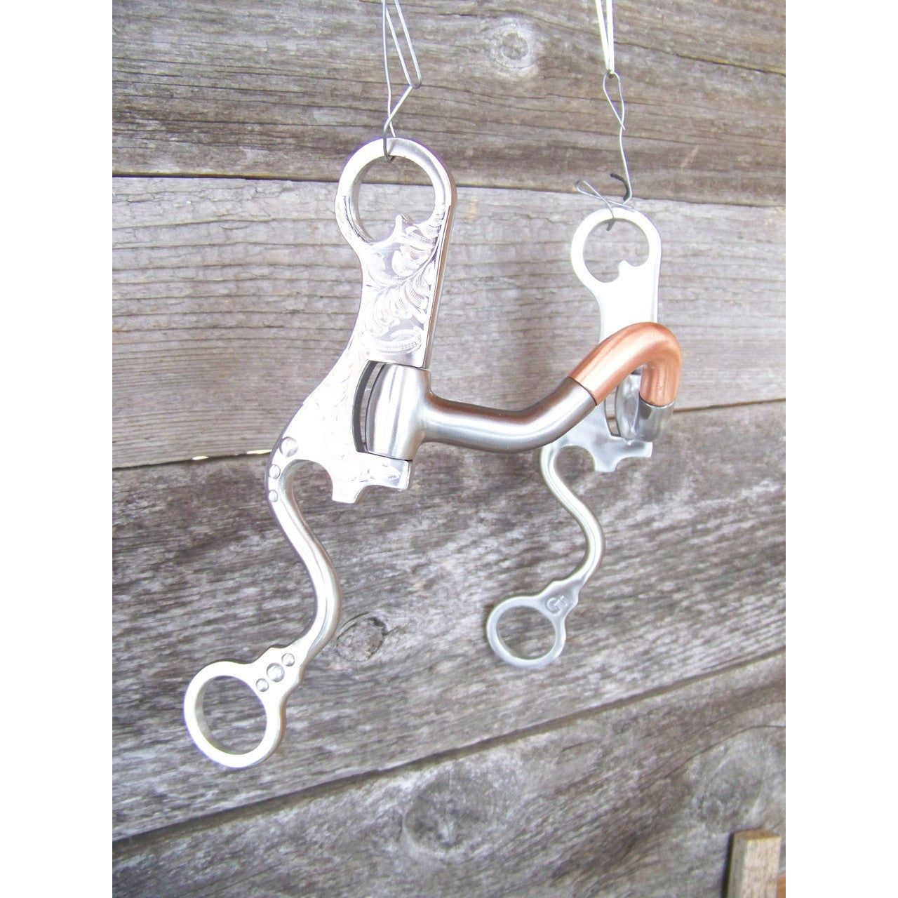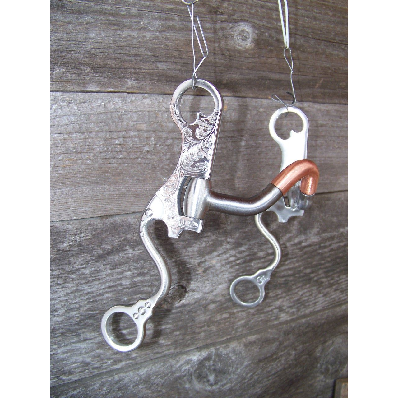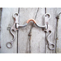 Francois Gauthier Collection - Stainless steel brushed/stainless steel bit. 5 1/8" sweet iron low square port comofrt mouth piece. Copper covered center link with copper inlay son bars. Unique right and left shoulder control. Cheek is 8 7/8" 2-tone stainless steel brushed with stainless steel cheek and stainless steel engraved trim. Heavy bit with good balance.