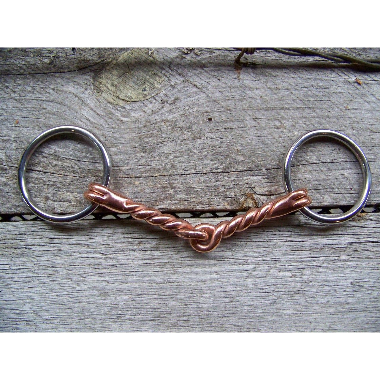 Stainless steel pony ring bit with 3 3/4" copper twisted wire snaffle mouth. 2" diameter stainless steel rings.