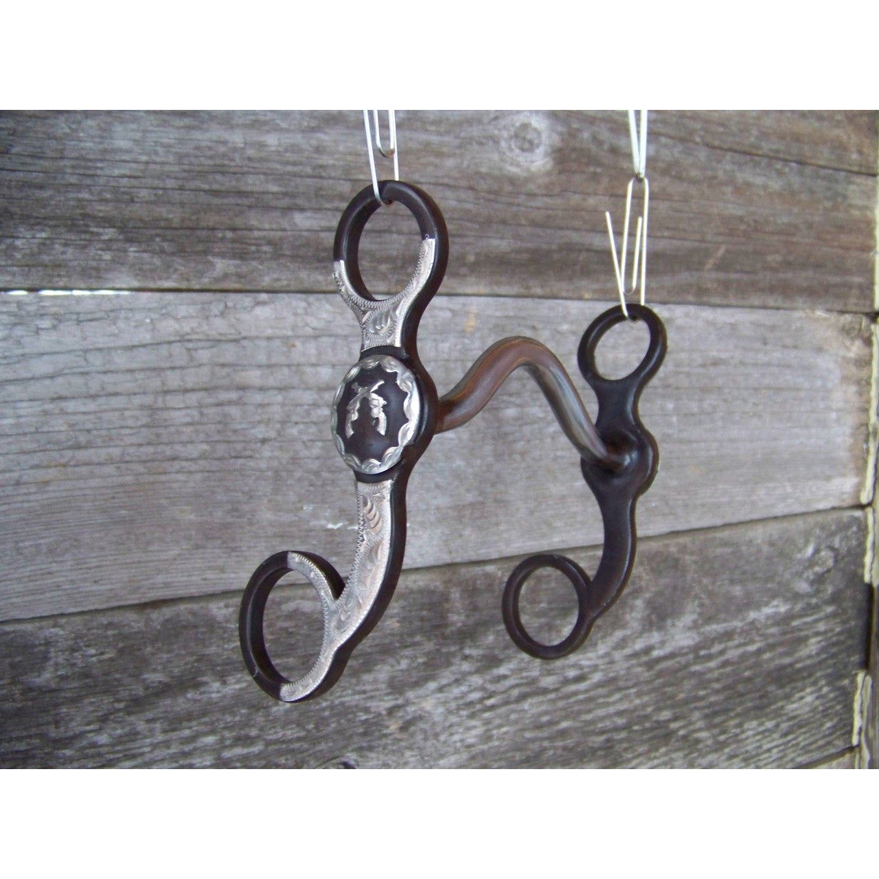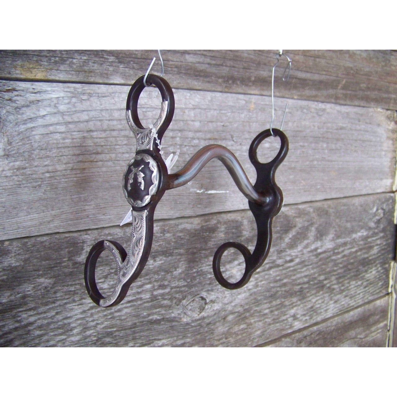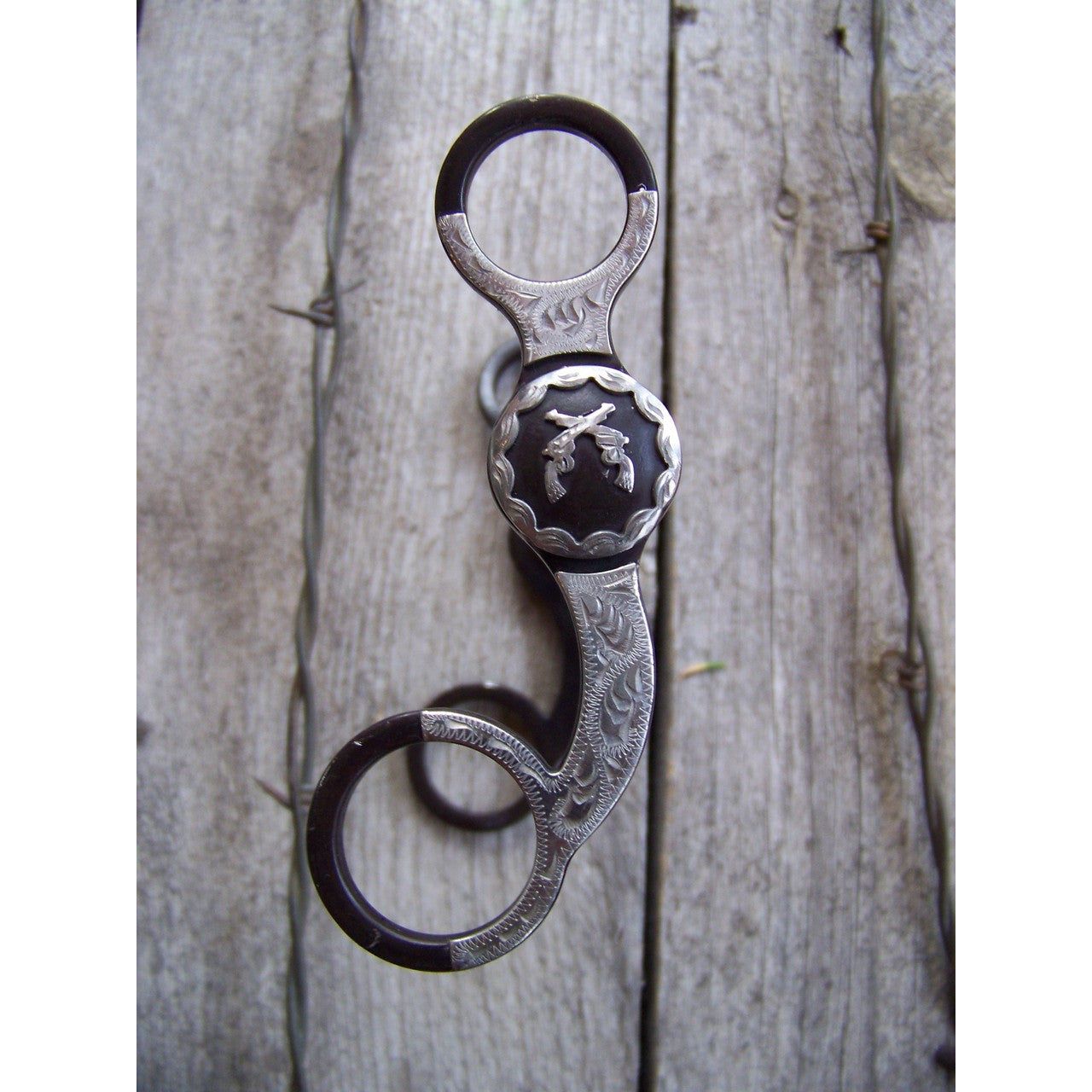 Santa Fe Collectin - Pony Bit with Pistols. 4 1/8" sweet iron low port curved mouthpiece. 4 1/2" cheek with stainless steel hand engraved trim and pistol motif.