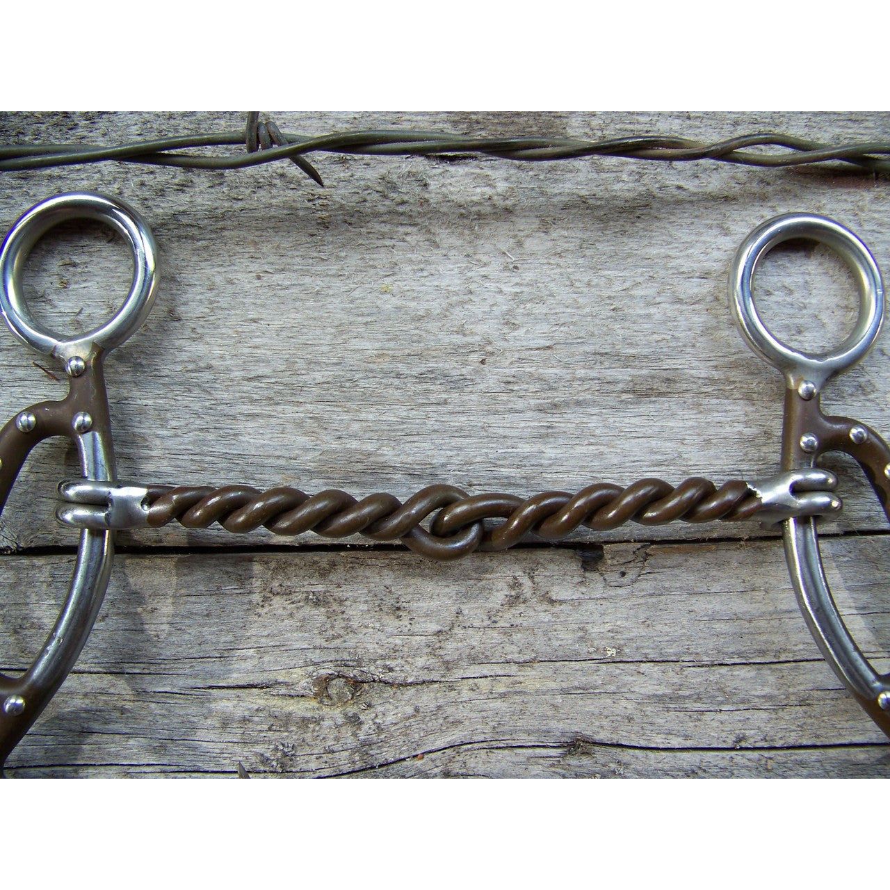 Antique brown sliding gag bit, 5" AB/stainless steel twisted wire snaffle mouth. 5 1/2" cheeks with german silver dots.