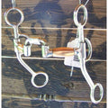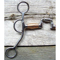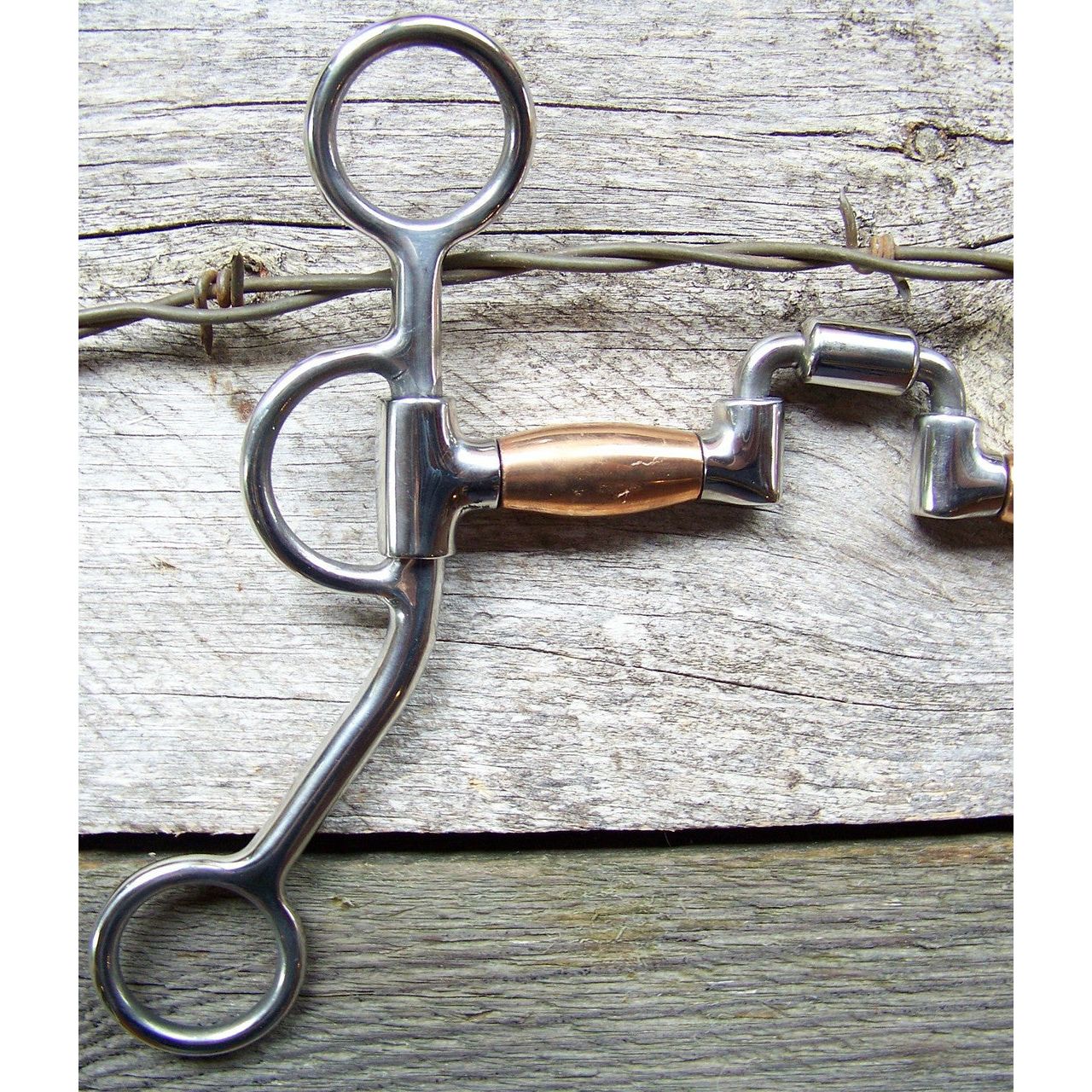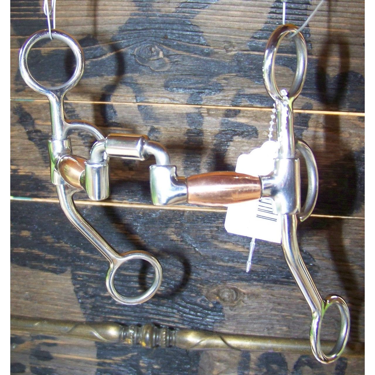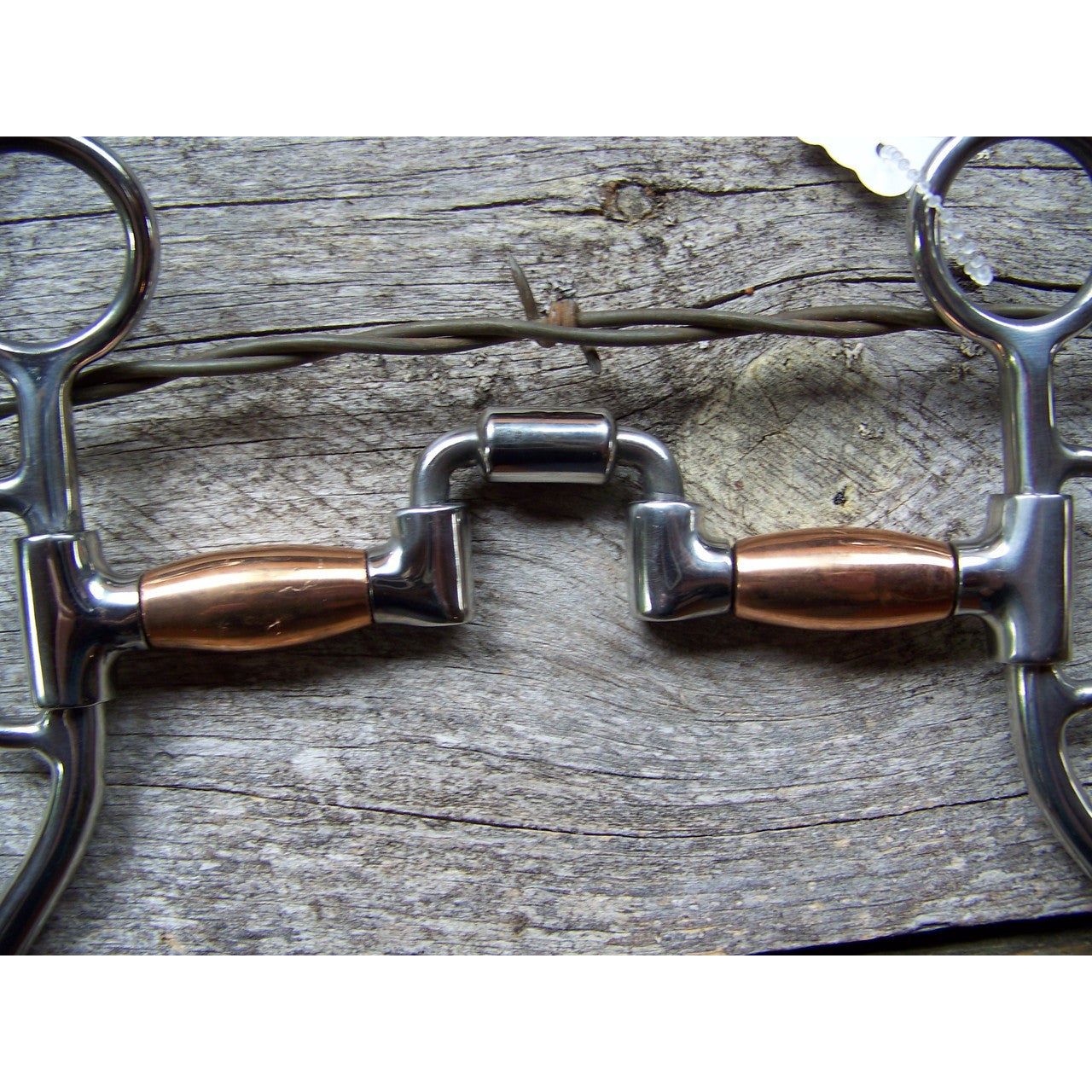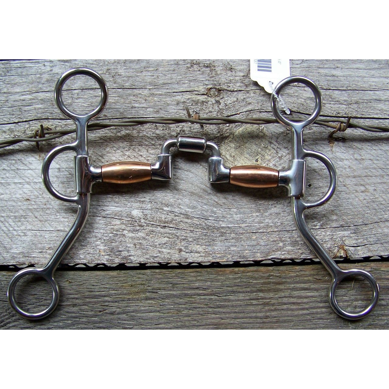 Stainless steel bit with hinge. Mouthpiece is 5 1/8" across. Stainless steel roller on top of articulation. Copper rollers on sides.