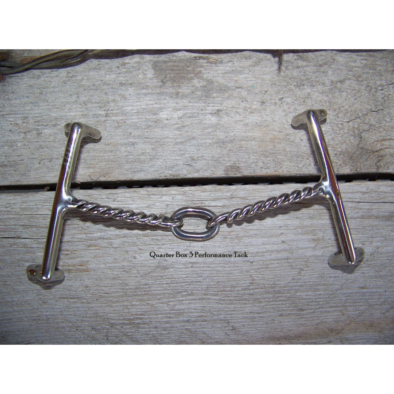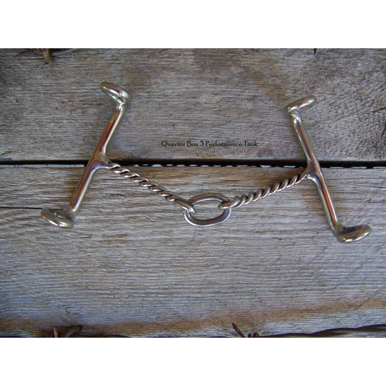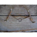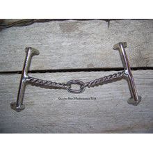 Stainless steel draw gag bit with 5 inch mouth and 3 piece twisted wire snaffle.