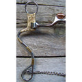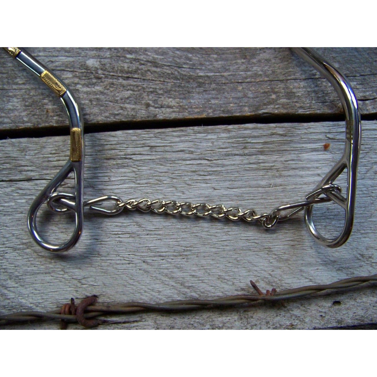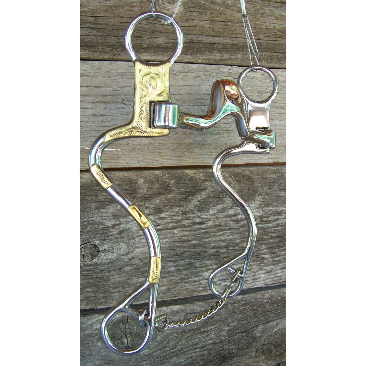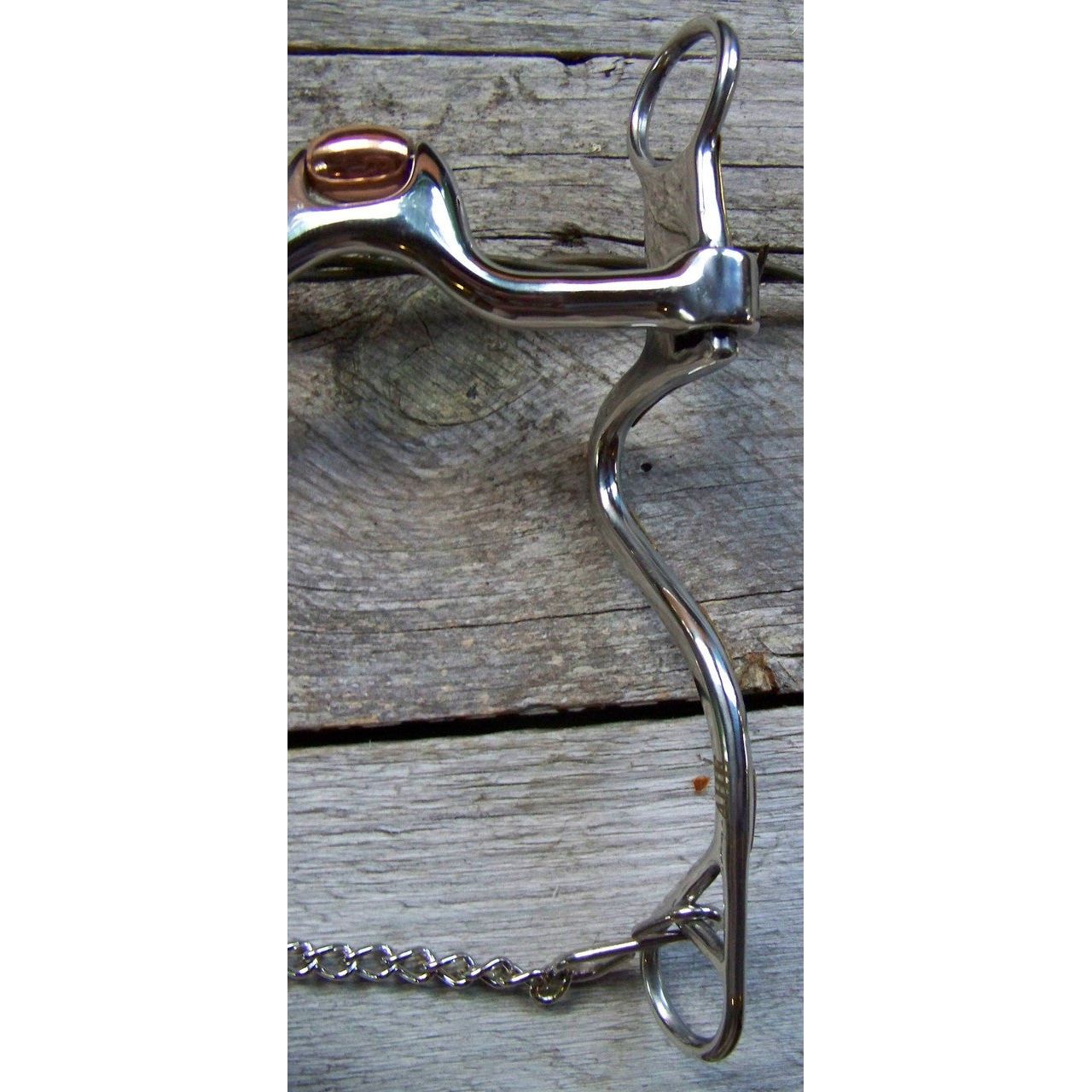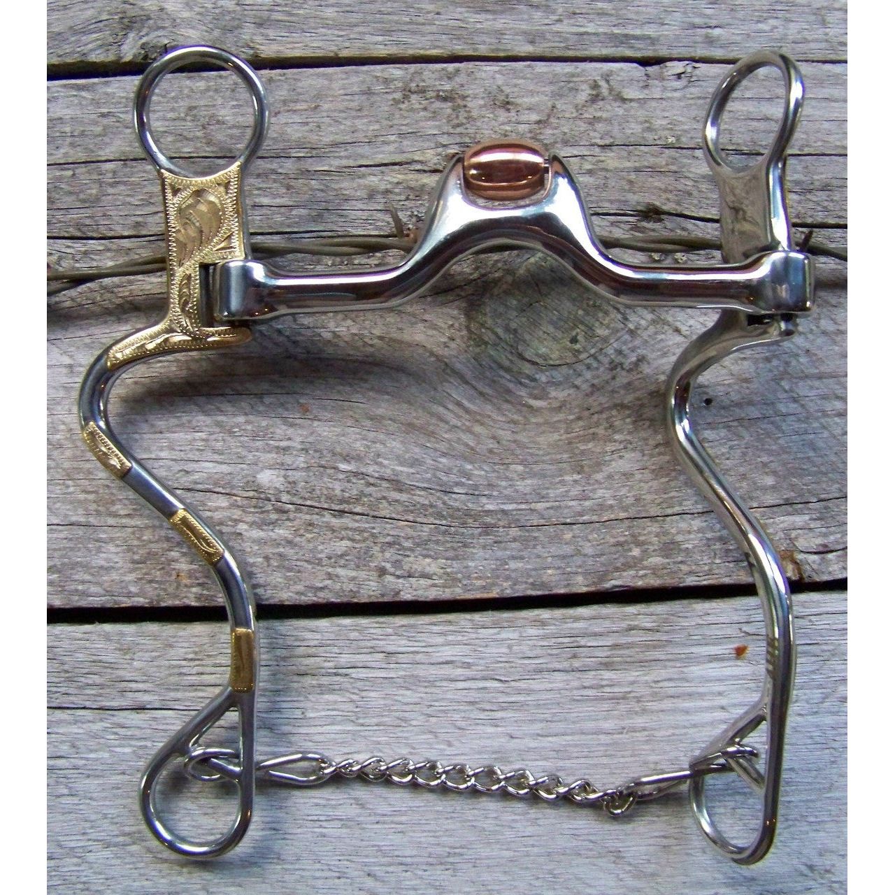 Stainless steel correction bit with 5" medium port mouth and copper roller. Cheeks are 9" with engraved brass tirm. Stainless steel curb chain (bit hobble) and hooks.