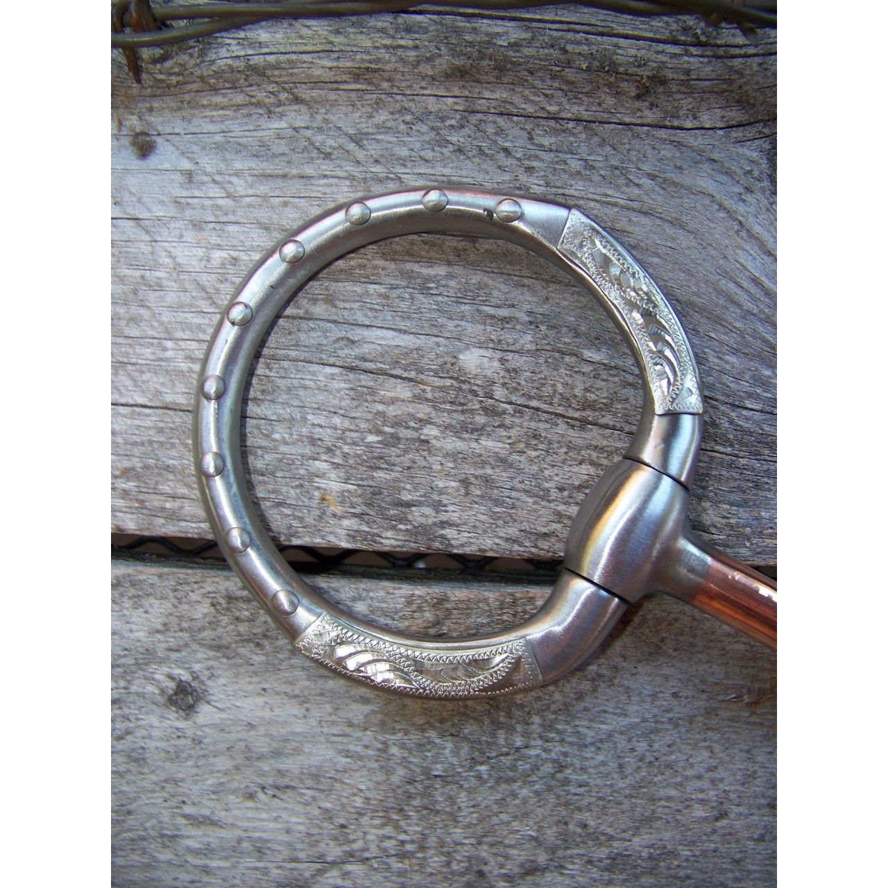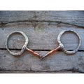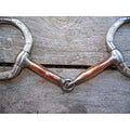 Stainless steel smooth joint show snaffle with 5" copper cover over bars. German silver trim and dots on side.