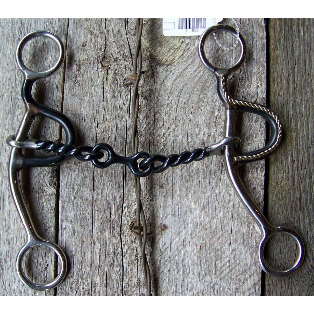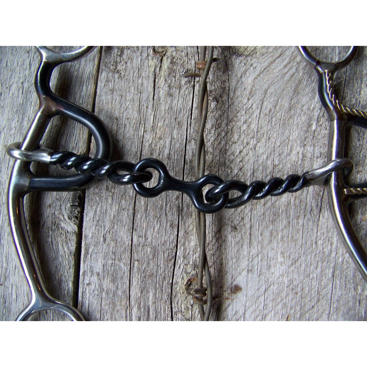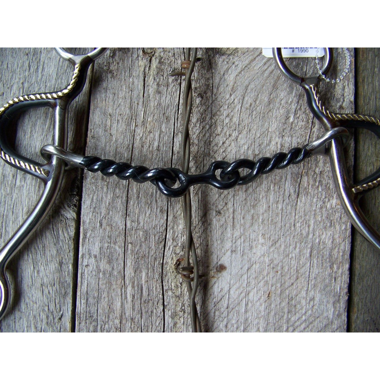 Stainless steel bit, 7 1/4" long shank. German silver rope edge adorn the shank. 5 1/2" twisted sweet iron dogbone mouth. 5/16" diameter.