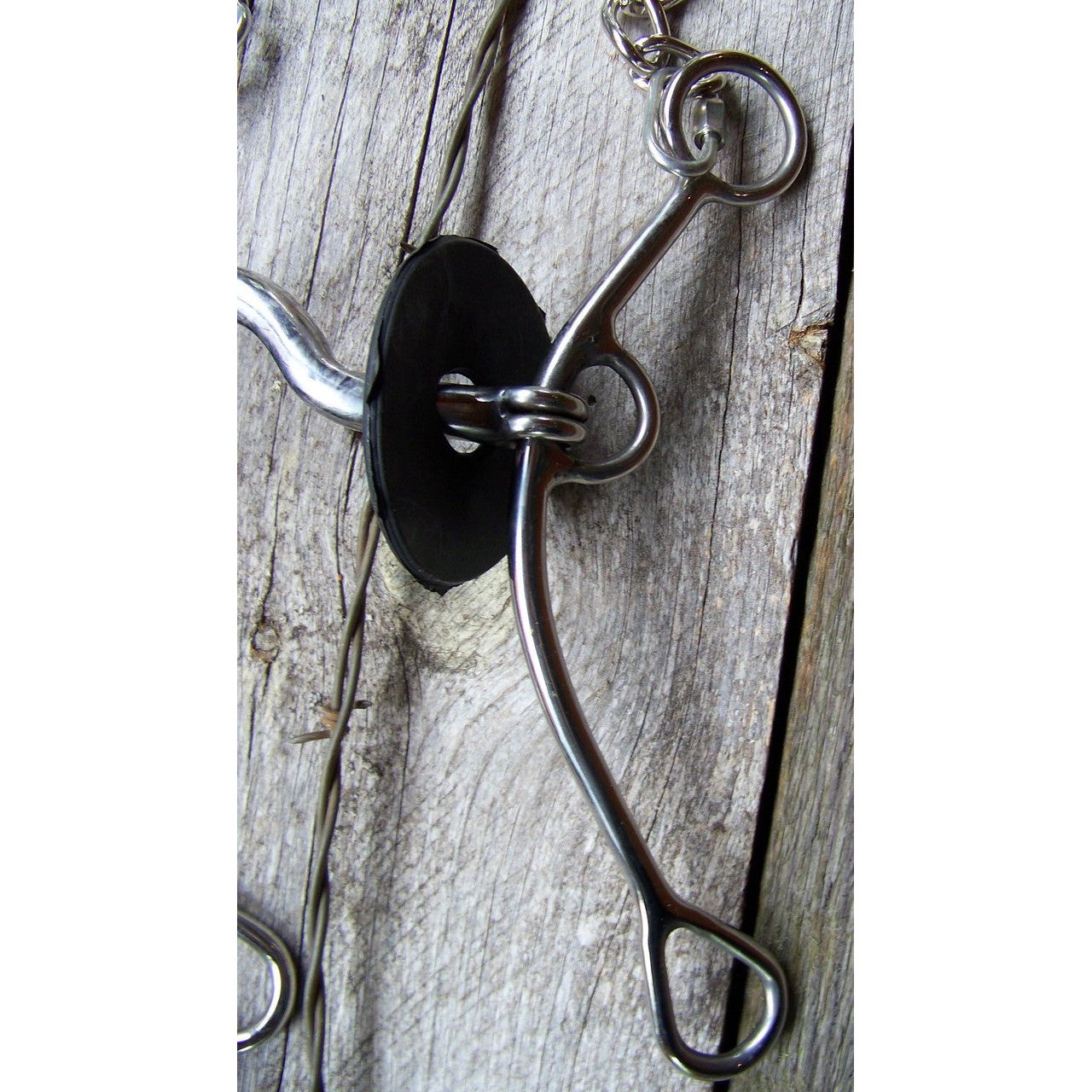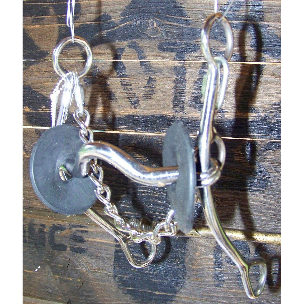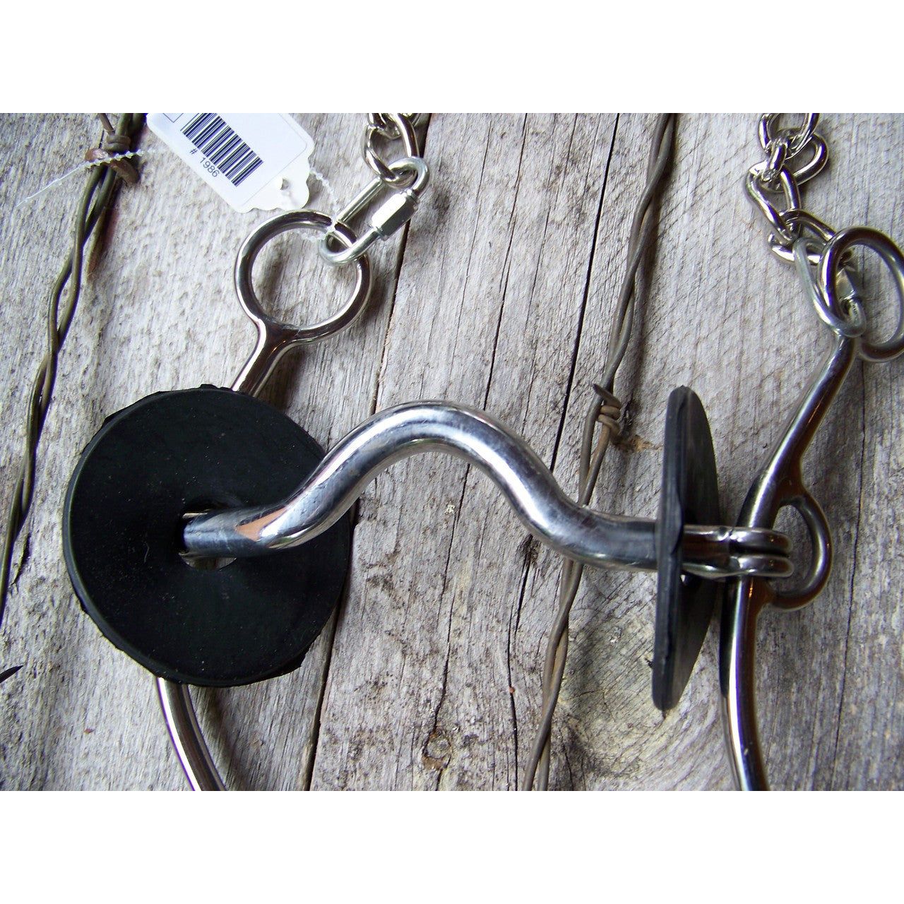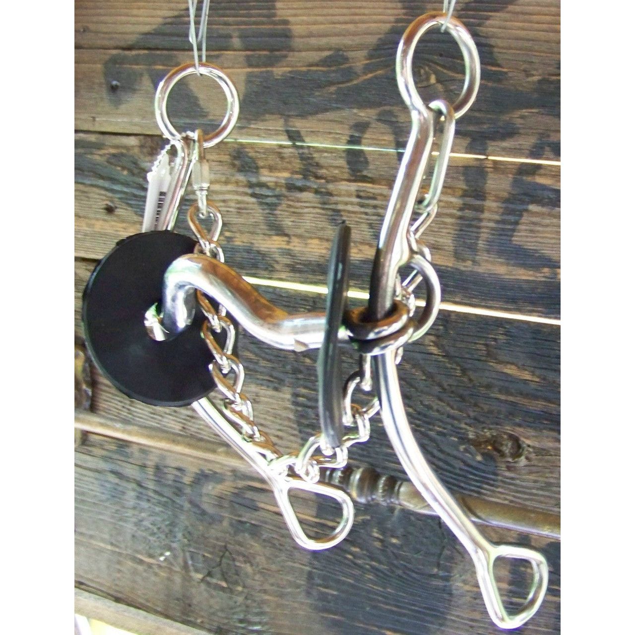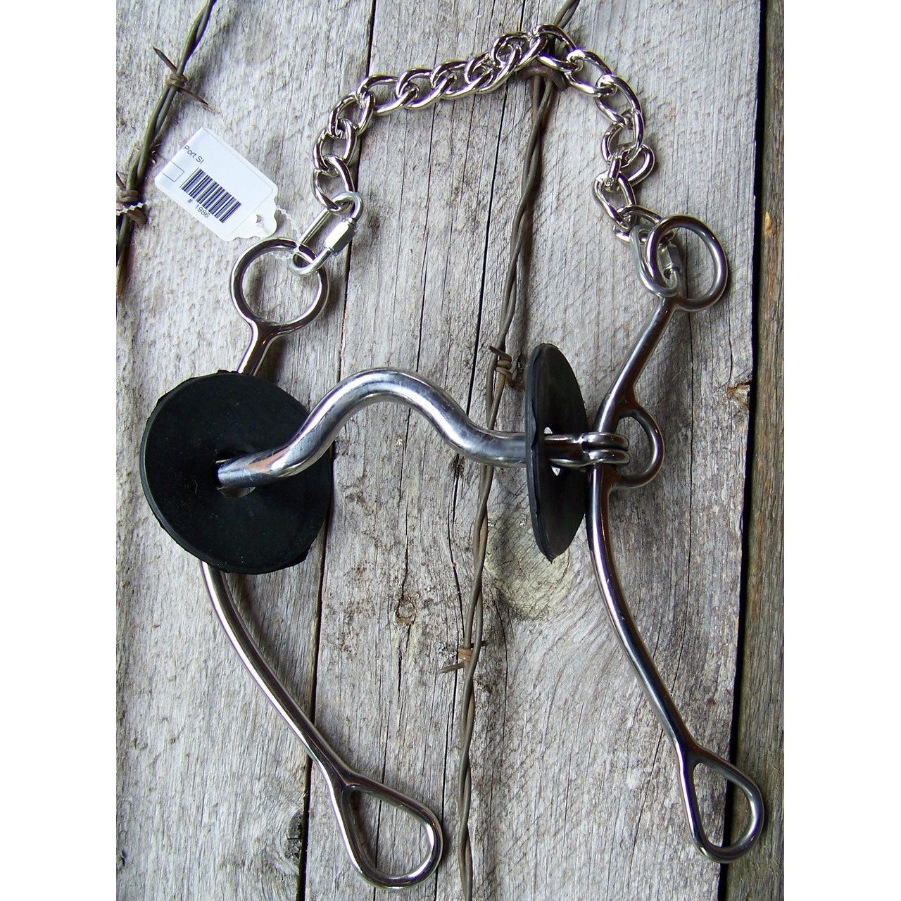 Stainless steel training bit with gag action features a 5" medium port sweet iron mouth. Has rubber bit guards and curb chain.