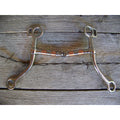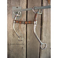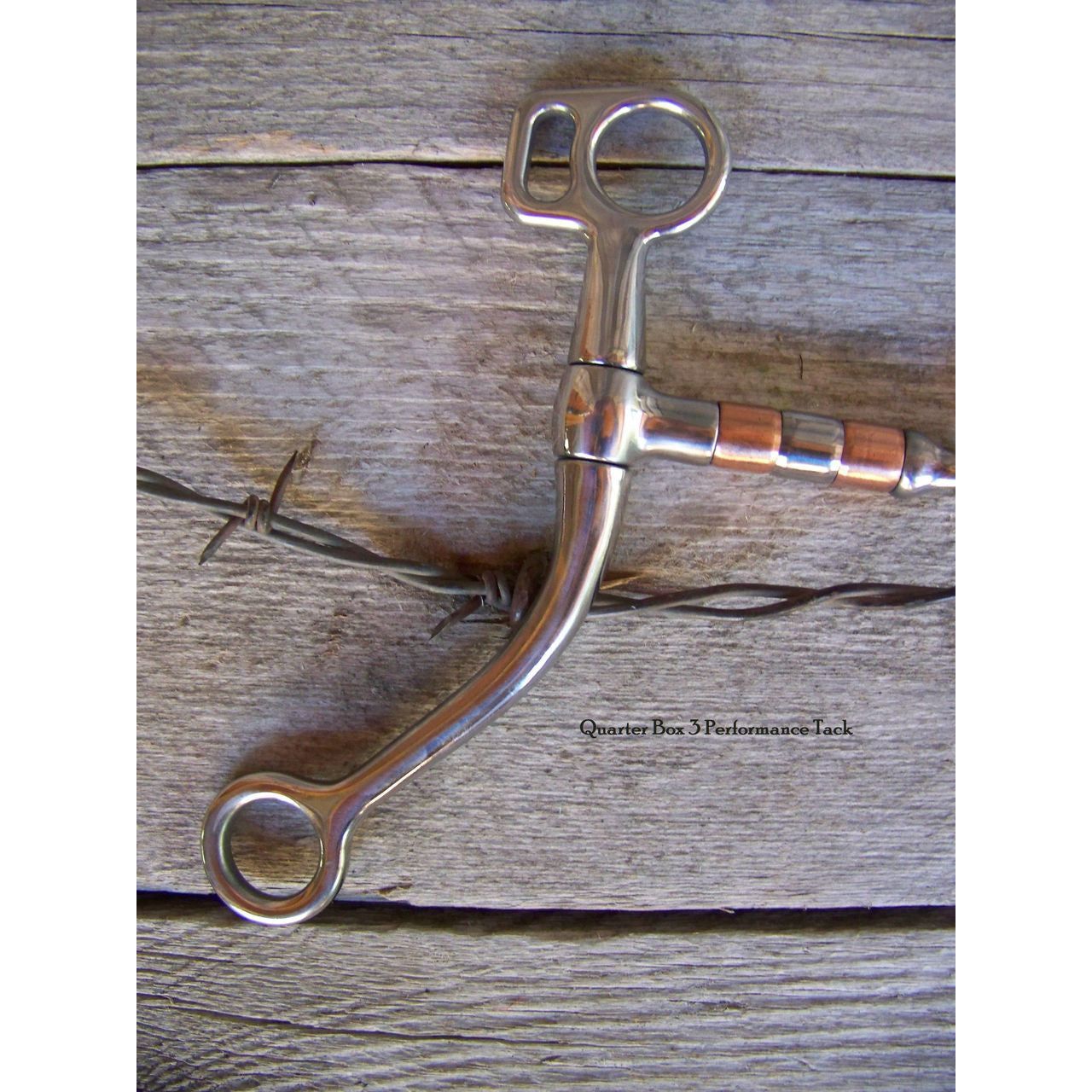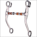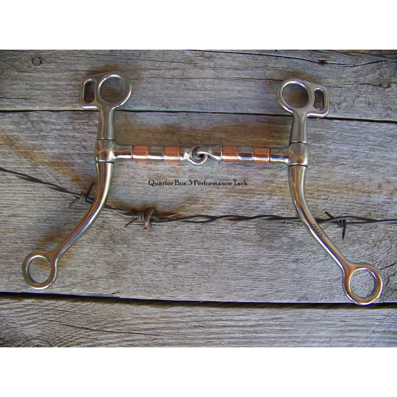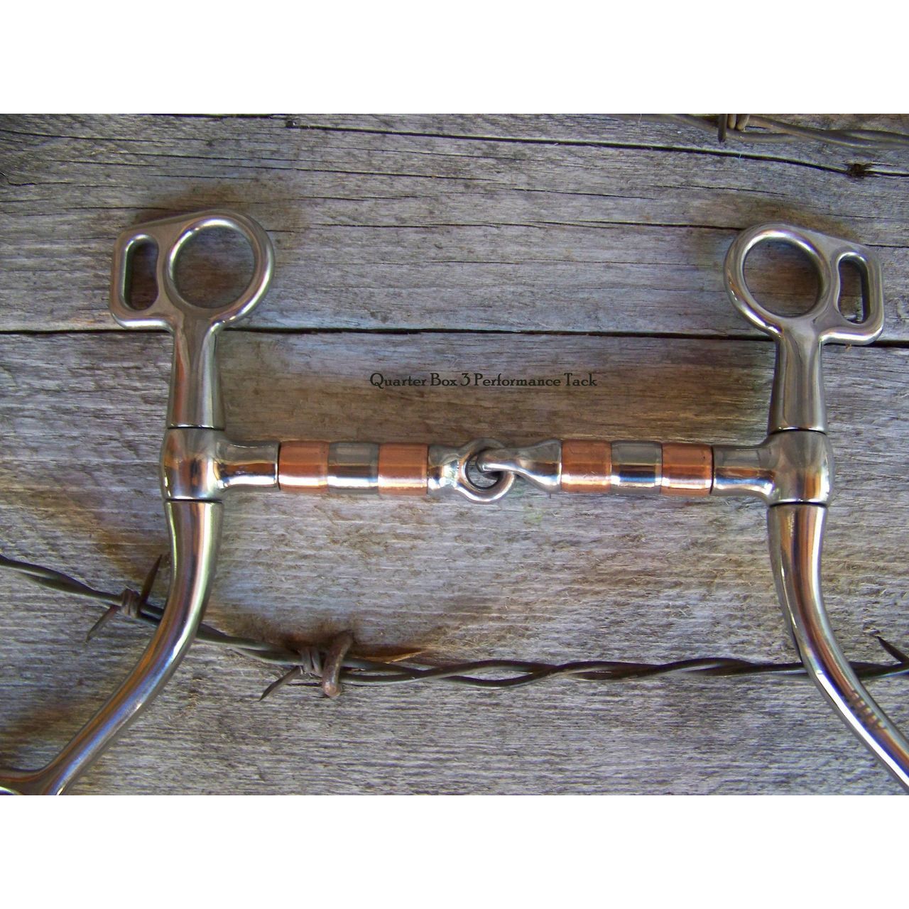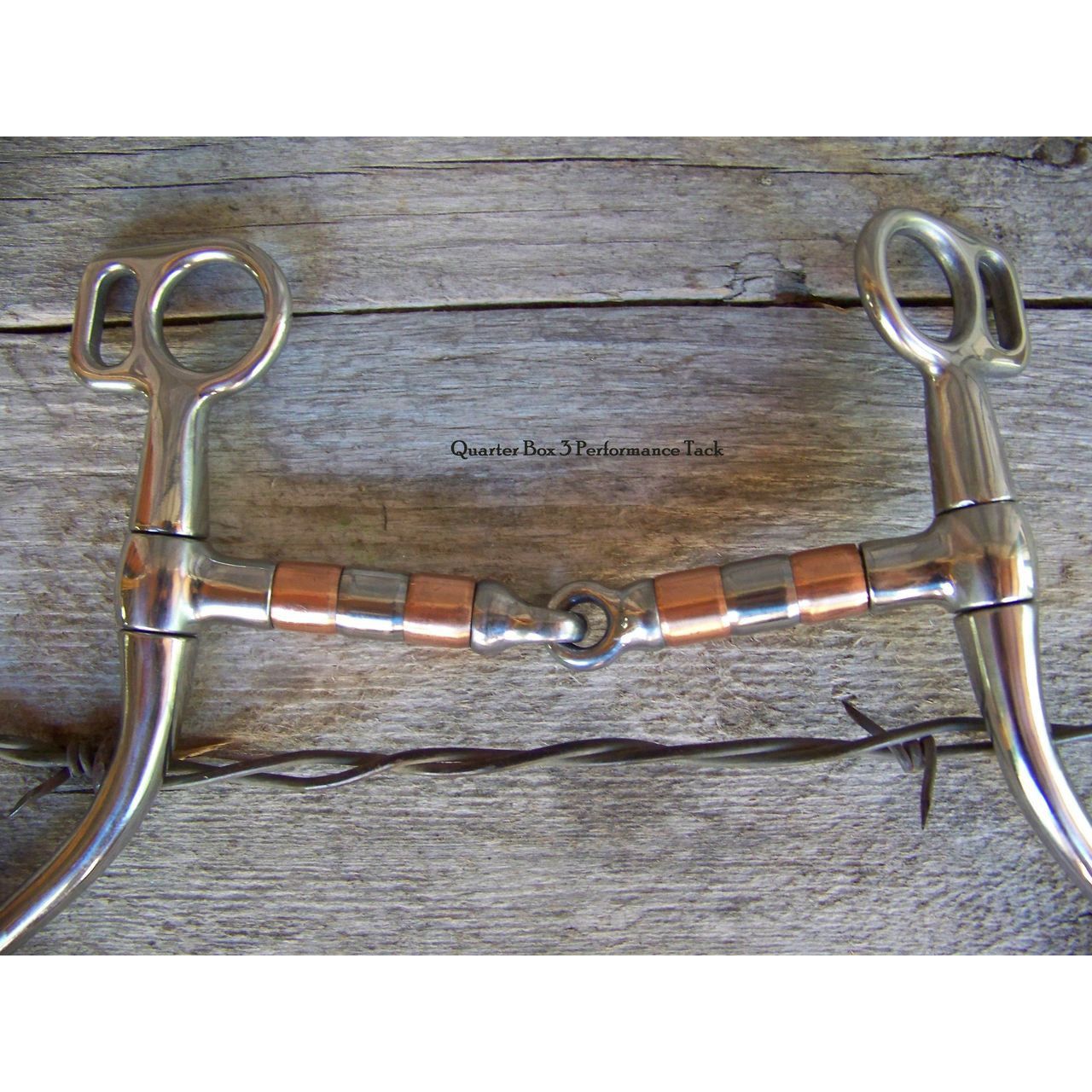 Stainless steel training bit with 5" snaffle mouth. Mouth piece has alternating copper rollers (4 in total) and stainless steel rollers (2 in total). Cheeks are 7".