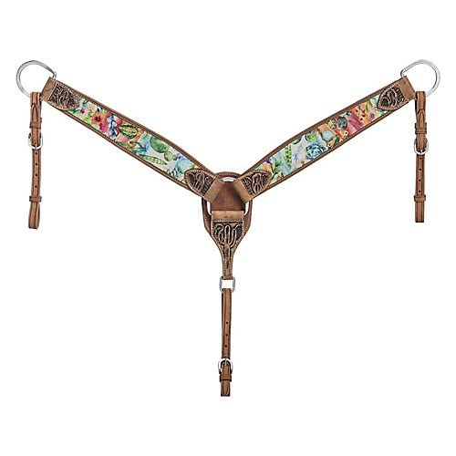 Made of premium leather, this wide tapered breastcollar hugs the shoulder to prevent saddle slip. It is designed with a unique and colorful cactus print overlay that will have your horse looking sharp! Finished with cactus-themed tooling and stainless steel hardware.