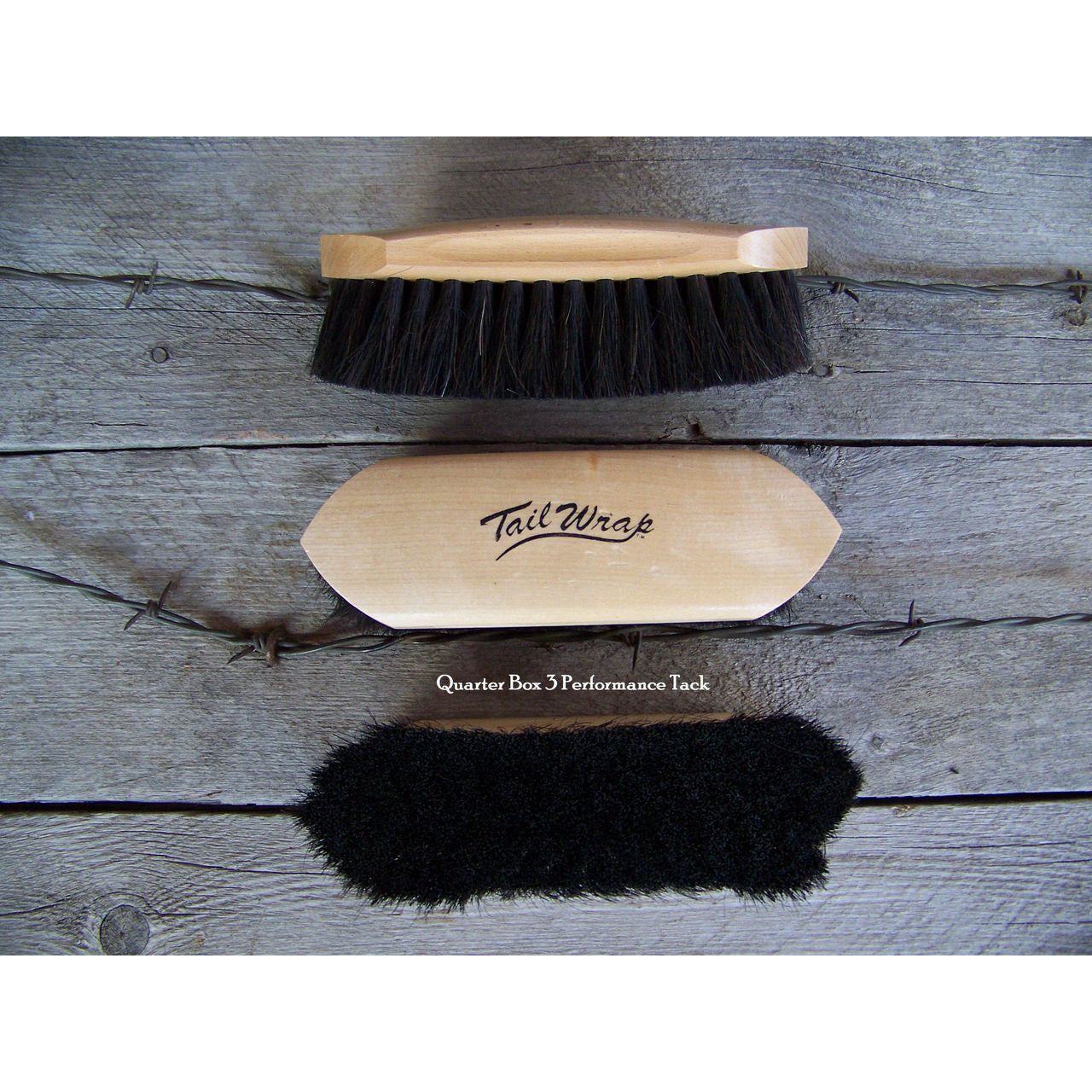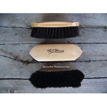 TailWrap - A 70:30- mix of smooth black polyporpylene fiber & premium horse hair on a curved back hardwood block. Stiffer poly fiber stimulates hair follicles while the softer horse hair leaves a healthy, glossy coat. Little Jack measures 7.5" x 2.25".
