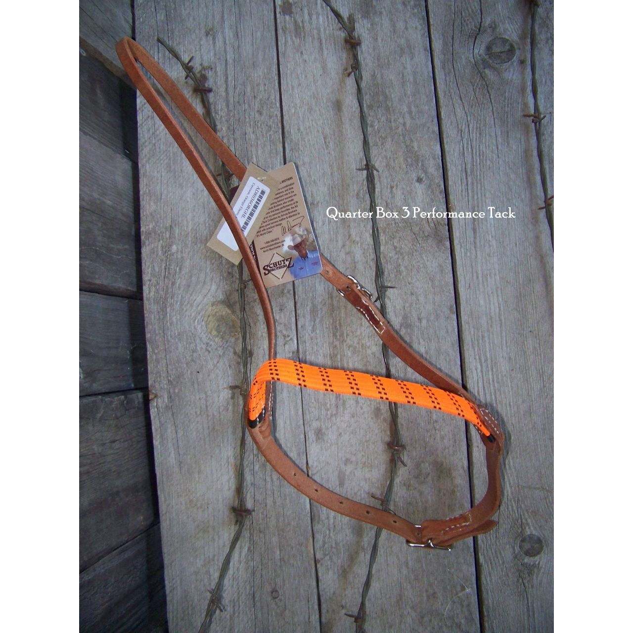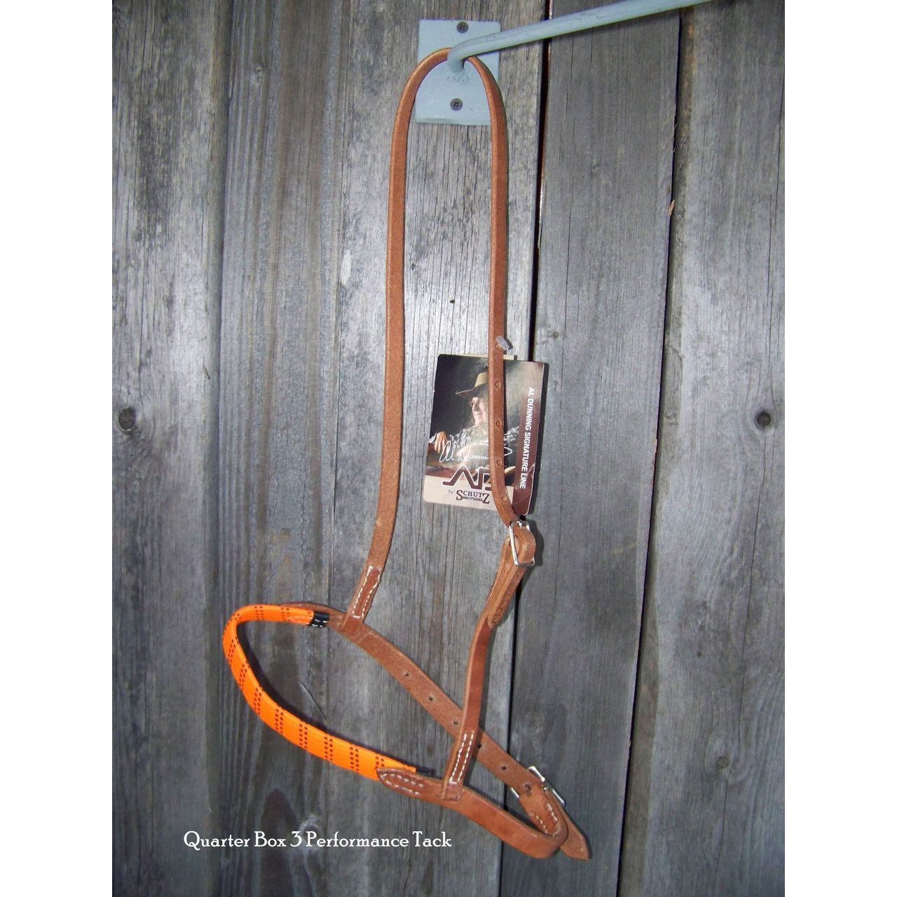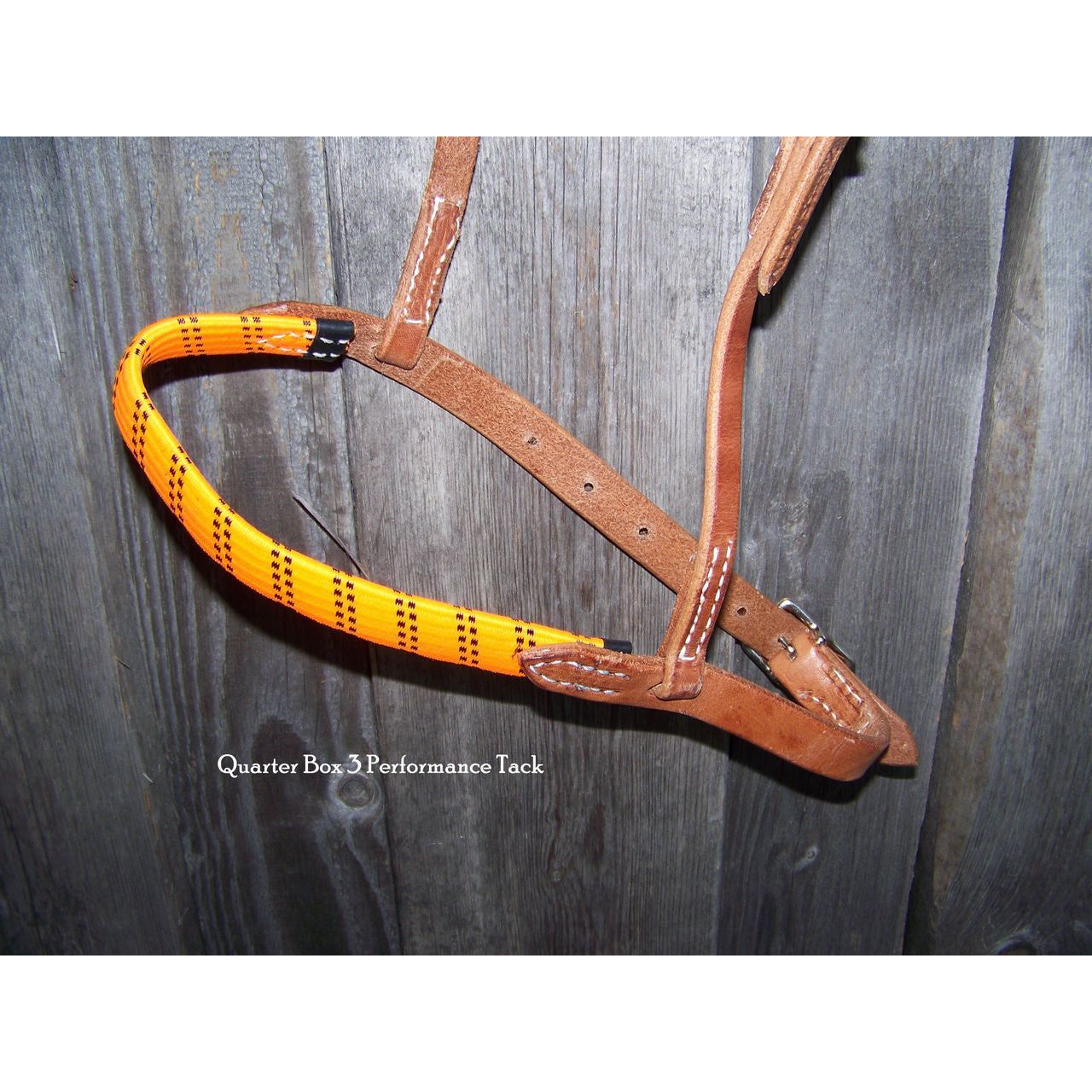 Premium harness leather caveson with polyester coated rubber nose for optimum, durable stretch. 1/2" wide headstrap with nickel buckle. Colors in Orange, Black, Purple, and Green. Each color listed separately. This is for the orange.